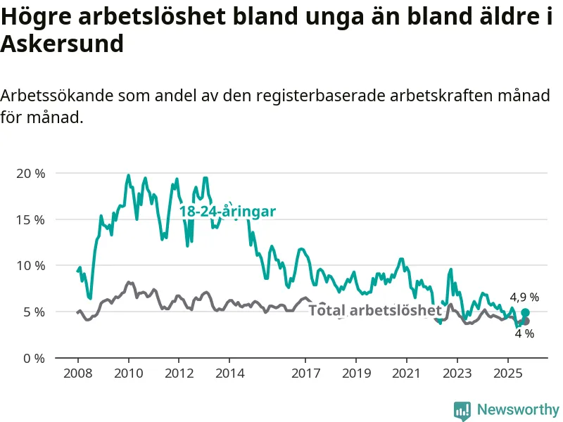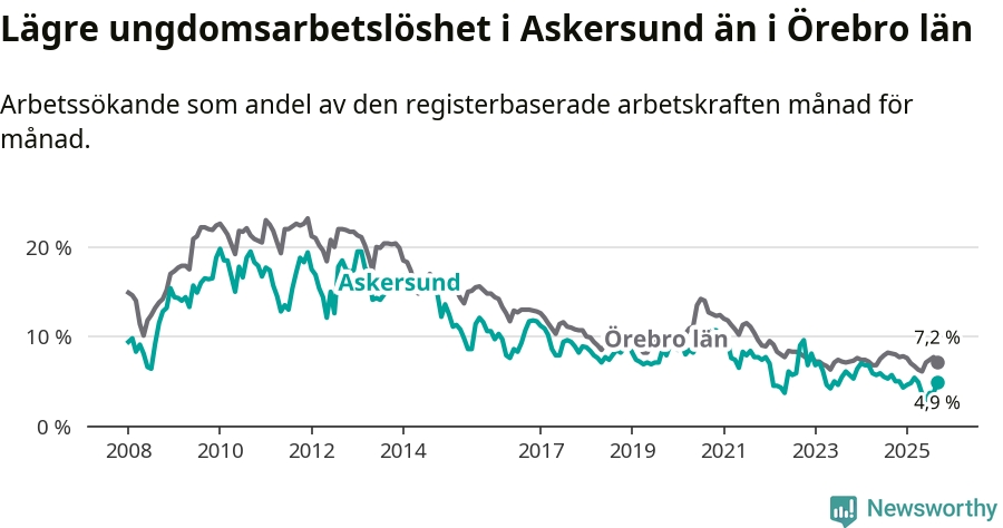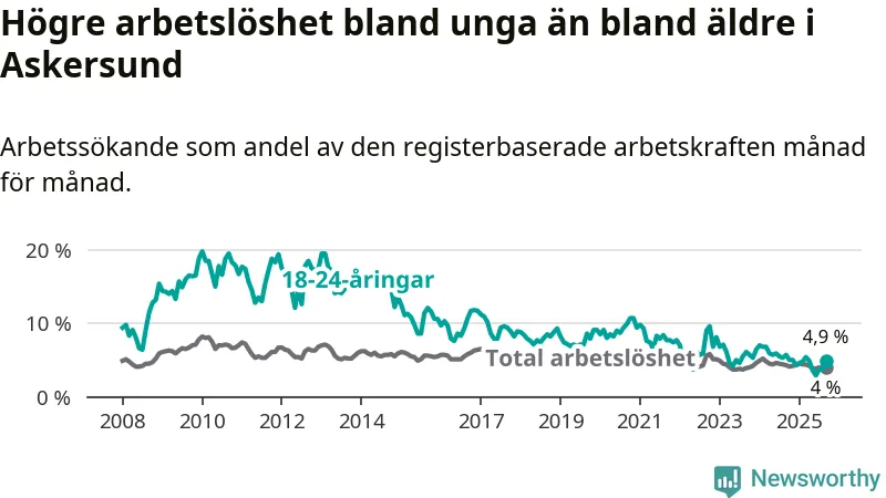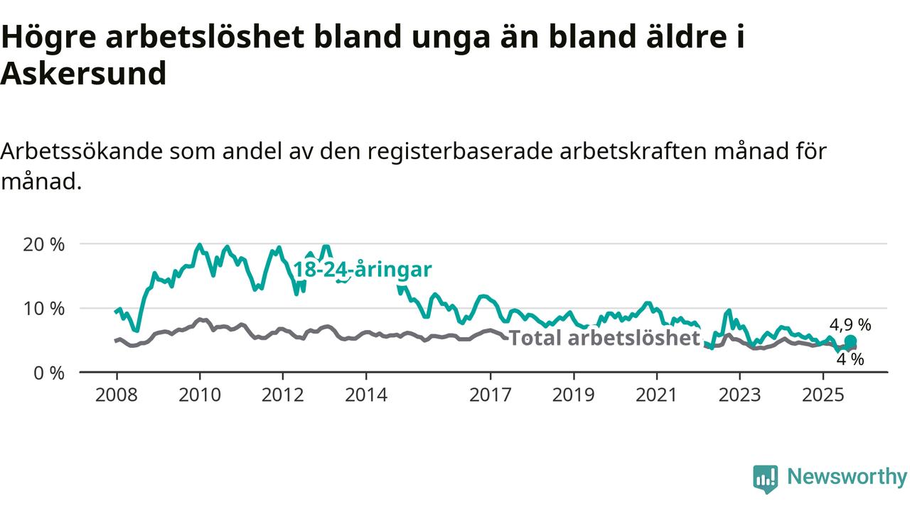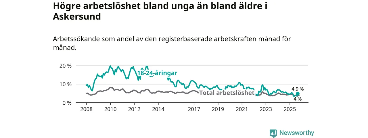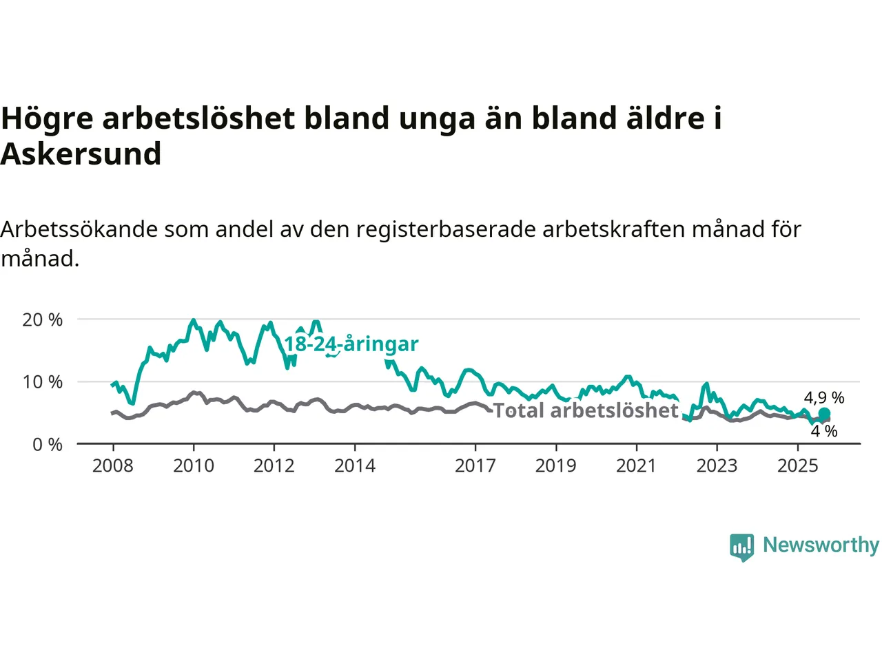 I och med den senaste månadens nedgång har de ungas arbetslöshet i Askersund sjunkit 14 månader i följd (ner från 5,5 procent i juli 2024 till 4,9 procent nu).
