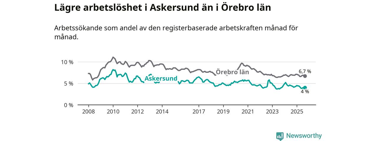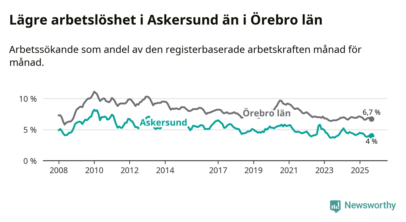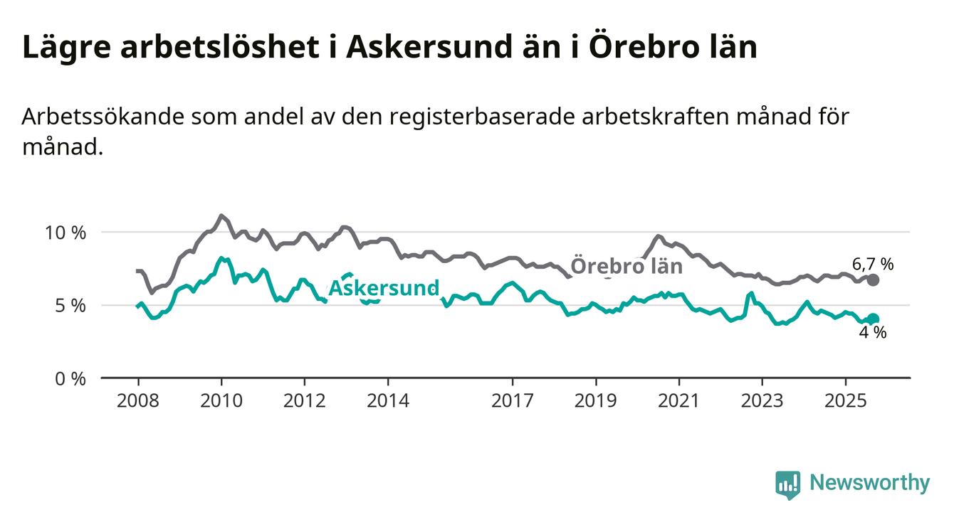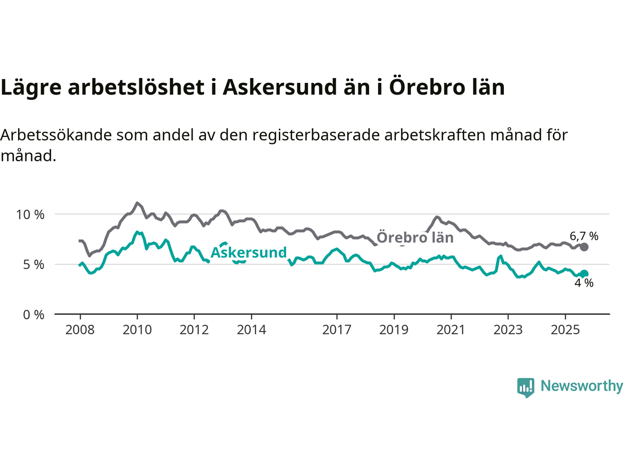 Askersund hade redan tidigare lägre arbetslöshet än snittet i hela Örebro län och nu växer klyftan (4,0 procent i kommunen, jämfört med 6,7 procent i hela länet). Askersund har därmed även den lägsta arbetslöshetsnivån i länet. Örebro har den högsta (7,7 procent).