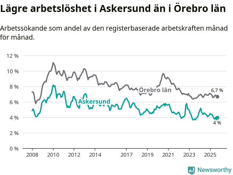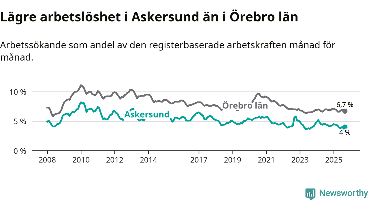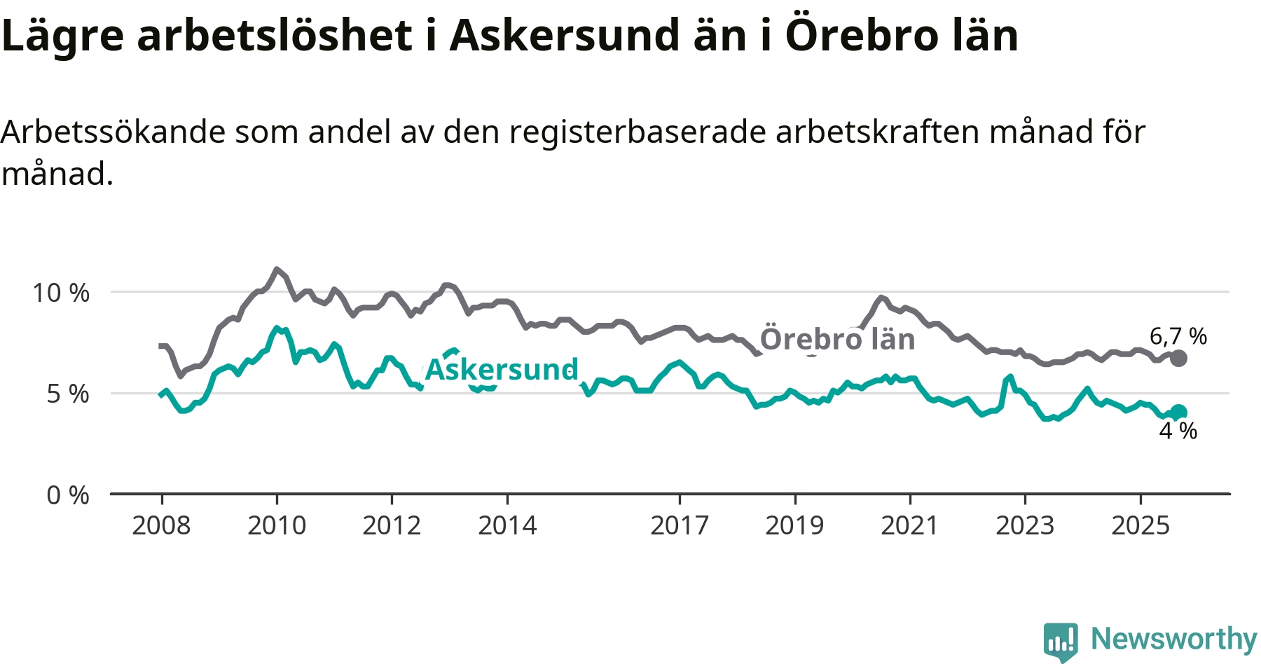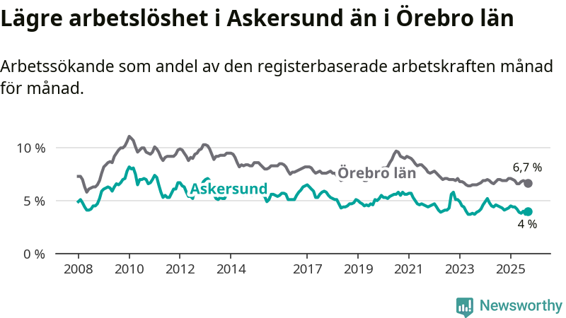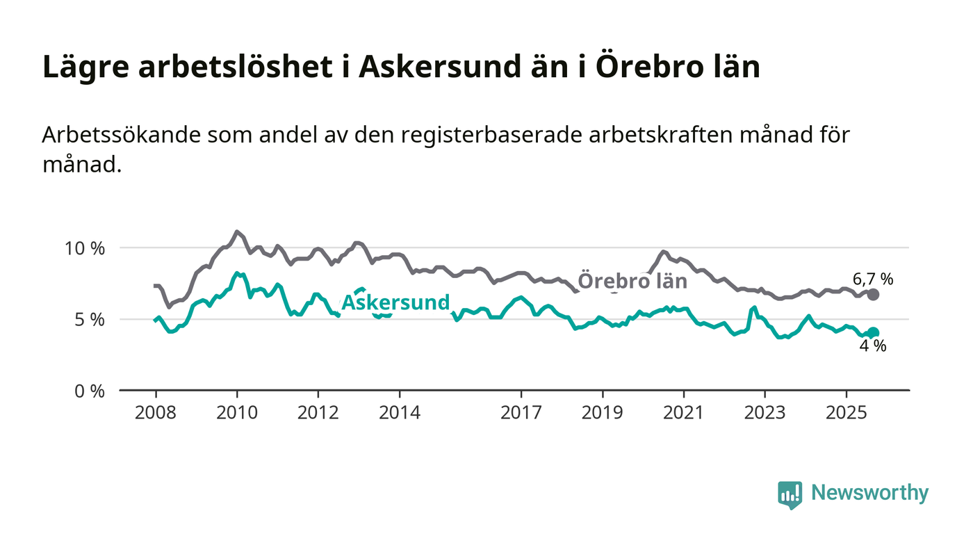 Askersund hade redan tidigare lägre arbetslöshet än snittet i hela Örebro län och nu växer klyftan (4,0 procent i kommunen, jämfört med 6,7 procent i hela länet). Askersund har därmed även den lägsta arbetslöshetsnivån i länet. Örebro har den högsta (7,7 procent).