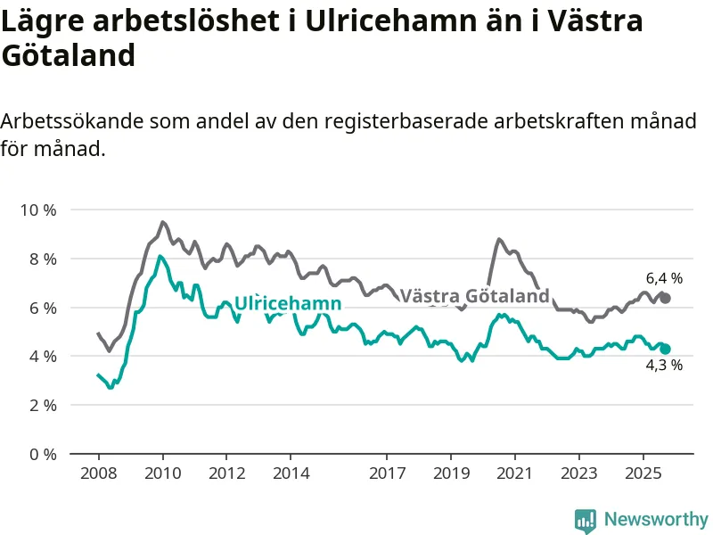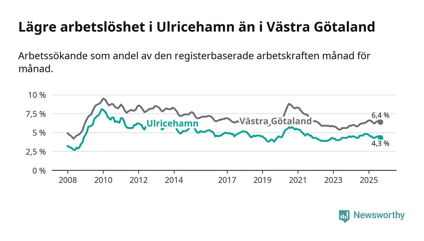 Under september månad rapporterade Ulricehamns kommun en total arbetslöshet på 4,3 procent. Det är en minskning jämfört med samma tidpunkt i fjol (−0,3 procentenheter). I Västra Götalands län däremot stiger arbetslösheten .
