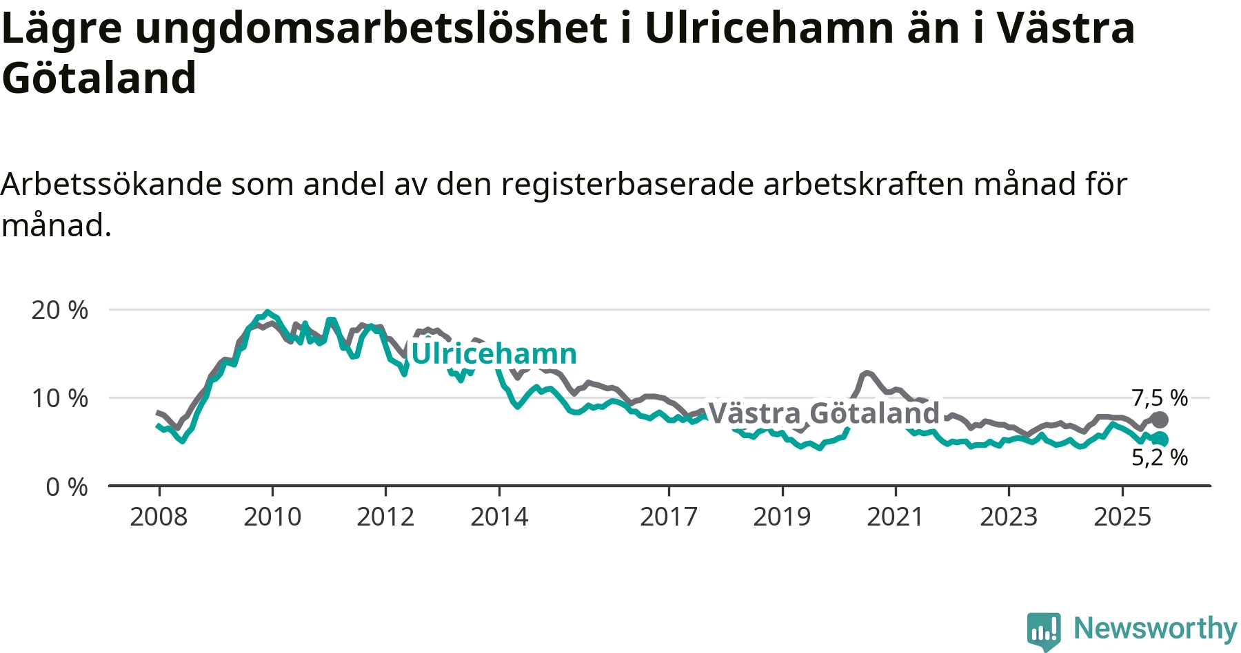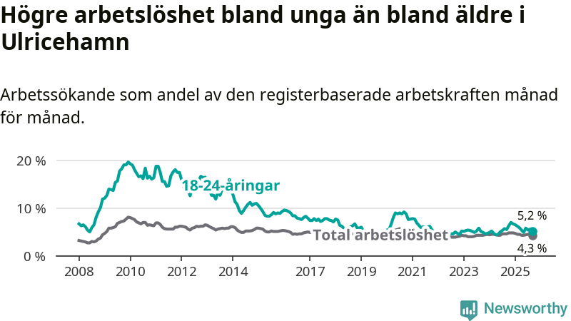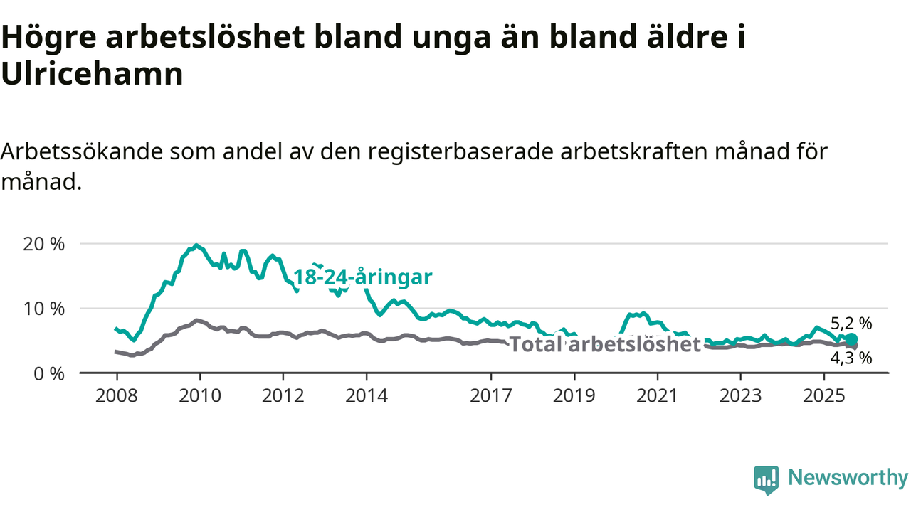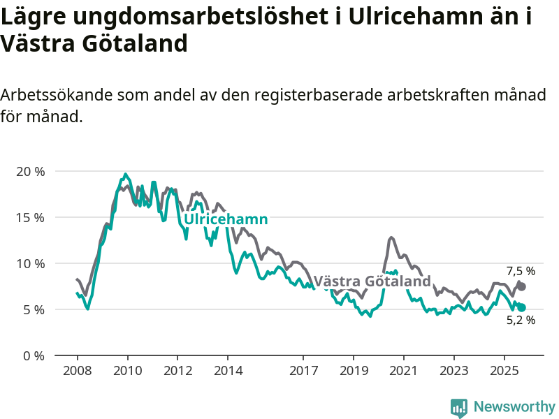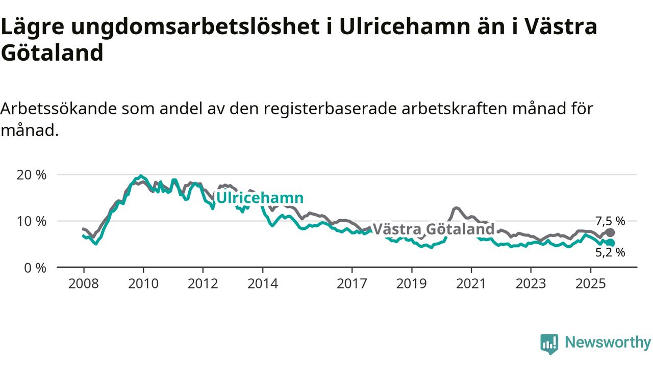 Precis som den totala arbetslösheten ligger ungdomsarbetslösheten i Ulricehamn lägre än i Västra Götaland som helhet. Skillnaden mellan kommunen och länet är 2,3 procentenheter.