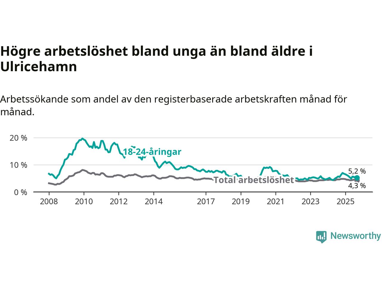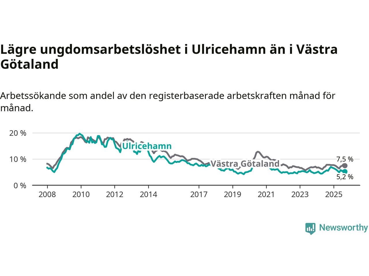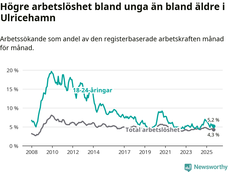 Precis som den totala arbetslösheten ligger ungdomsarbetslösheten i Ulricehamn lägre än i Västra Götaland som helhet. Skillnaden mellan kommunen och länet är 2,3 procentenheter.