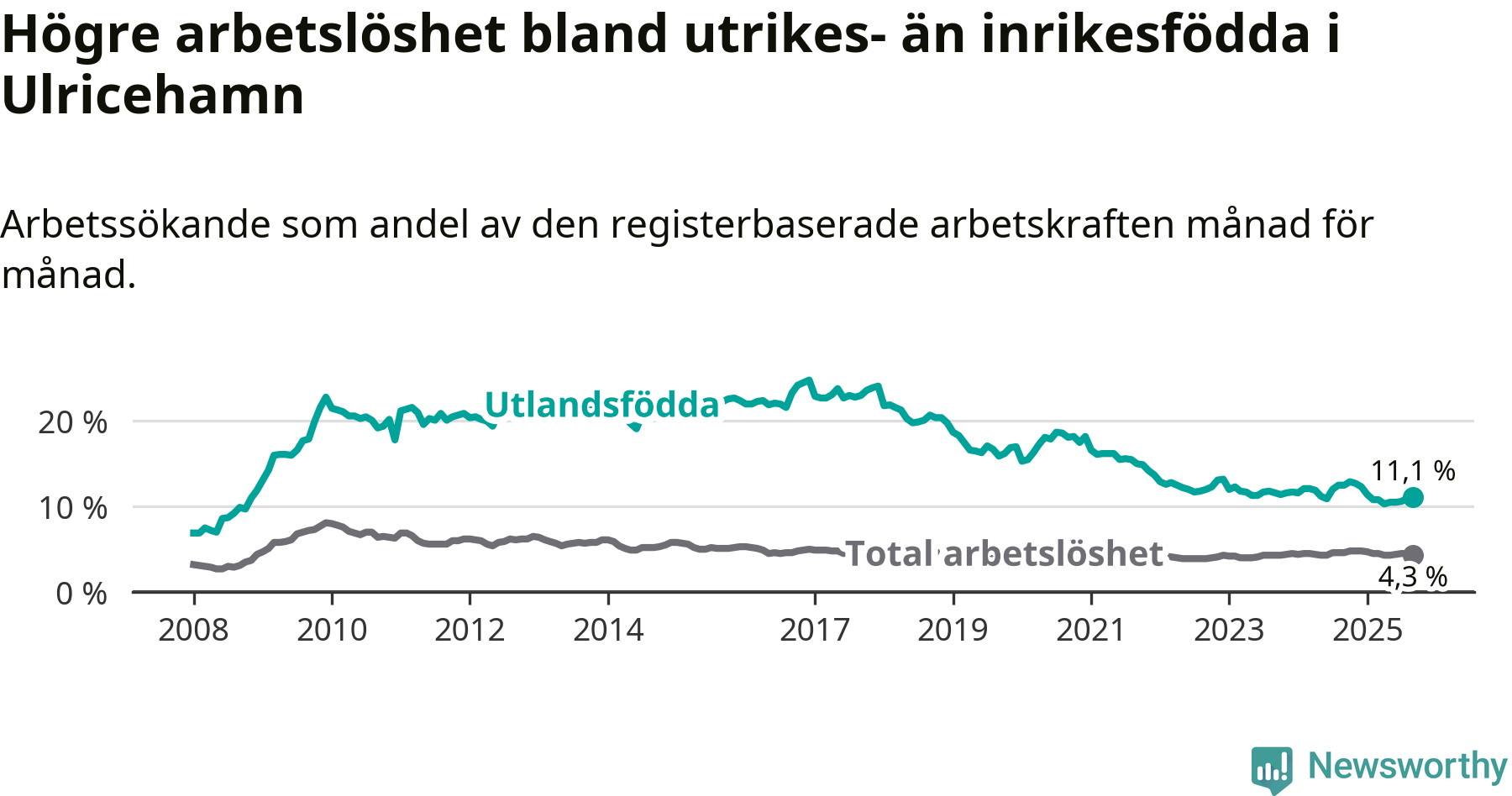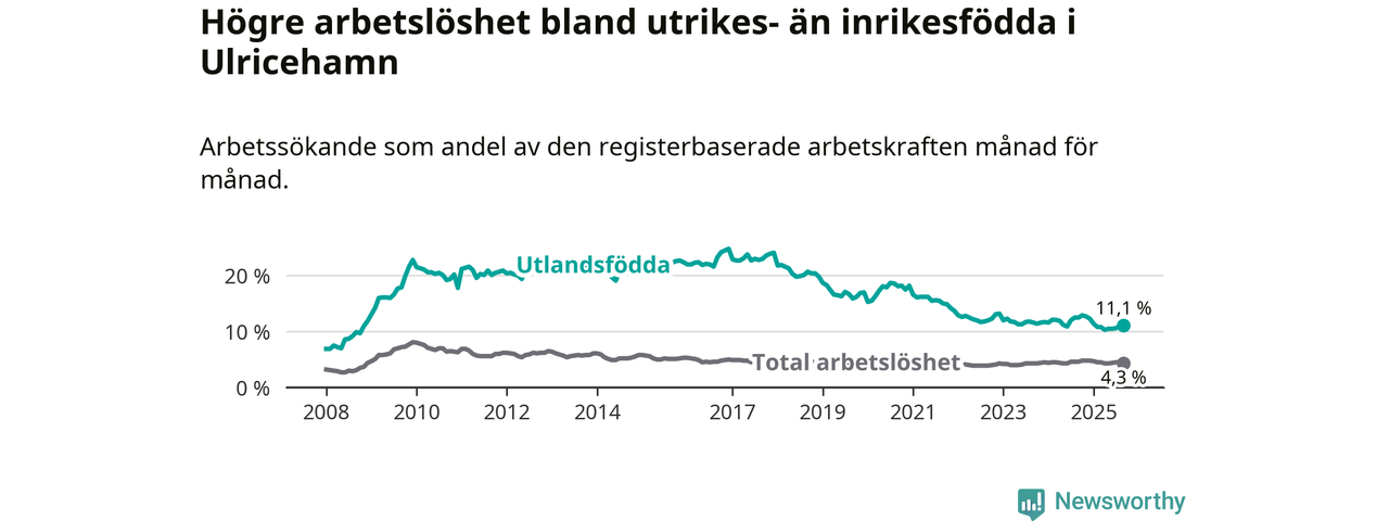 Arbetslösheten bland utlandsfödda var 11,1 procent i Ulricehamn under september månad, motsvarande 221 av 1 991 personer. Det är 1,4 procentenheter färre än vid samma tidpunkt i fjol (−29 om man räknar personer). Därmed är de utlandsföddas arbetslöshet lägre än vid samma tidpunkt i fjol för nionde månaden i följd. Sedan december 2024 har arbetslösheten bland utlandsfödda minskat från 12,3 till 11,1 procent.
