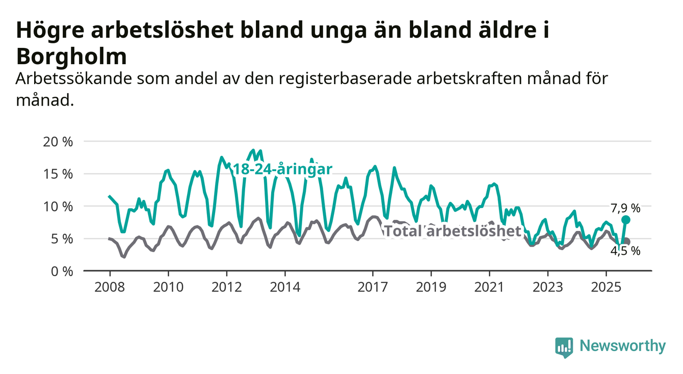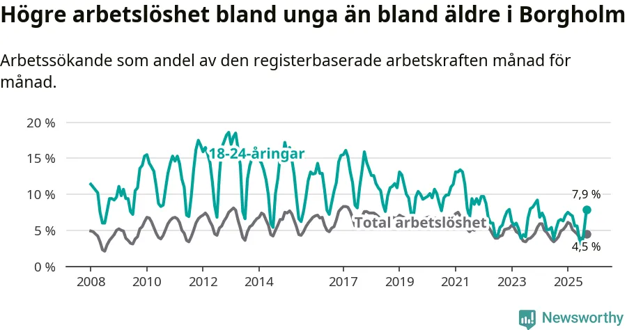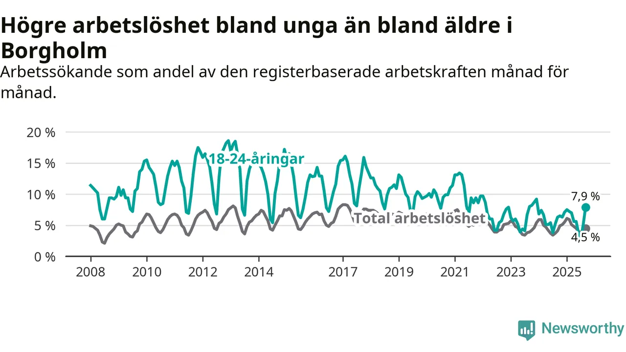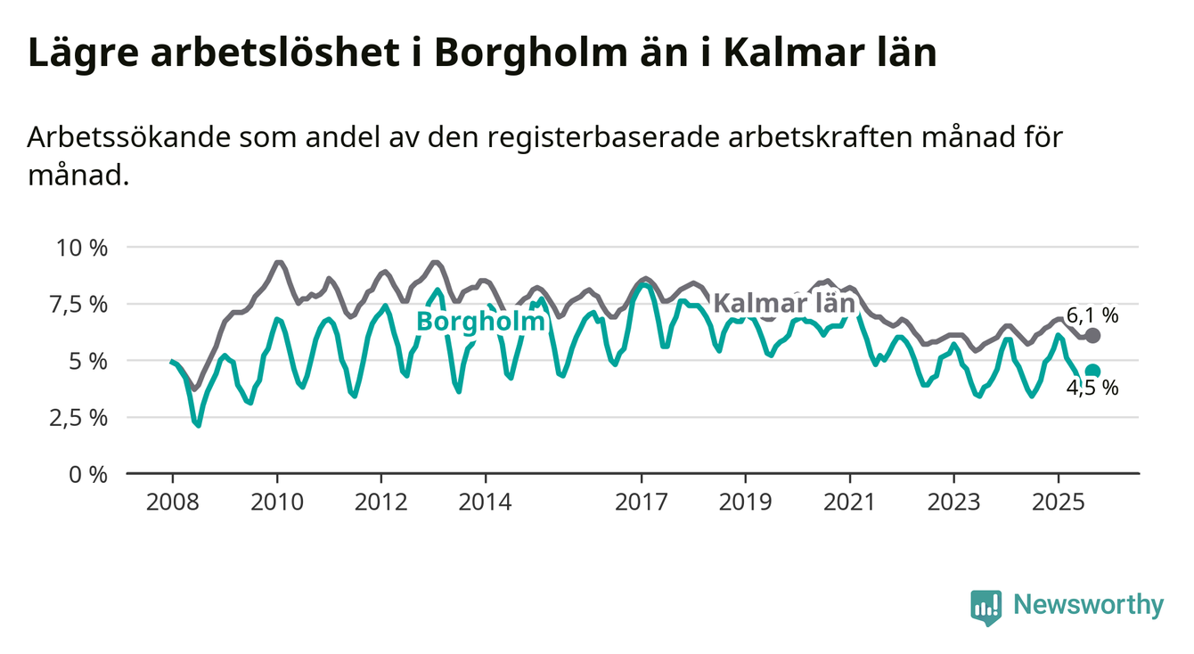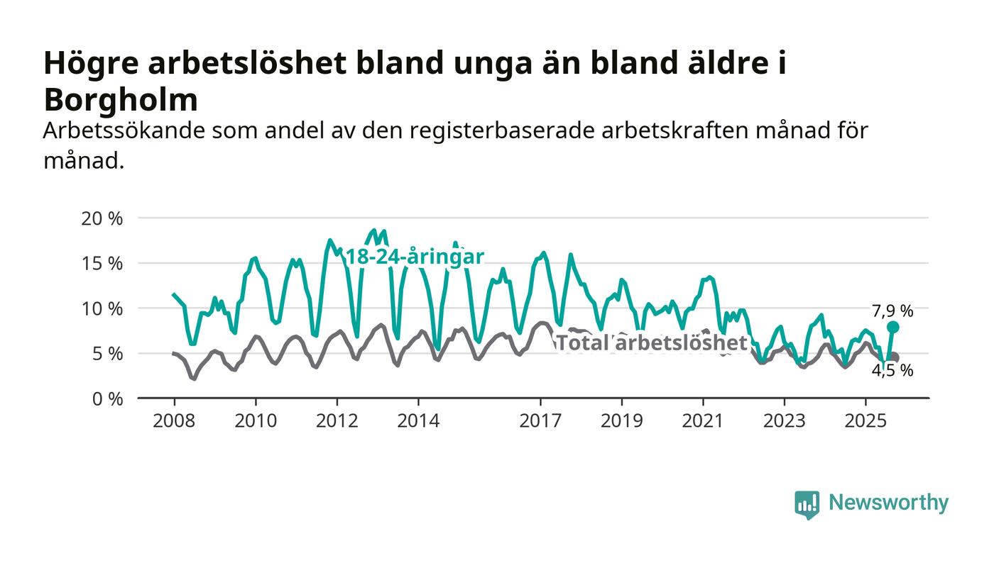 Det är sjunde månaden i följd som arbetslösheten i Borgholm är högre än den var under samma tidpunkt året innan. Sedan februari har arbetslösheten gått upp från 5,9 till 4,5 procent.