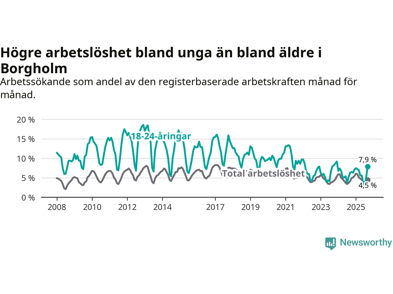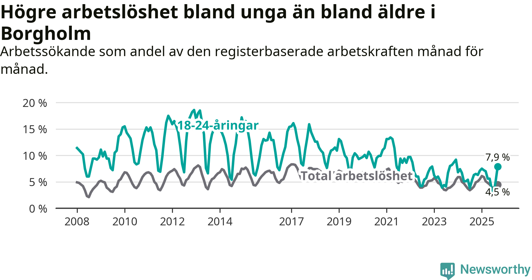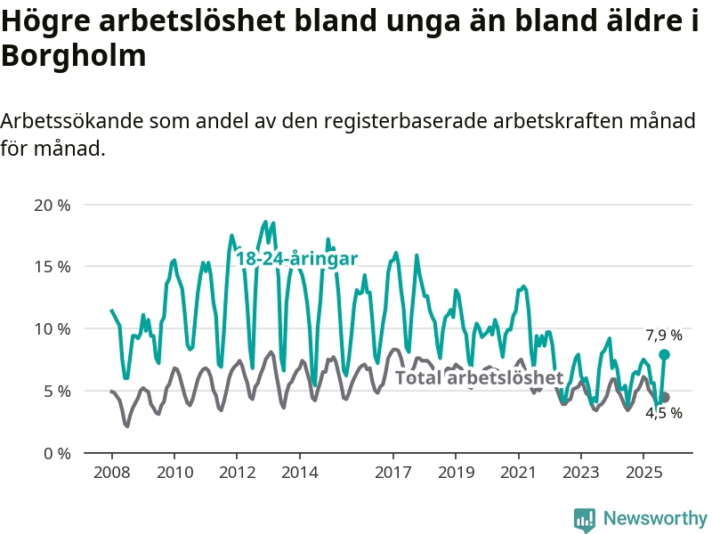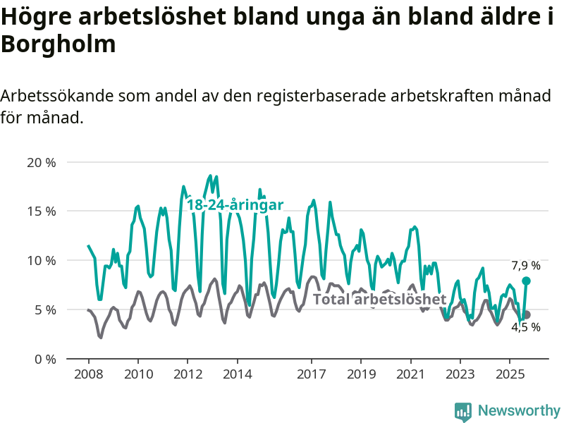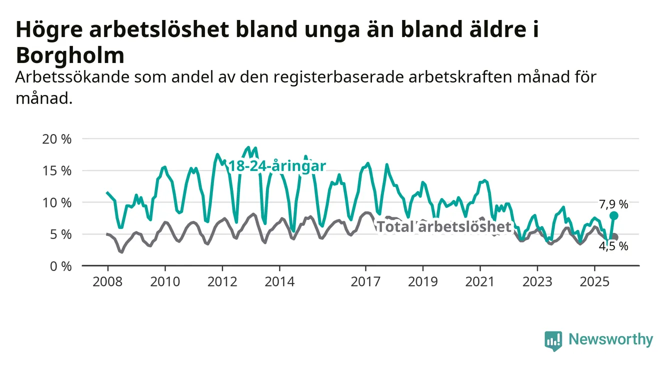 Det är sjunde månaden i följd som arbetslösheten i Borgholm är högre än den var under samma tidpunkt året innan. Sedan februari har arbetslösheten gått upp från 5,9 till 4,5 procent.