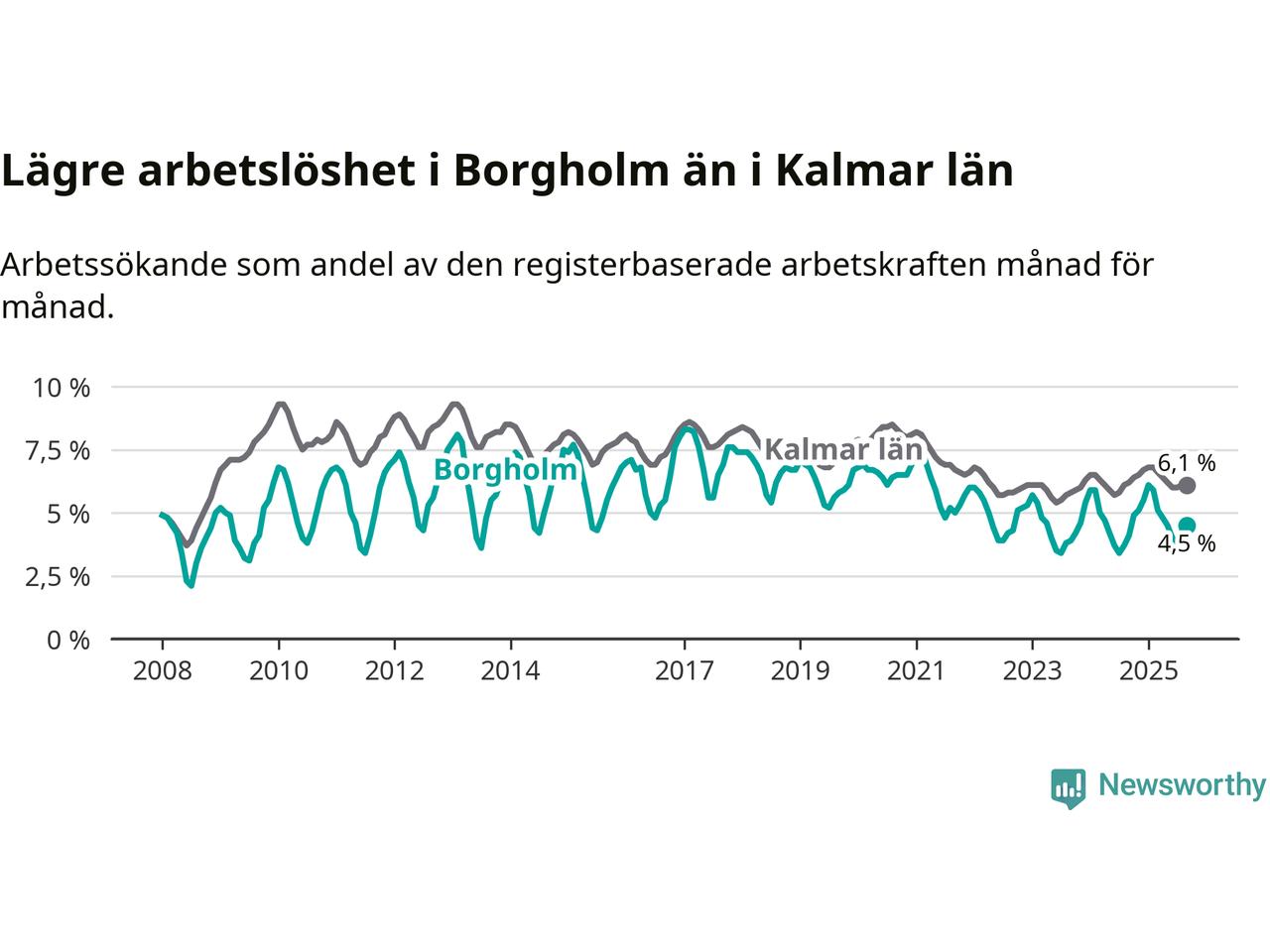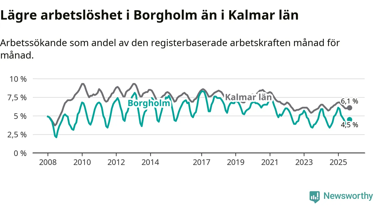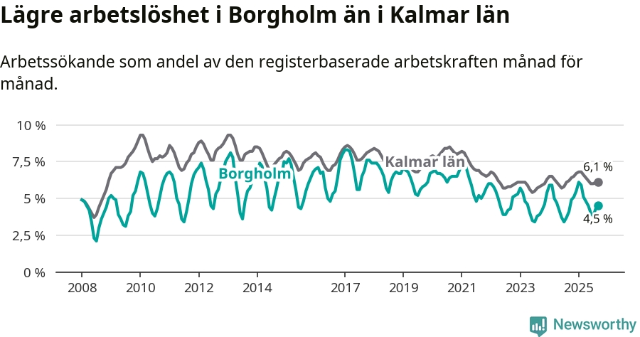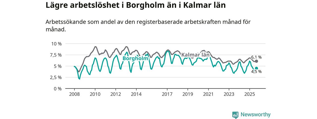 Under september månad rapporterade Borgholms kommun en total arbetslöshet på 4,5 procent. Det är en ökning jämfört med samma tidpunkt i fjol (+0,4 procentenheter). I Kalmar län däremot sjunker arbetslösheten något.