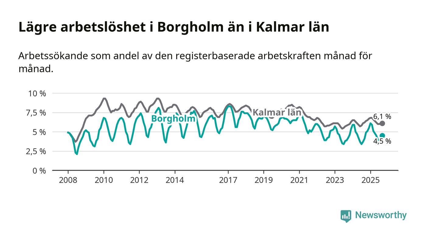 Även om arbetslösheten i Borgholm alltså ökar, så ligger den fortfarande under snittet i hela Kalmar län (4,5 procent i kommunen, jämfört med 6,1 procent i hela länet). Mörbylånga har den lägsta arbetslösheten i länet (3,4 procent), medan Högsby har den högsta (8,1 procent). För att Borgholm skulle komma ner i samma arbetslöshetsnivå som Mörbylånga skulle 47 personer behöva sysselsättas.