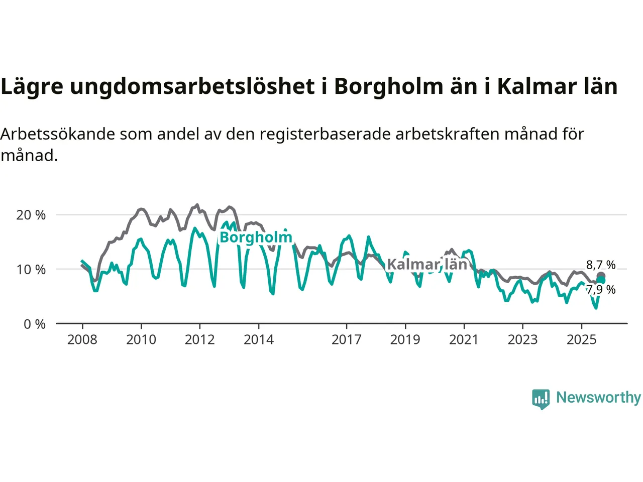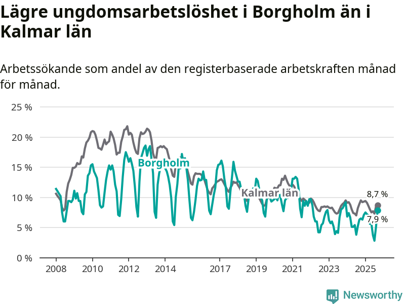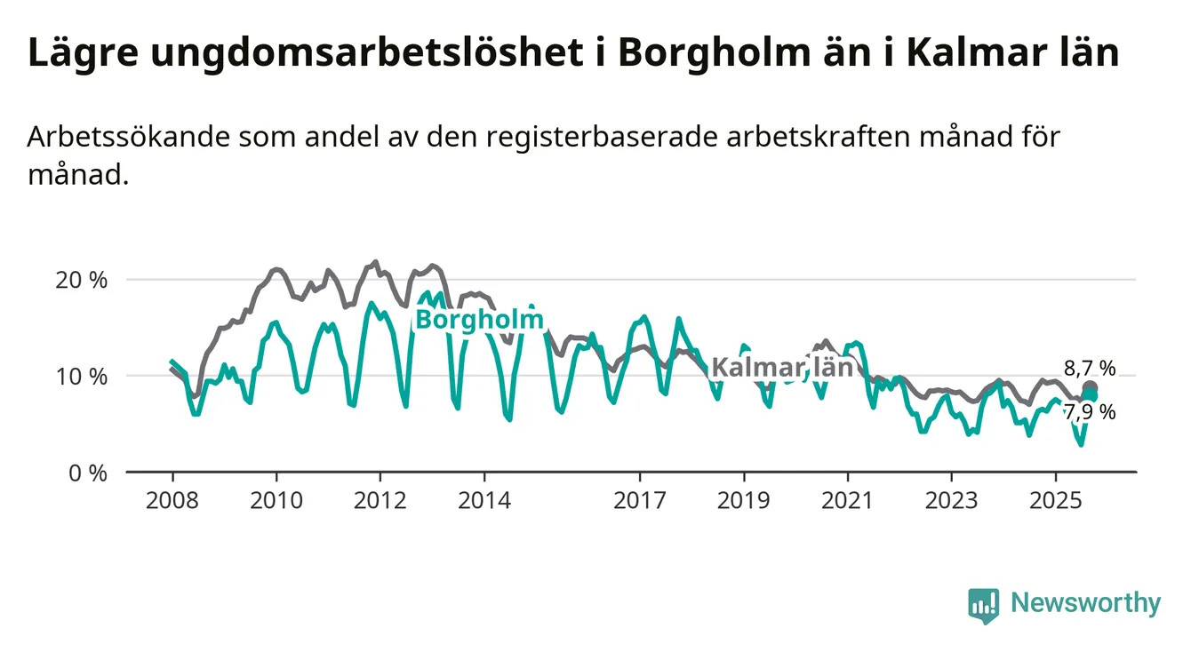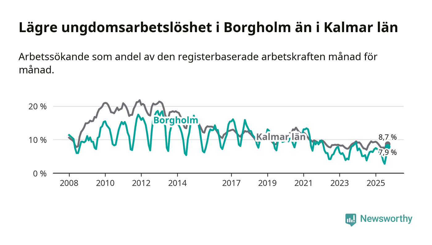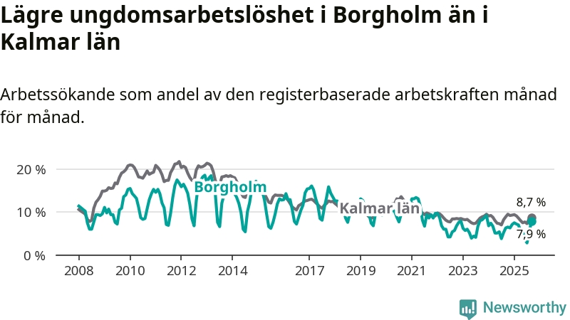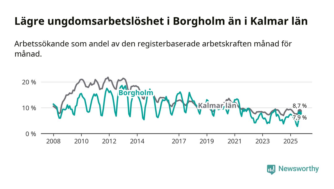 Precis som den totala arbetslösheten ligger ungdomsarbetslösheten i Borgholm lägre än i Kalmar län som helhet. Skillnaden mellan kommunen och länet är 0,8 procentenheter.
