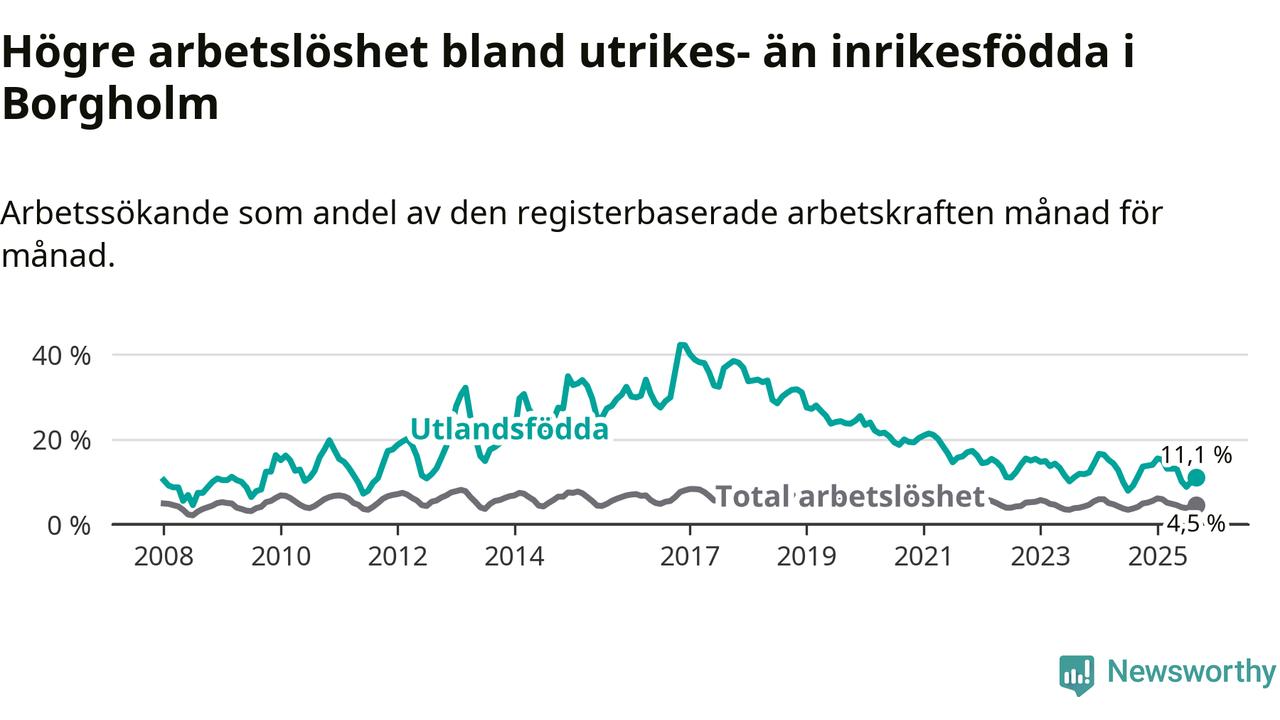 Arbetslösheten bland utlandsfödda var 11,1 procent i Borgholm under september månad, motsvarande 59 av 532 personer. Det är 0,2 procentenheter färre än vid samma tidpunkt i fjol (−2 om man räknar personer). Den senaste månadens nedgång innebär ett trendbrott. Under de fyra föregående månaderna hade arbetslösheten bland utlandsfödda varit högre än motsvarande tidpunkt året innan.