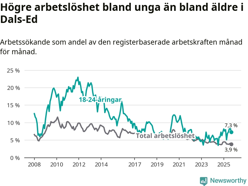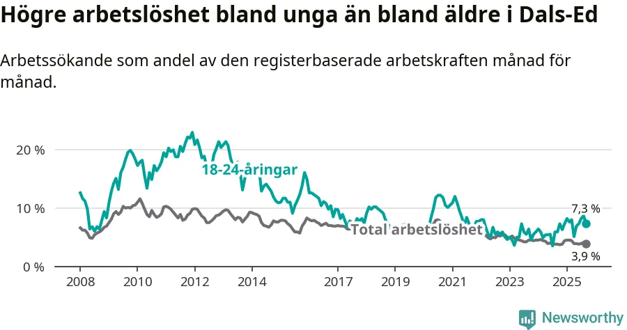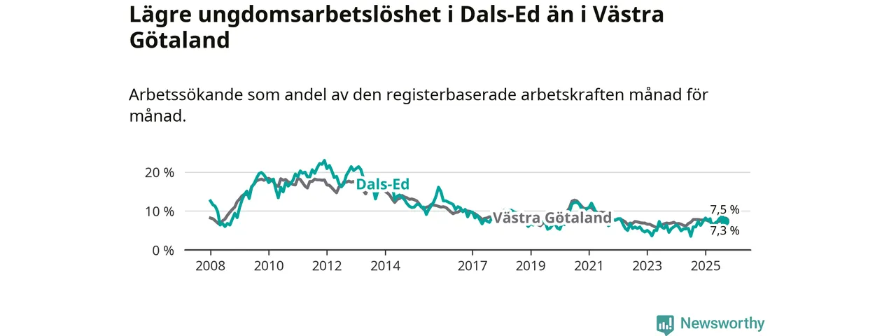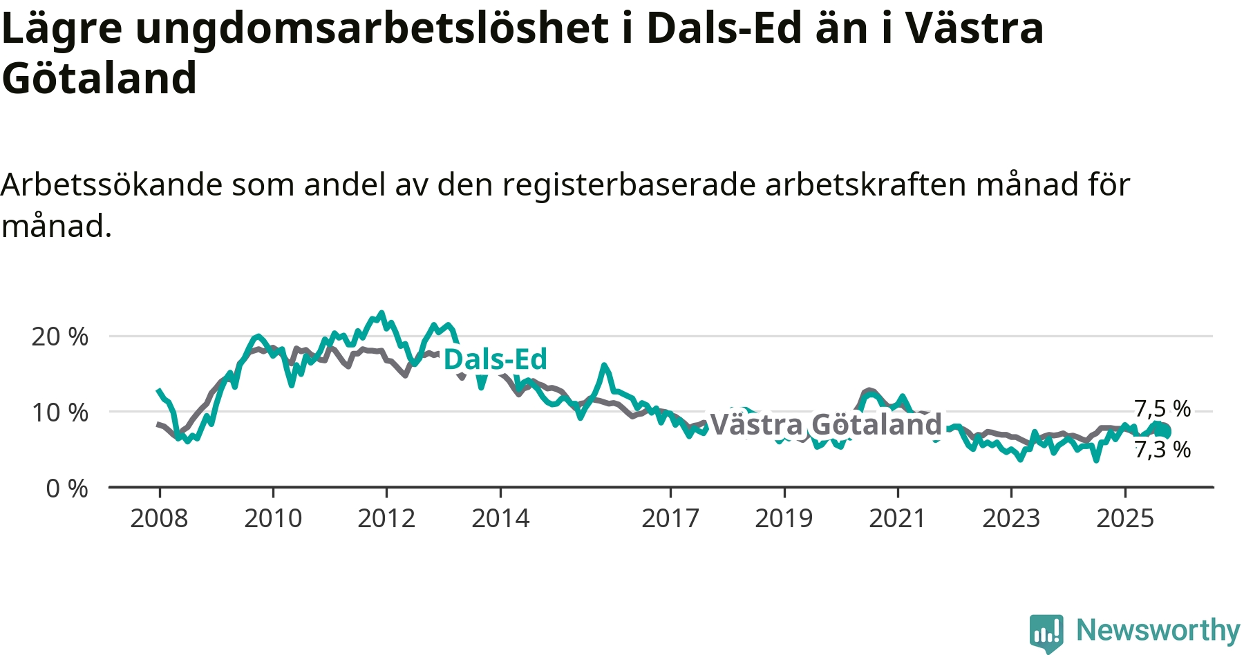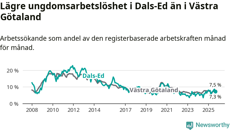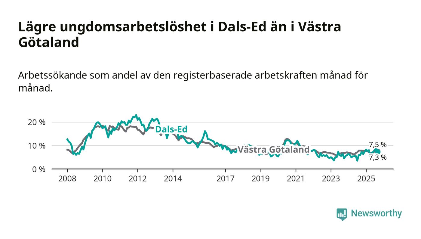 Precis som den totala arbetslösheten ligger ungdomsarbetslösheten i Dals-Ed lägre än i Västra Götaland som helhet. Skillnaden mellan kommunen och länet är 0,2 procentenheter.