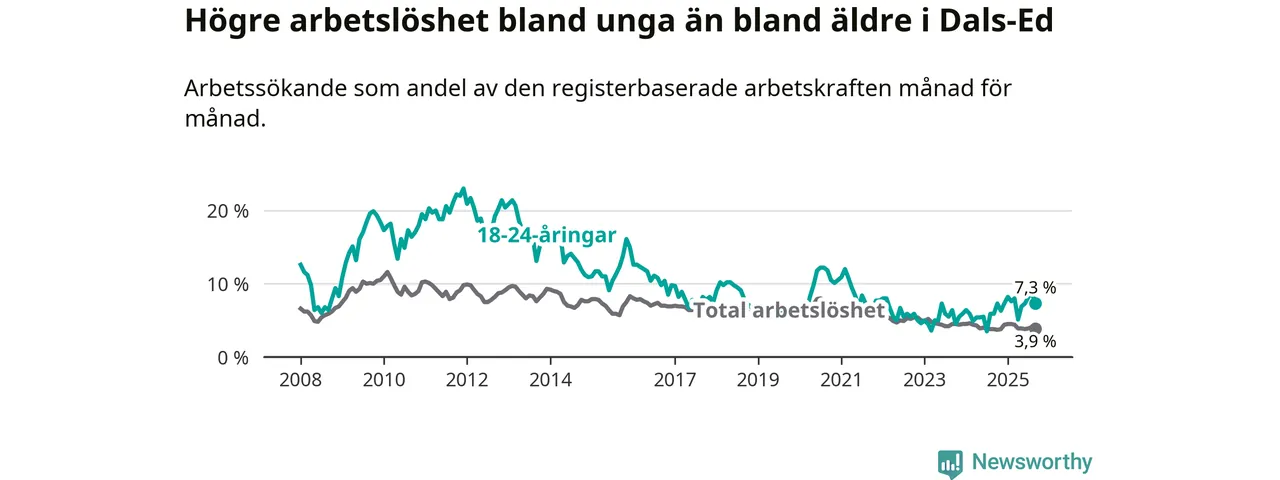 Under september månad rapporterade Dals-Eds kommun en total arbetslöshet på 3,9 procent. Det är en ökning jämfört med samma tidpunkt i fjol (+0,1 procentenheter). Även i Västra Götalands län stiger arbetslösheten .