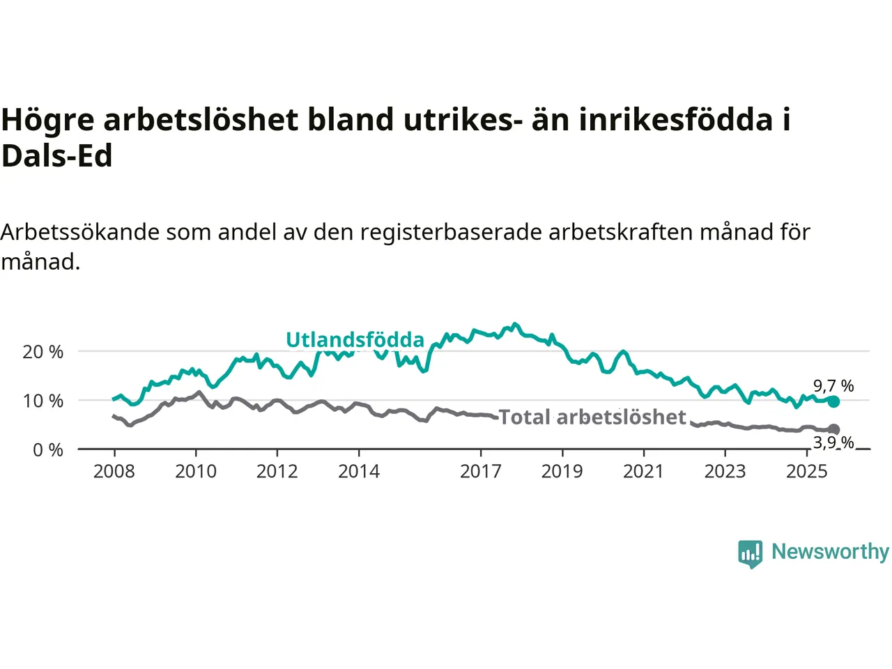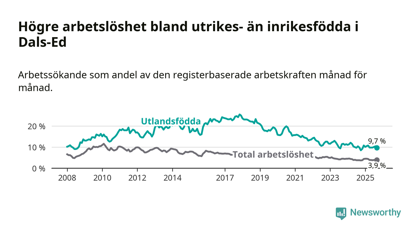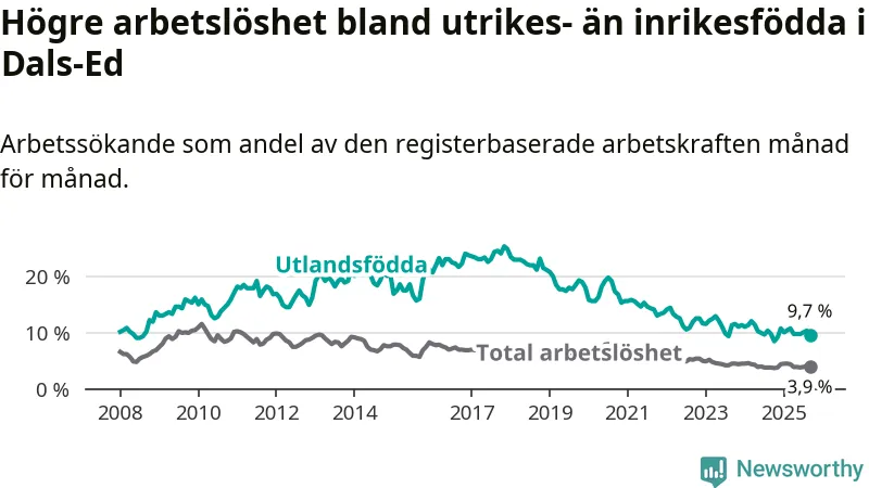 Den här skillnaden i arbetslöshet mellan inrikes- och utrikesfödda är ungefär densamma i Dals-Ed som i andra kommuner i Västra Götaland. Lilla Edet har, relativt sett, den minsta skillnaden i arbetslöshet mellan inrikes- och utrikes födda i länet. Karlsborg har den största.