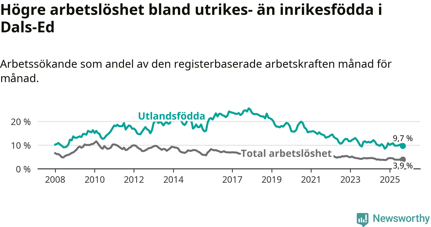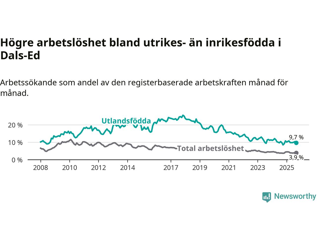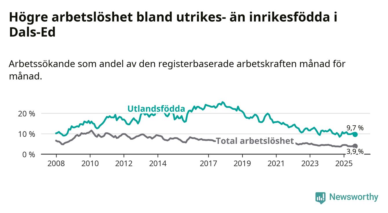 Arbetslösheten bland utlandsfödda var 9,7 procent i Dals-Ed under september månad, motsvarande 30 av 309 personer. Det är 0,1 procentenheter färre än vid samma tidpunkt i fjol (±0 om man räknar personer). Den senaste månadens nedgång innebär ett trendbrott. Under de ett föregående månaderna hade arbetslösheten bland utlandsfödda varit högre än motsvarande tidpunkt året innan.