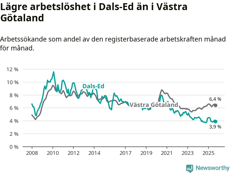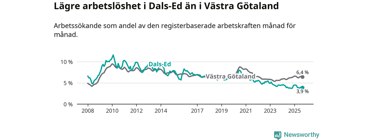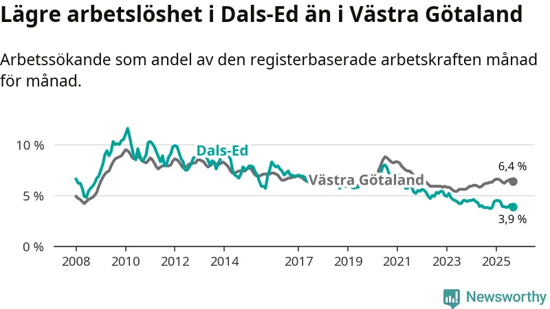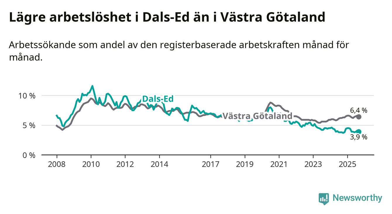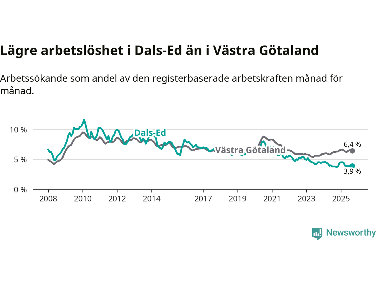 Även om arbetslösheten i Dals-Ed alltså ökar, så ligger den fortfarande under snittet i hela Västra Götalands län (3,9 procent i kommunen, jämfört med 6,4 procent i hela länet). Öckerö har den lägsta arbetslösheten i länet (2,7 procent), medan Gullspång har den högsta (8,5 procent). För att Dals-Ed skulle komma ner i samma arbetslöshetsnivå som Öckerö skulle 25 personer behöva sysselsättas.