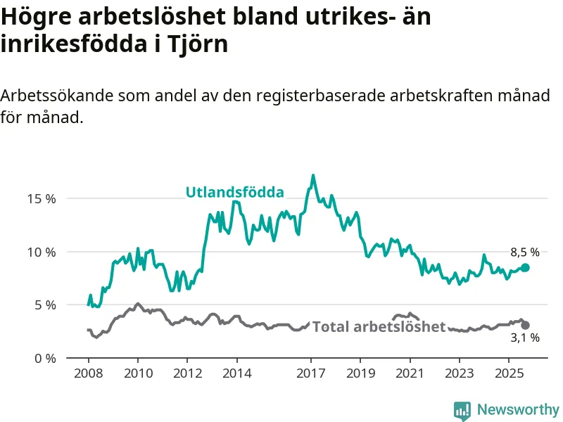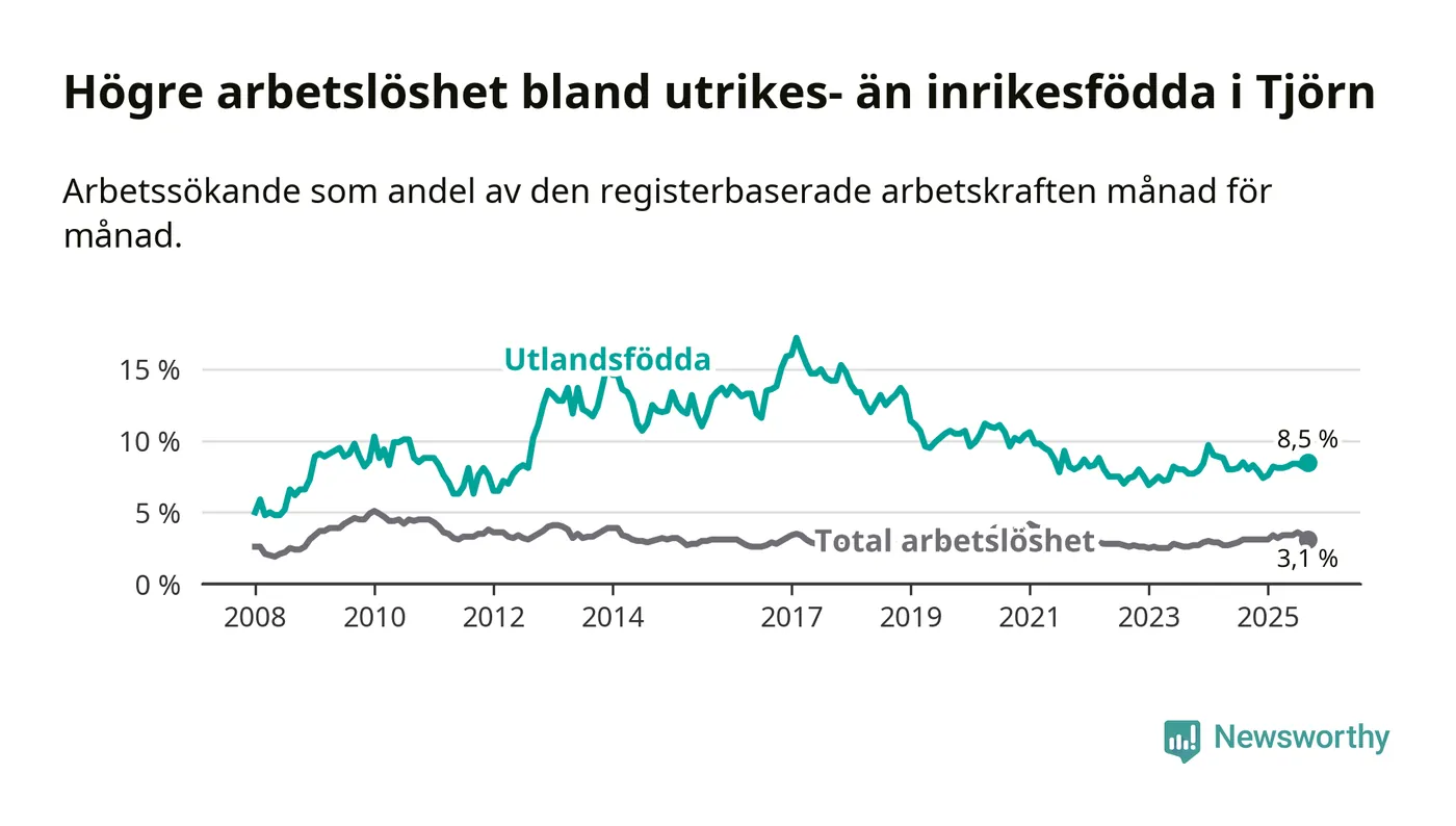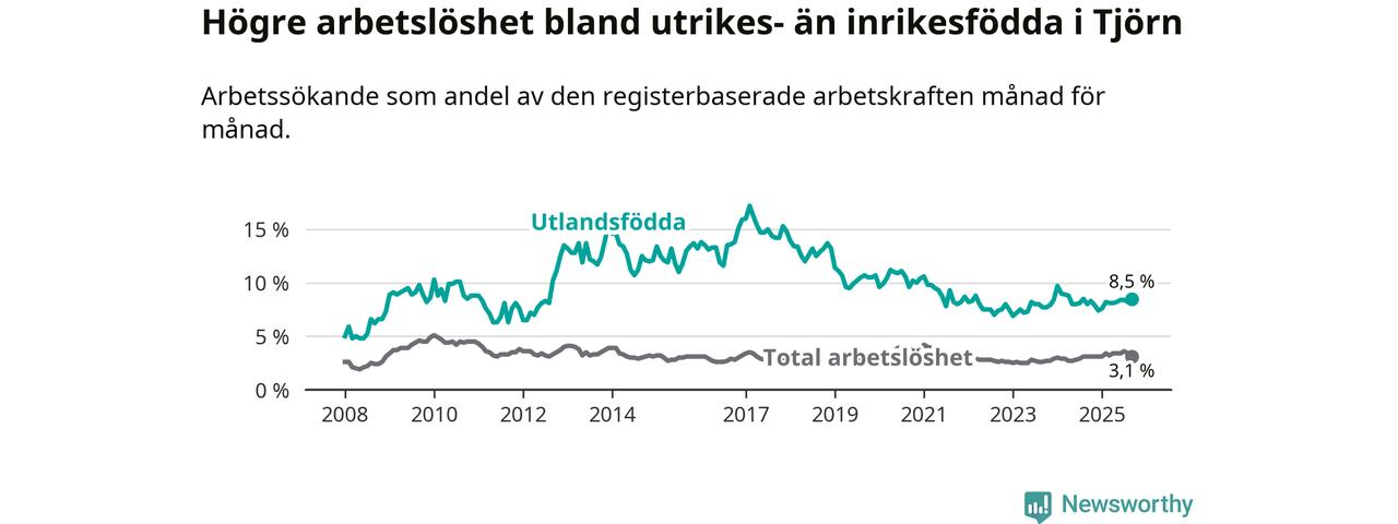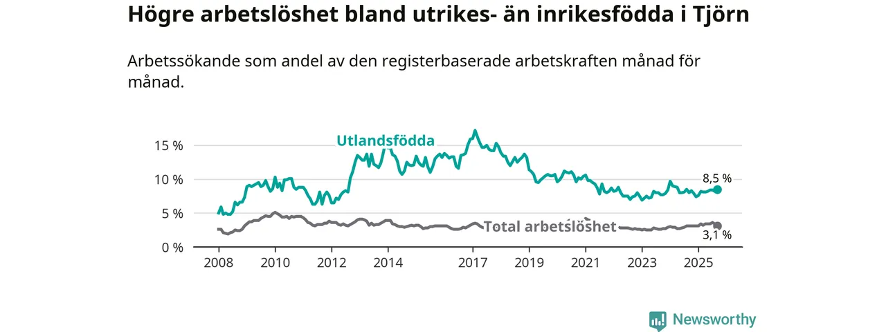 Arbetslösheten bland utlandsfödda var 8,5 procent på Tjörn under september månad, motsvarande 69 av 812 personer. Det är 0,5 procentenheter fler än vid samma tidpunkt i fjol (+3 om man räknar personer). Den senaste månadens uppgång innebär ett trendbrott. Under de ett föregående månaderna hade arbetslösheten bland utlandsfödda varit lägre än motsvarande tidpunkt året innan.