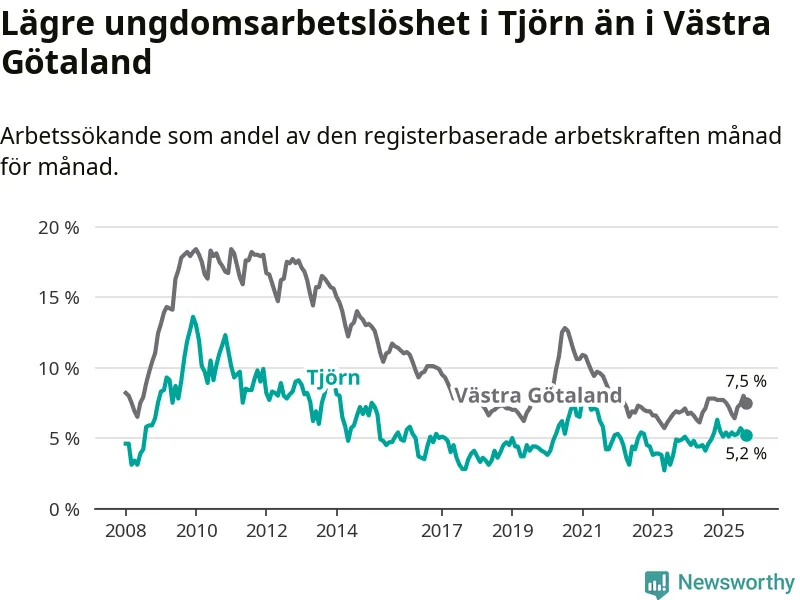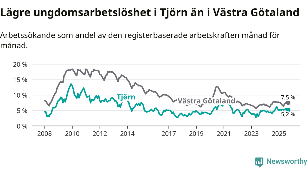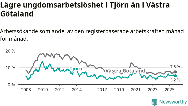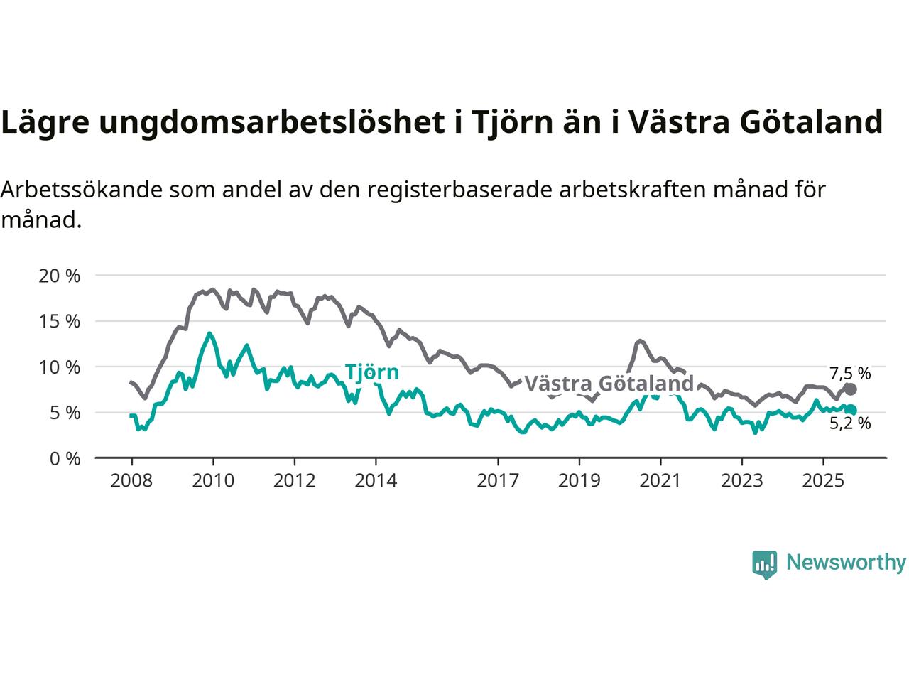 Precis som den totala arbetslösheten ligger ungdomsarbetslösheten på Tjörn lägre än i Västra Götaland som helhet. Skillnaden mellan kommunen och länet är 2,3 procentenheter.