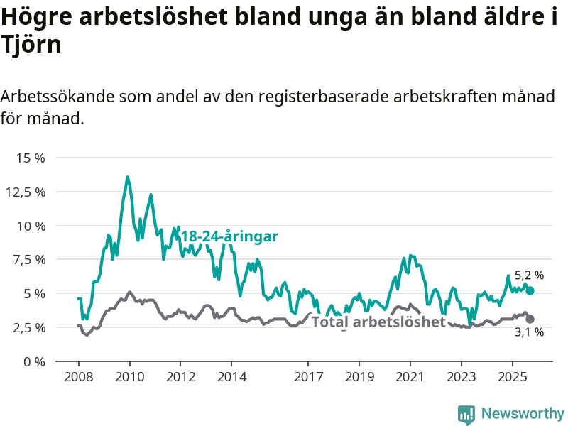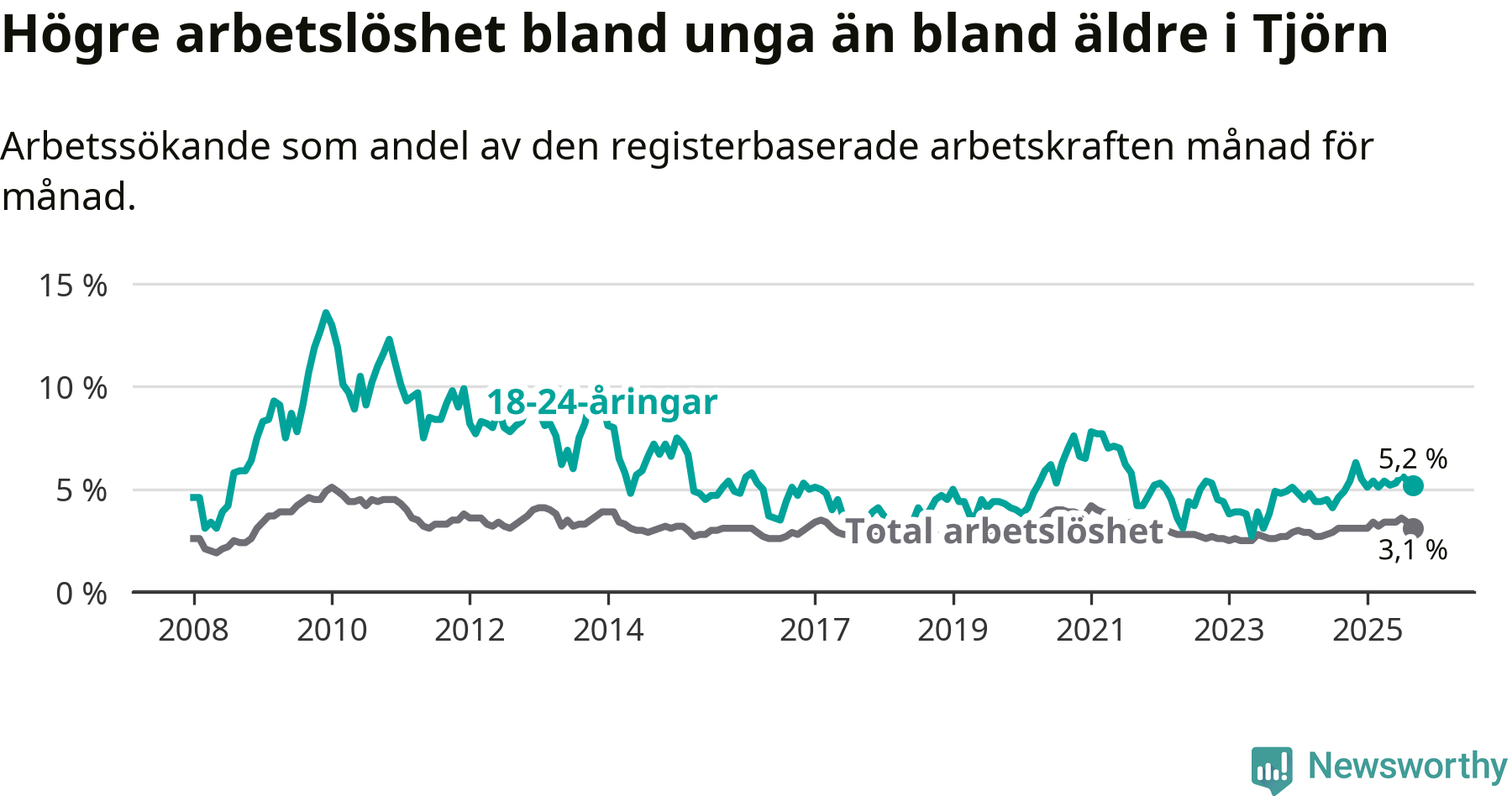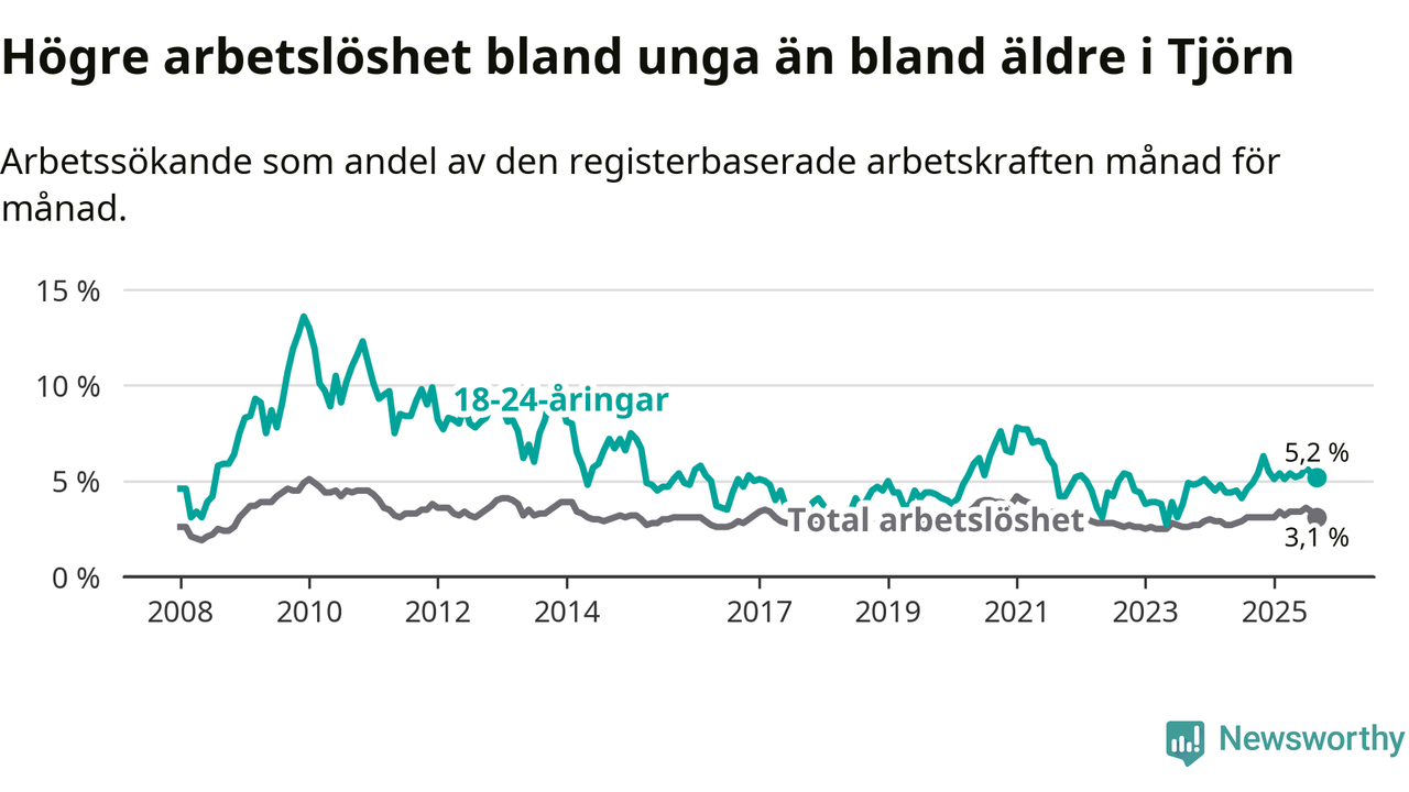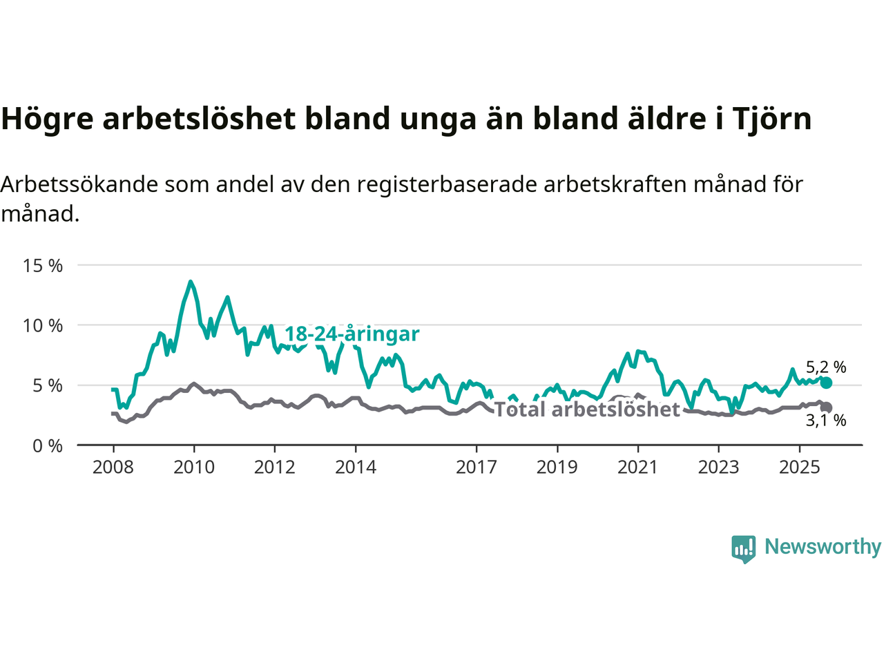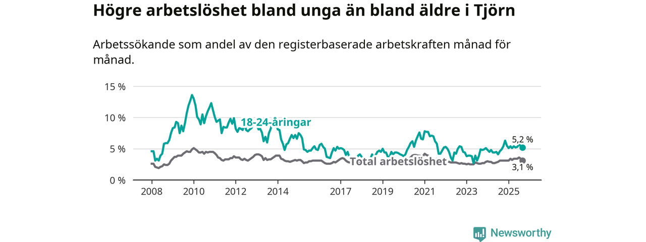 I och med den senaste månadens uppgång har de ungas arbetslöshet på Tjörn stigit tolv månader i följd (upp från 4,9 procent i september 2024 till 5,2 procent nu).