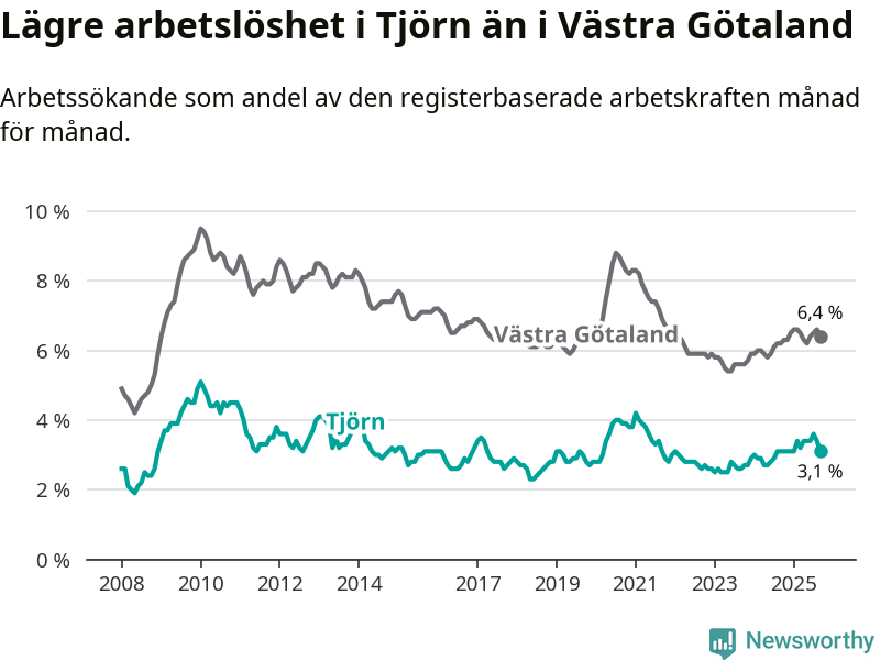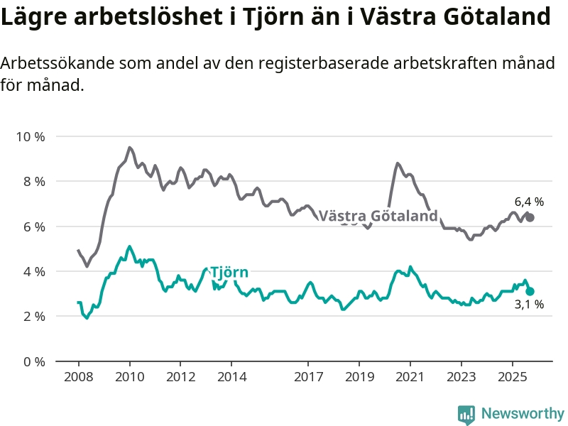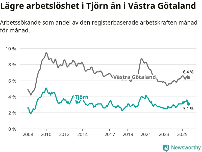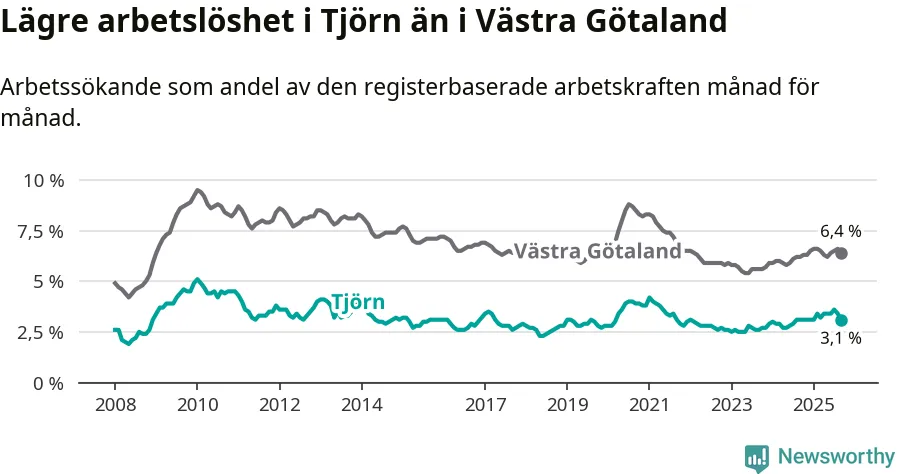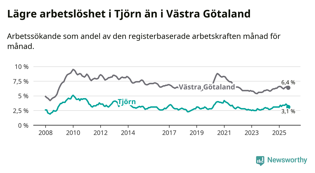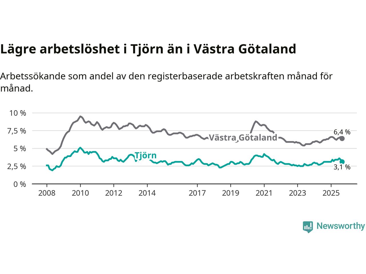 Under september månad rapporterade Tjörns kommun en total arbetslöshet på 3,1 procent. Det är i samma nivå som i september i fjol. I Västra Götalands län däremot stiger arbetslösheten