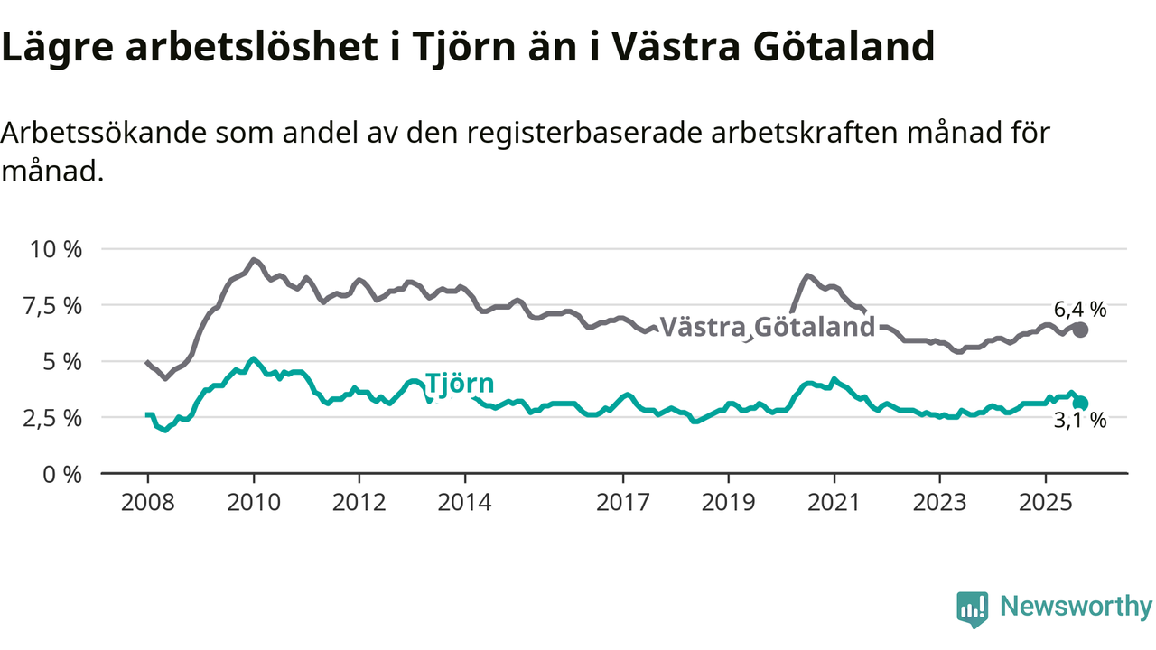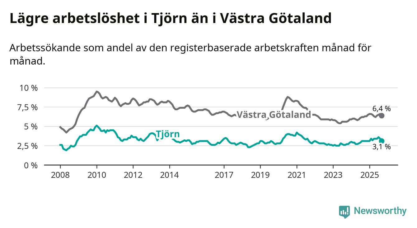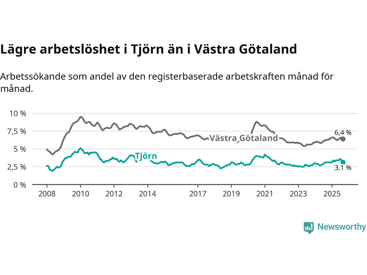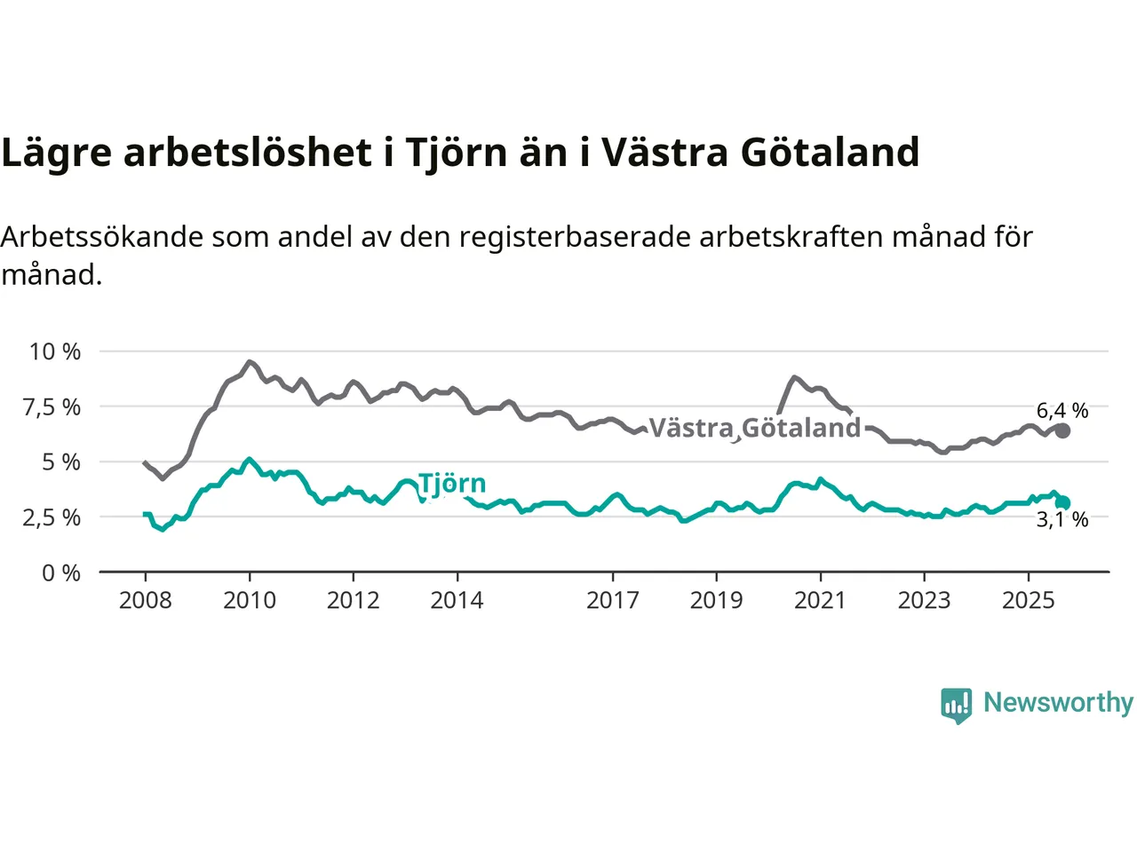 Ny statistik från Arbetsförmedlingen visar på en oförändrad i arbetslöshet i Tjörns kommun. I Västra Götaland däremot ökar arbetslösheten.