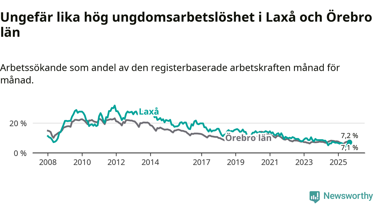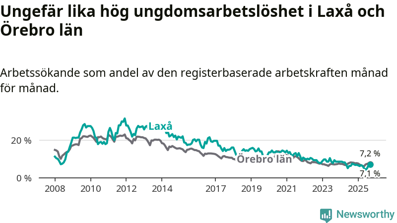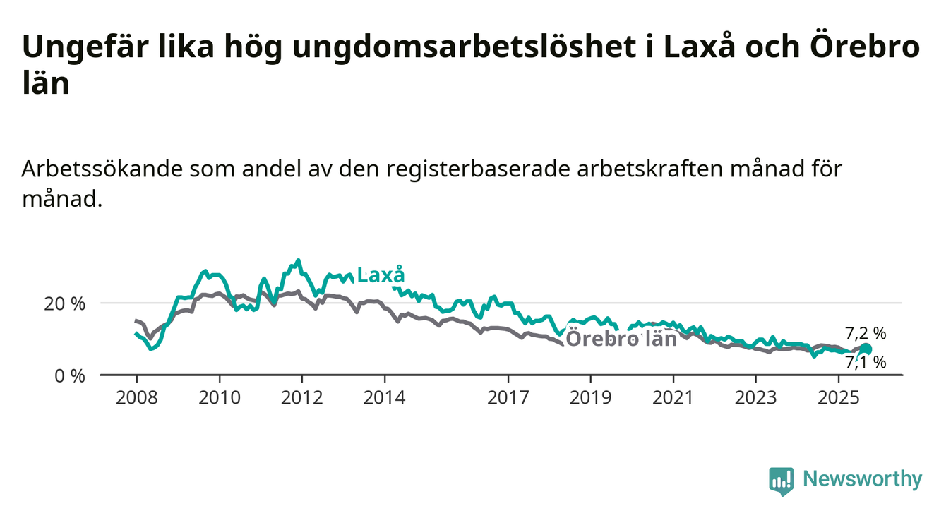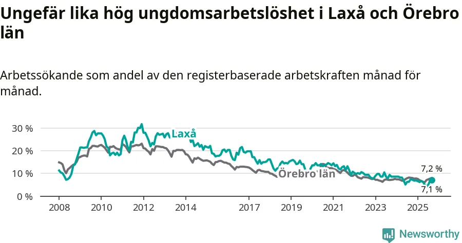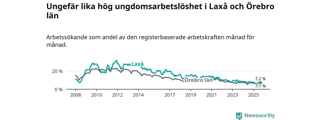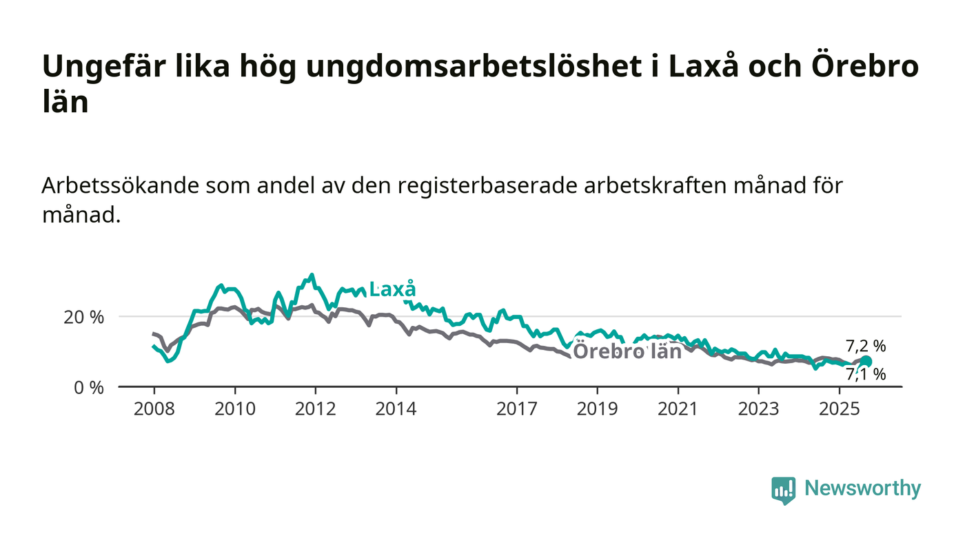 Medan Laxå har lägre total arbetslöshet än Örebro, ligger ungdomsarbetslösheten på i stort sett samma nivå.