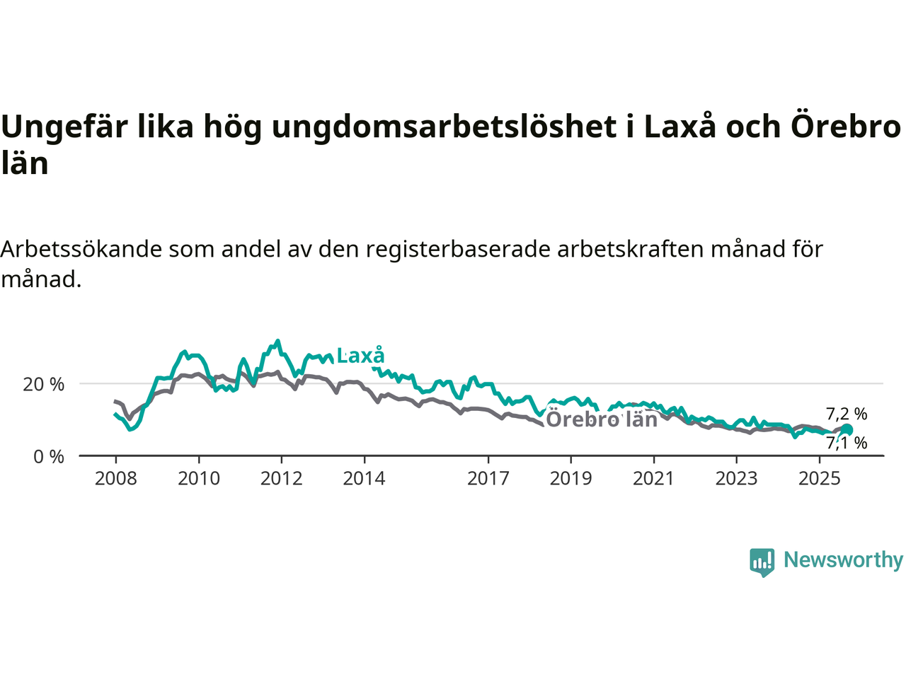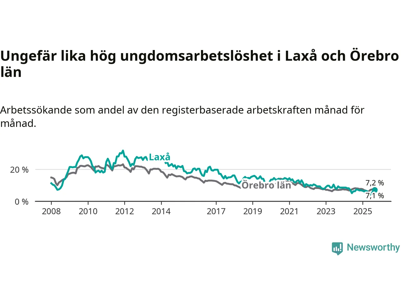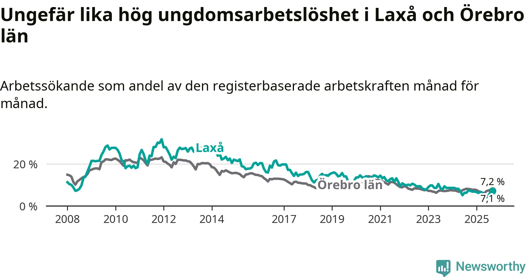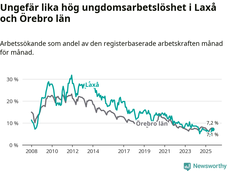 Medan Laxå har lägre total arbetslöshet än Örebro, ligger ungdomsarbetslösheten på i stort sett samma nivå.