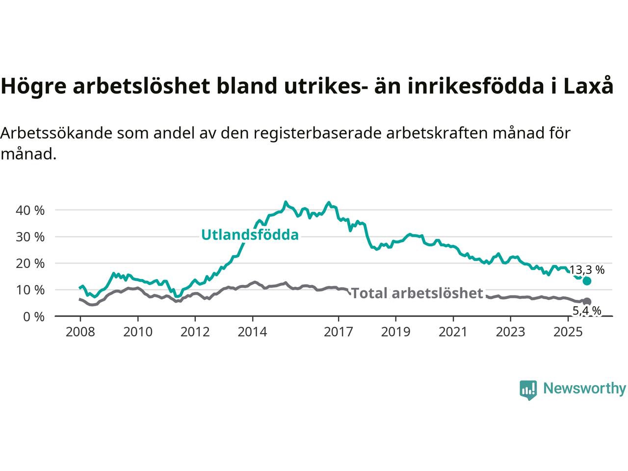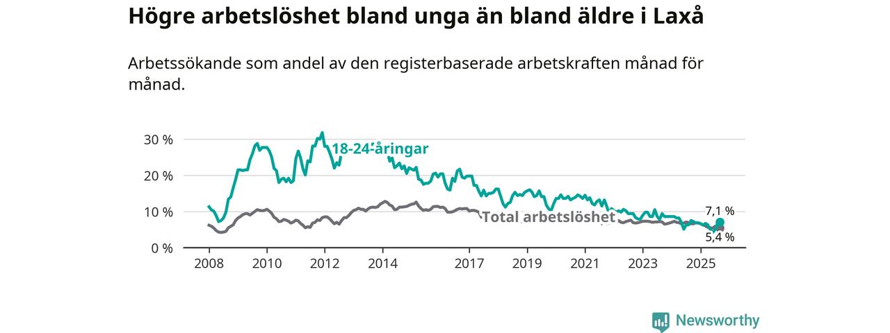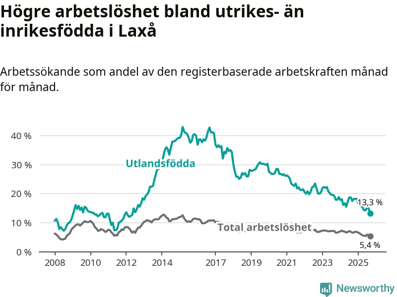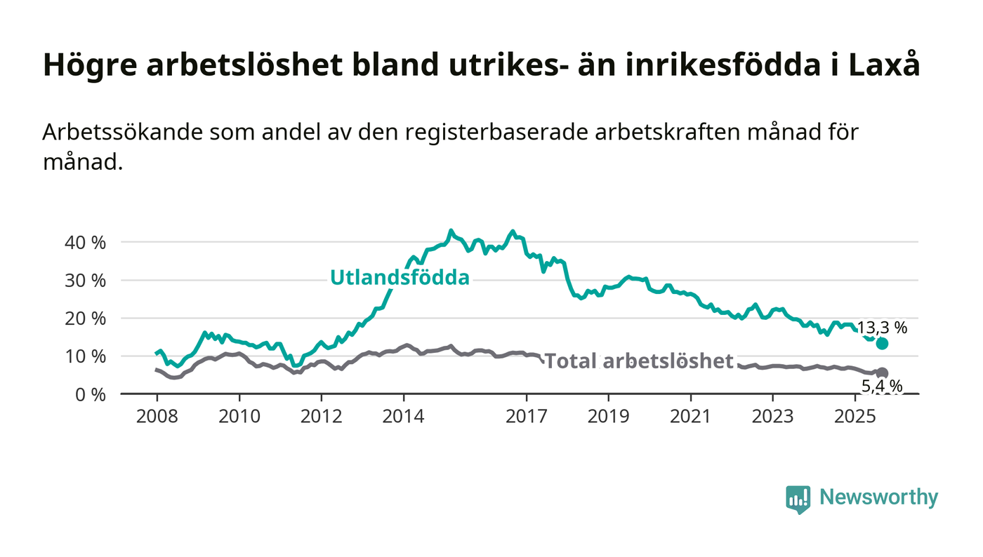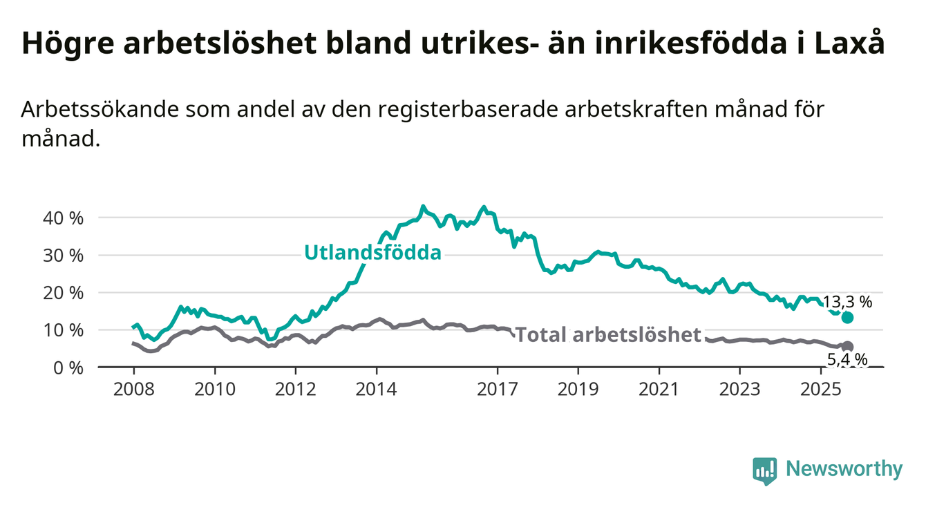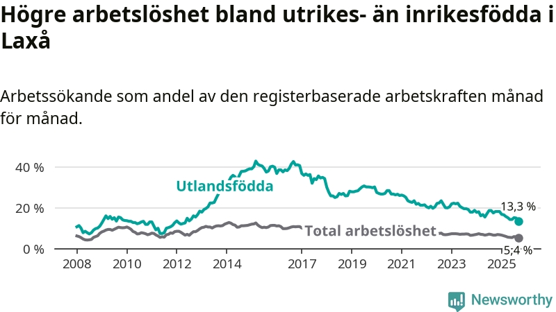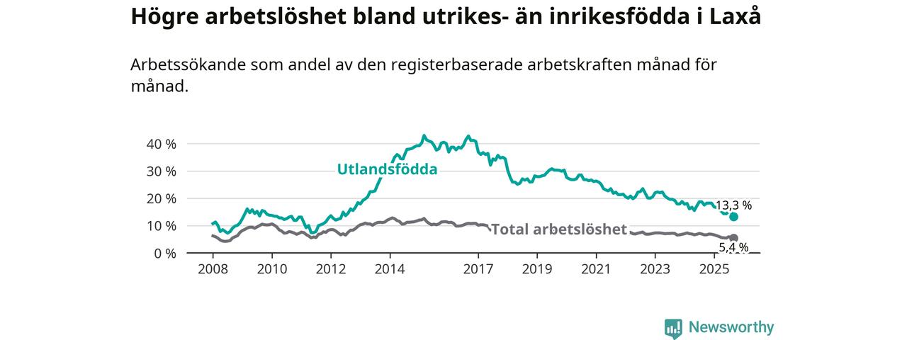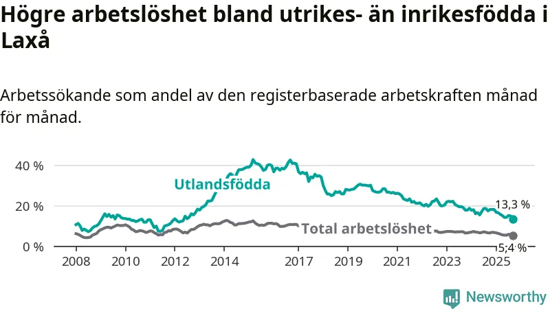 Arbetslösheten bland utlandsfödda var 13,3 procent i Laxå under september månad, motsvarande 63 av 474 personer. Det är 4,2 procentenheter färre än vid samma tidpunkt i fjol (−21 om man räknar personer). Därmed är de utlandsföddas arbetslöshet lägre än vid samma tidpunkt i fjol för tionde månaden i följd. Sedan november 2024 har arbetslösheten bland utlandsfödda minskat från 18,2 till 13,3 procent. Den nuvarande arbetslöshetsnivån är den lägsta sedan maj 2012.