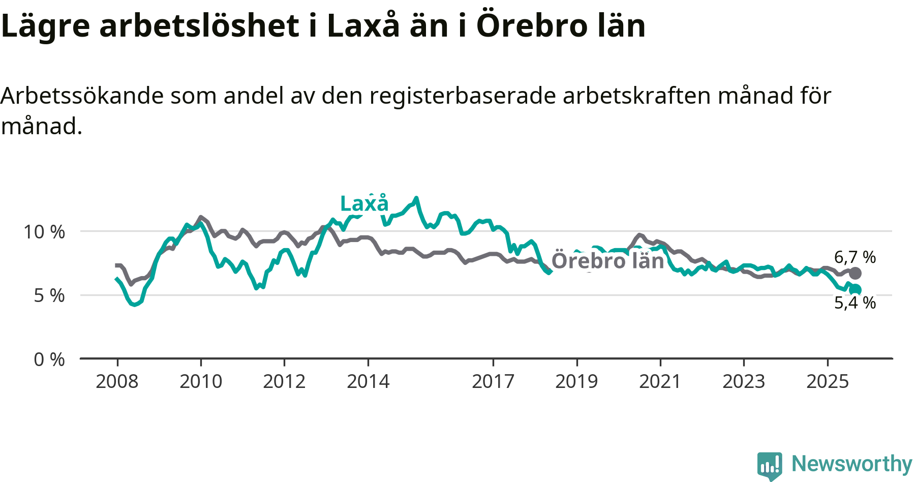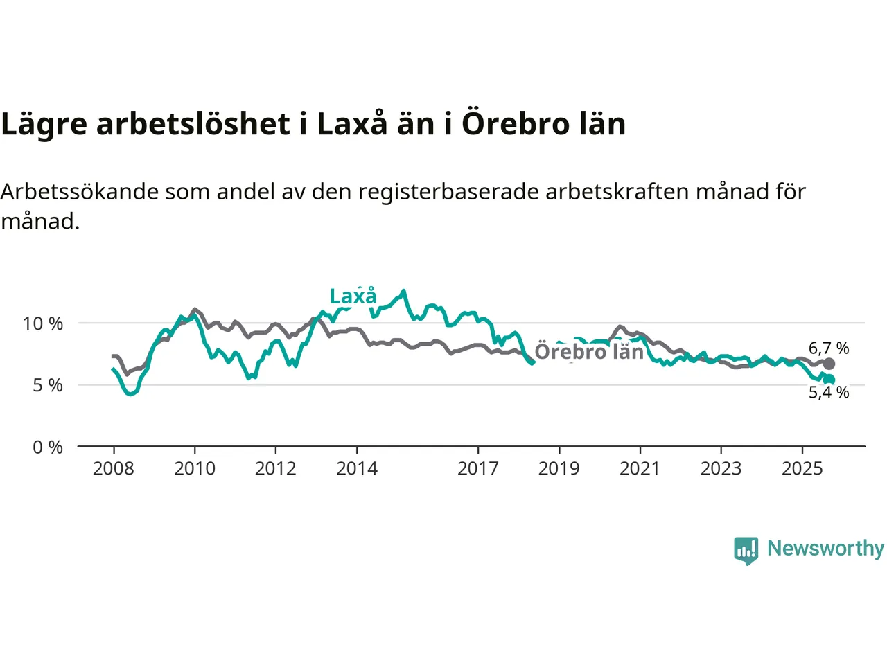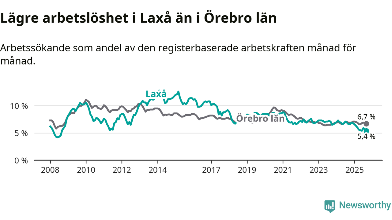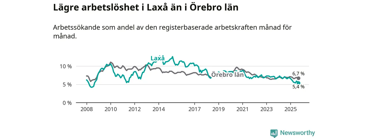 Det är nionde månaden i följd som arbetslösheten i Laxå är lägre än den var under samma tidpunkt året innan. Sedan december 2024 har arbetslösheten gått ner från 6,8 till 5,4 procent.