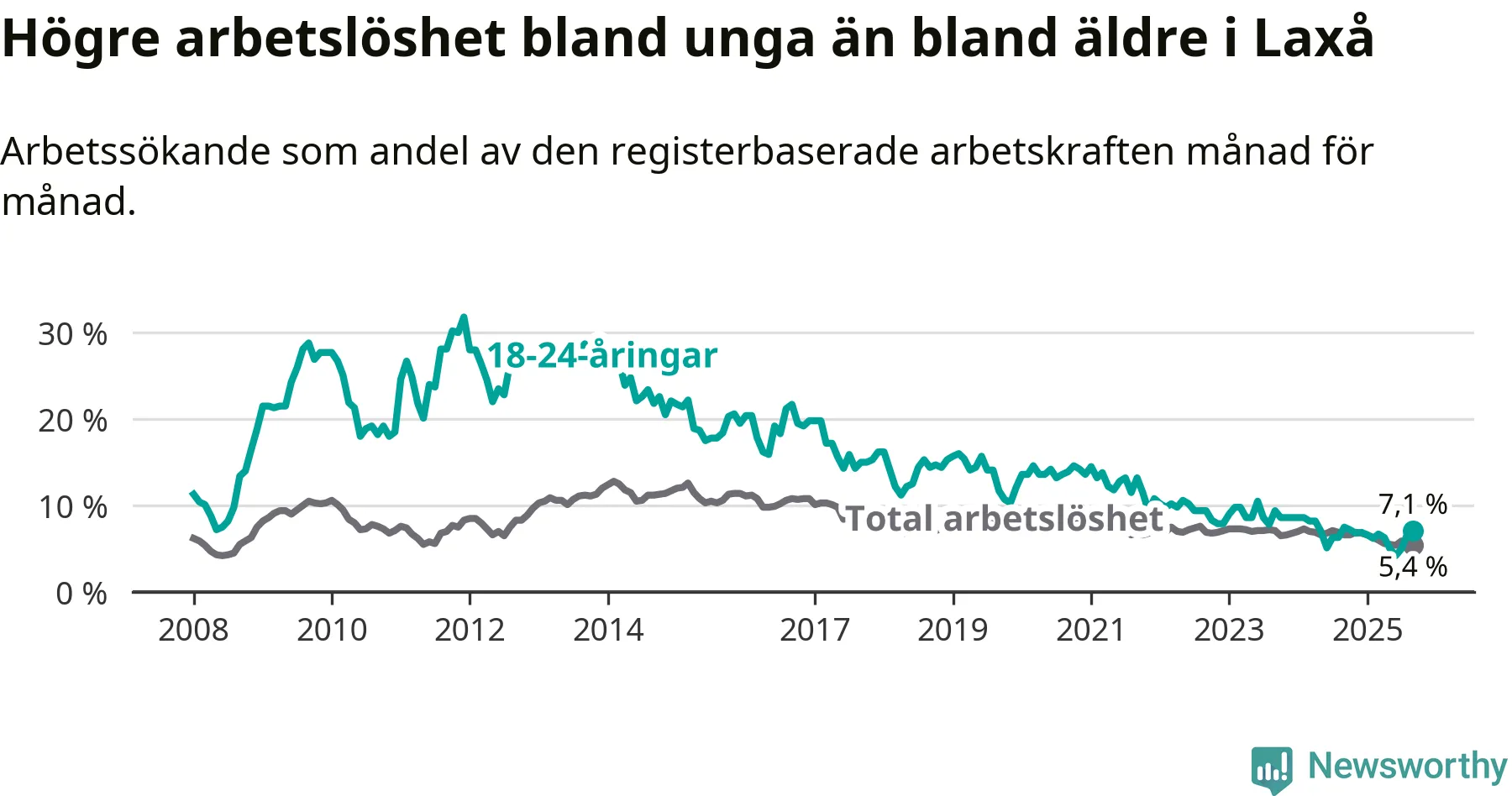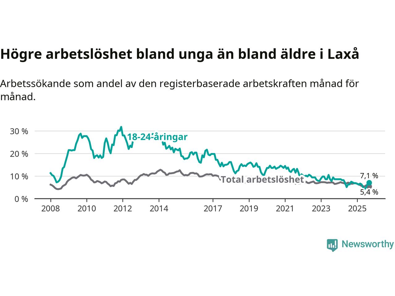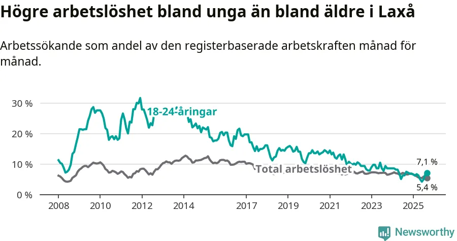 Det är nionde månaden i följd som arbetslösheten i Laxå är lägre än den var under samma tidpunkt året innan. Sedan december 2024 har arbetslösheten gått ner från 6,8 till 5,4 procent.
