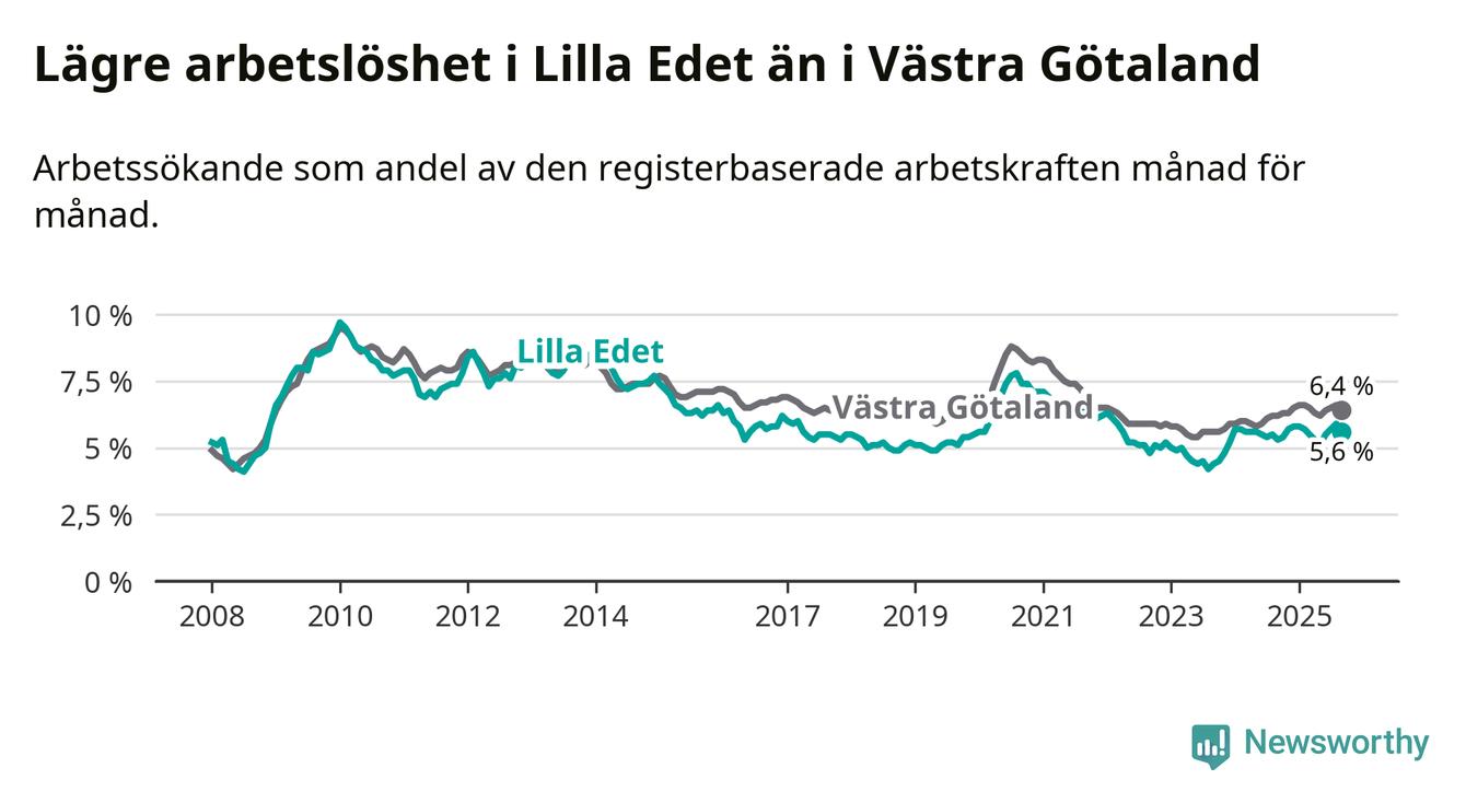 Även om arbetslösheten i Lilla Edet alltså ökar, så ligger den fortfarande under snittet i hela Västra Götalands län (5,6 procent i kommunen, jämfört med 6,4 procent i hela länet). Öckerö har den lägsta arbetslösheten i länet (2,7 procent), medan Gullspång har den högsta (8,5 procent). För att Lilla Edet skulle komma ner i samma arbetslöshetsnivå som Öckerö skulle 205 personer behöva sysselsättas.