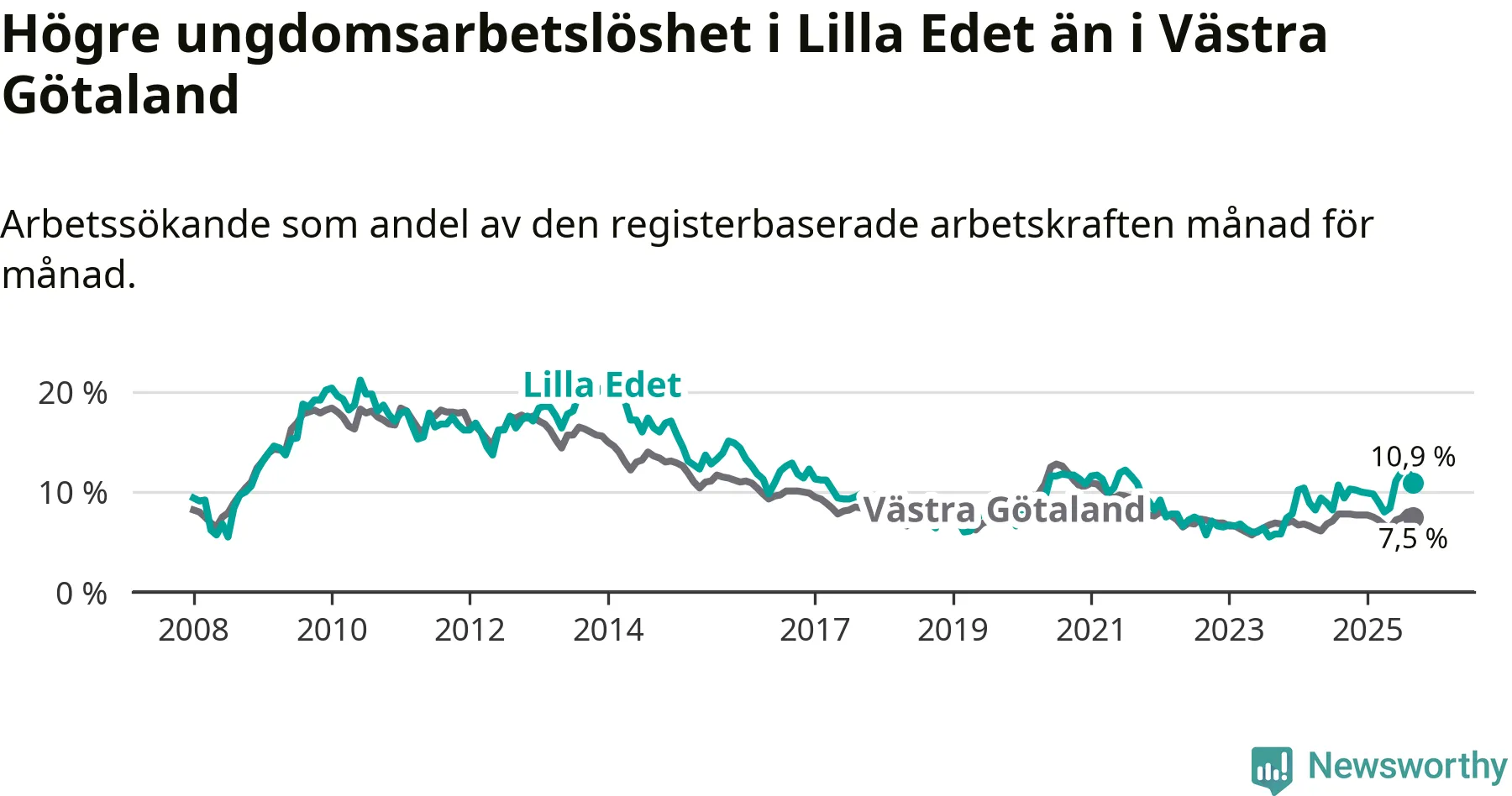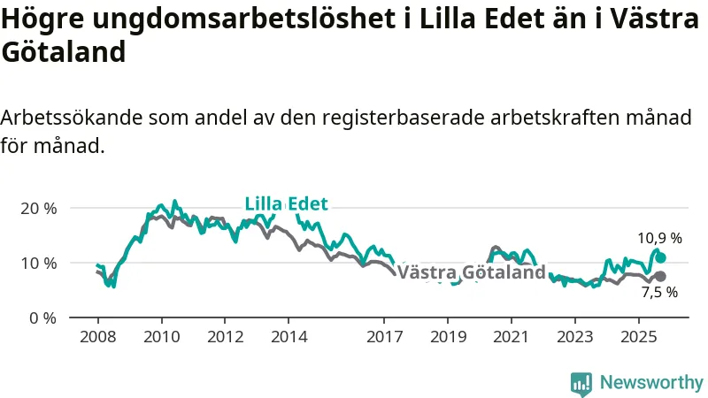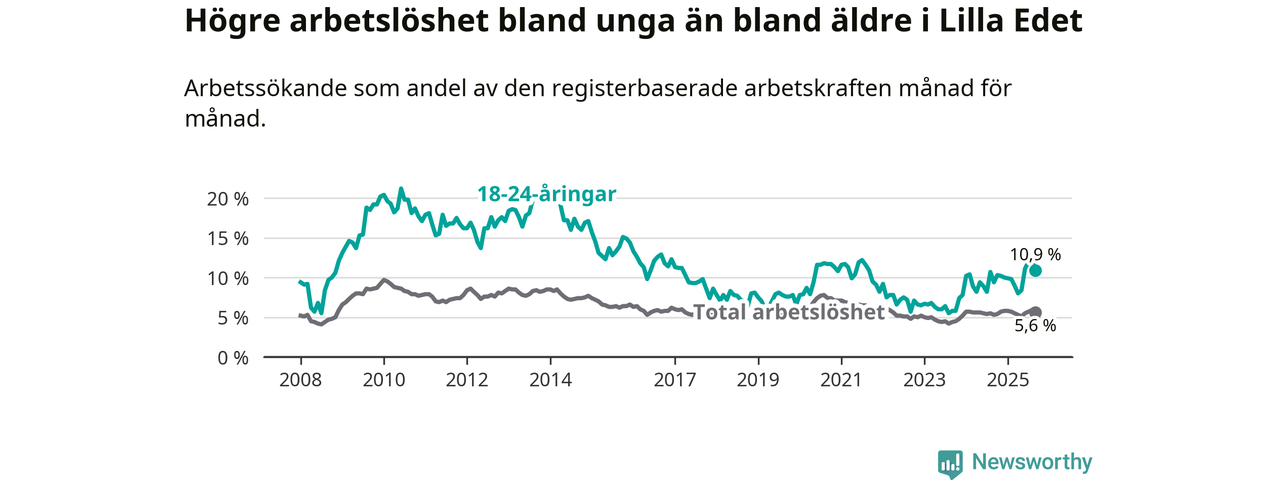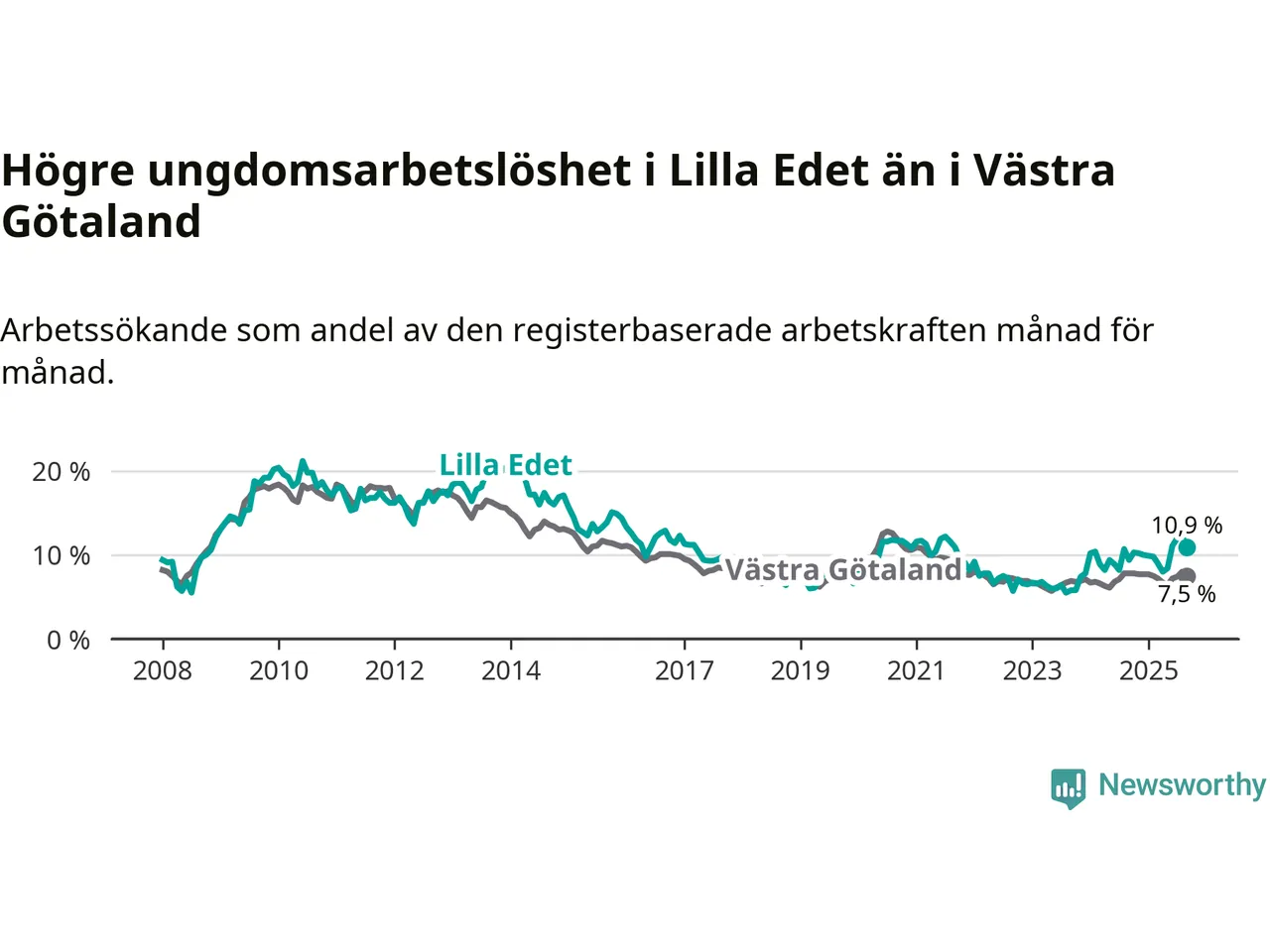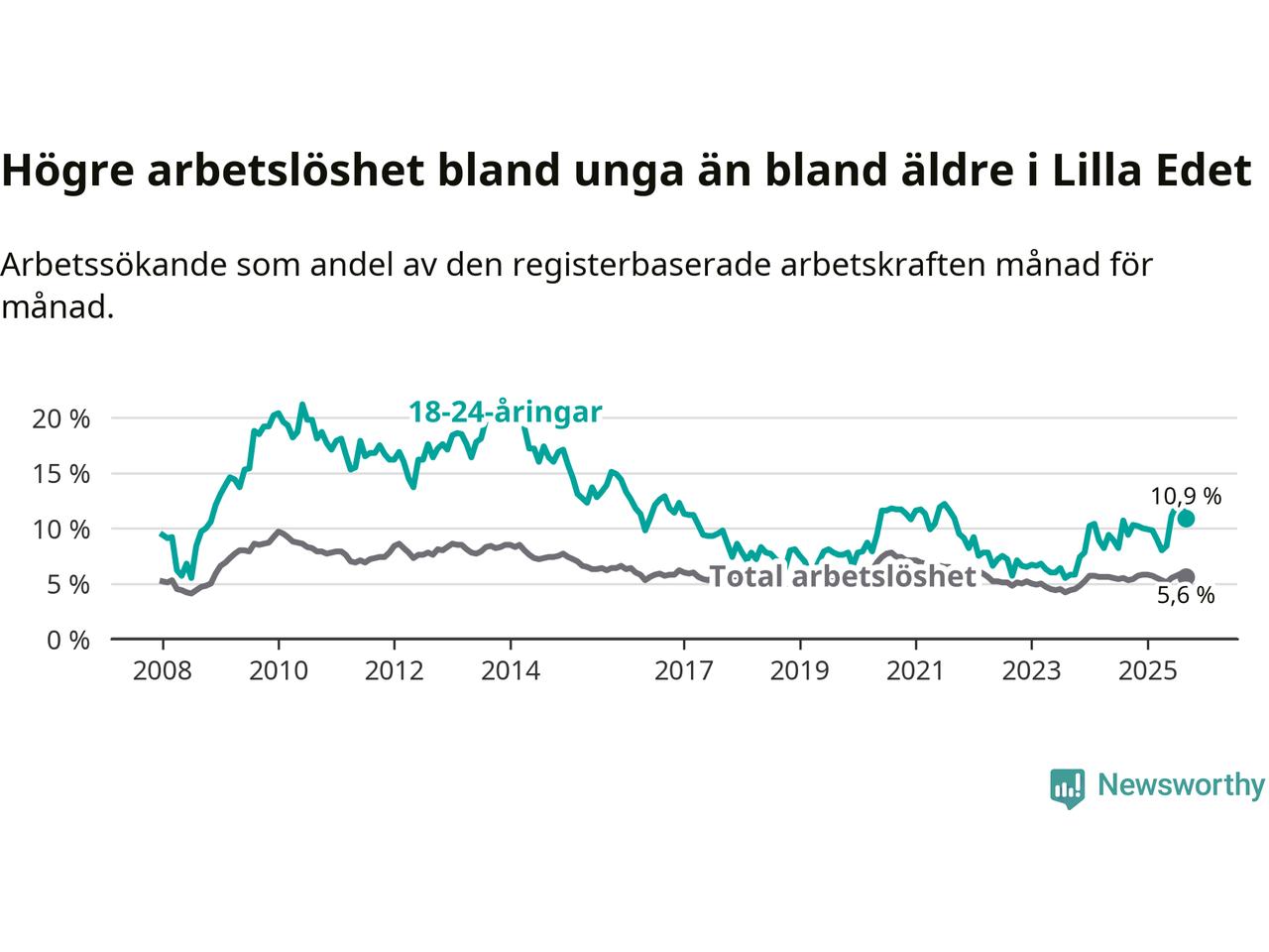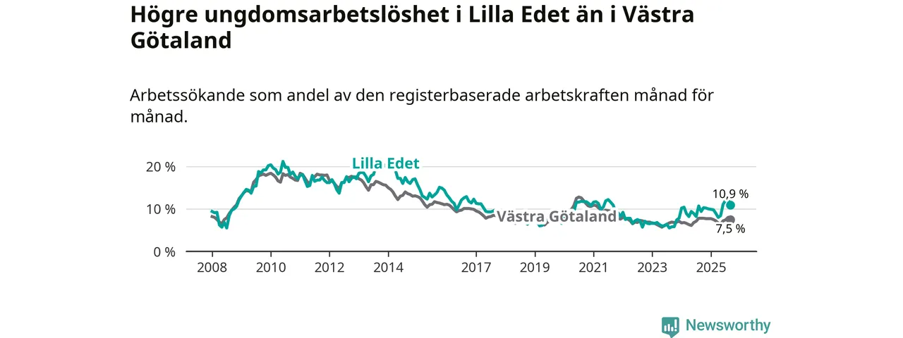 Medan Lilla Edet har lägre total arbetslöshet än Västra Götaland, ligger ungdomsarbetslösheten 3,4 procentenheter högre i Lilla Edet.