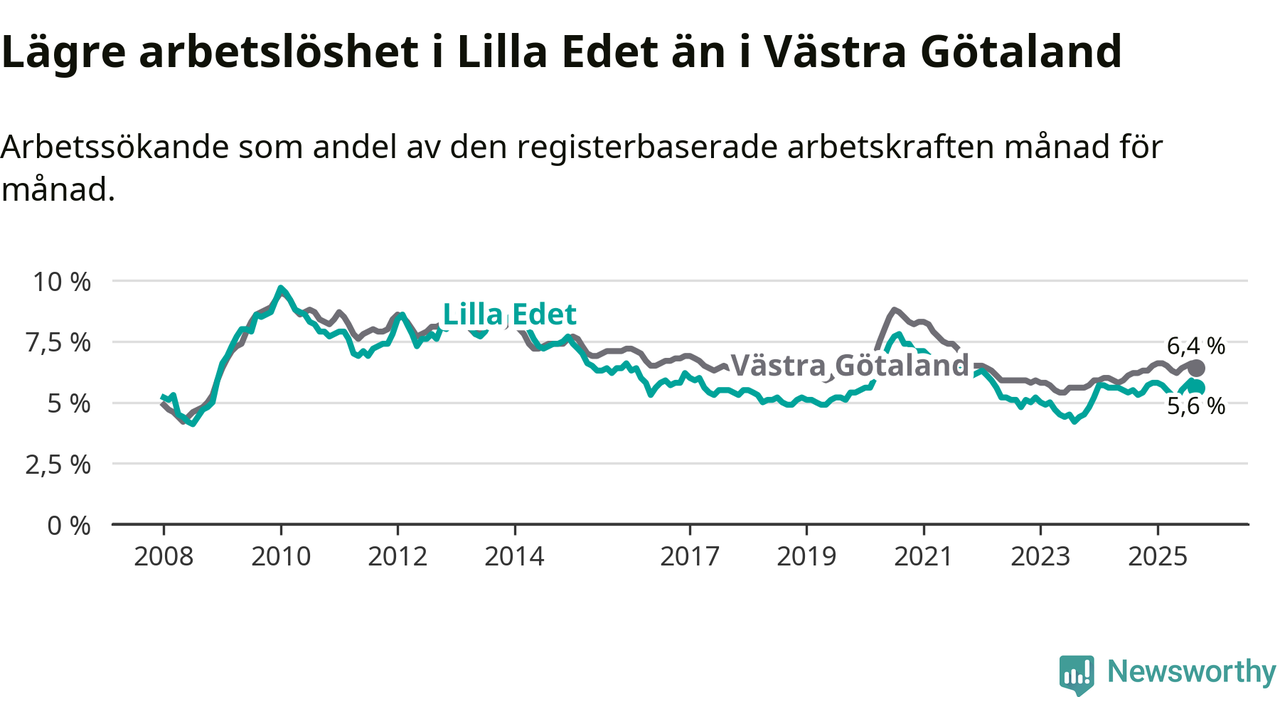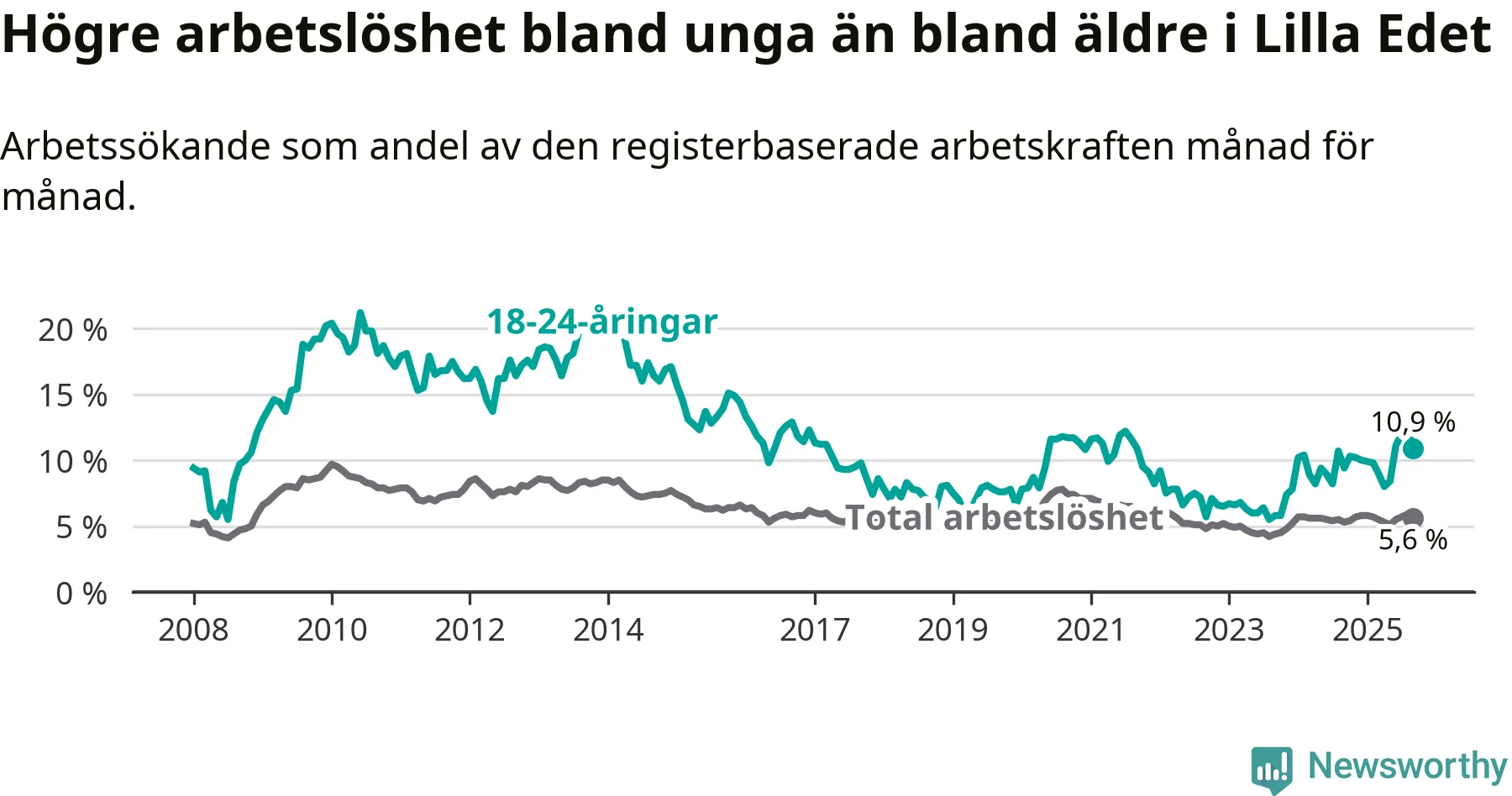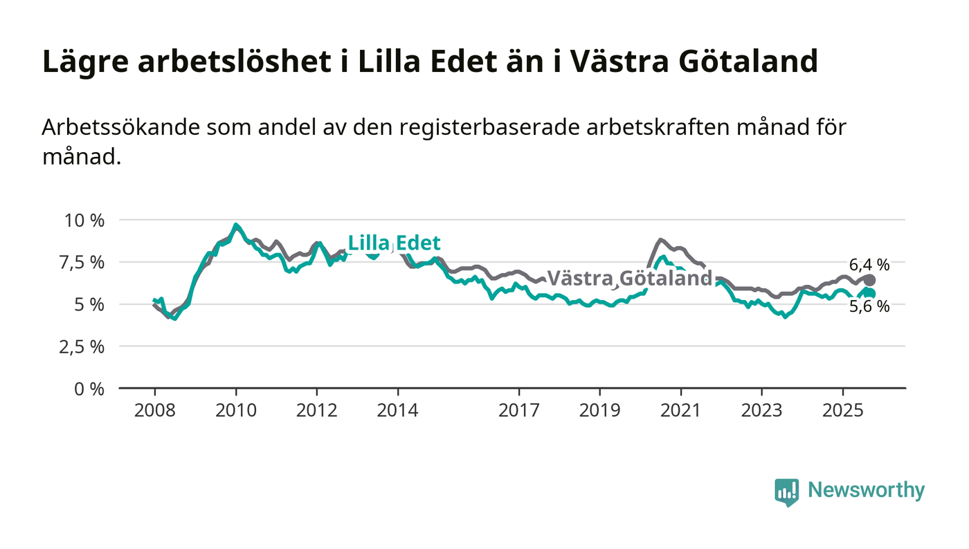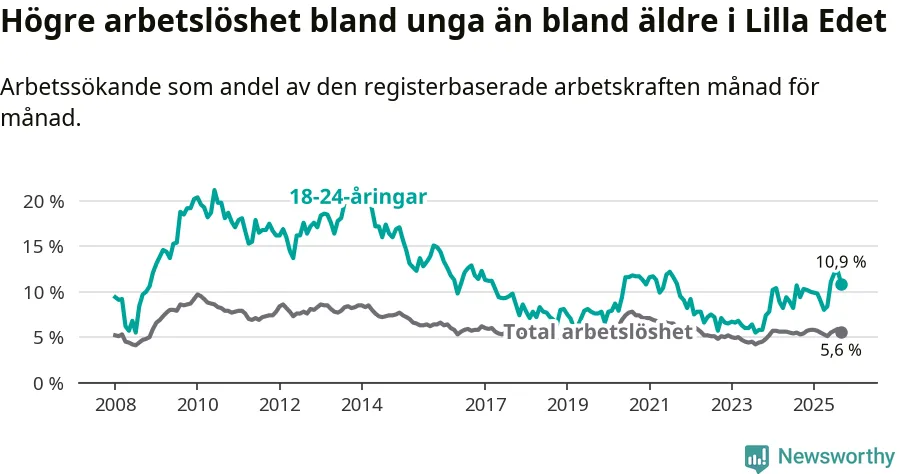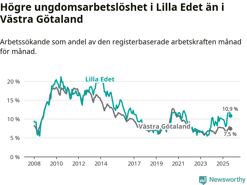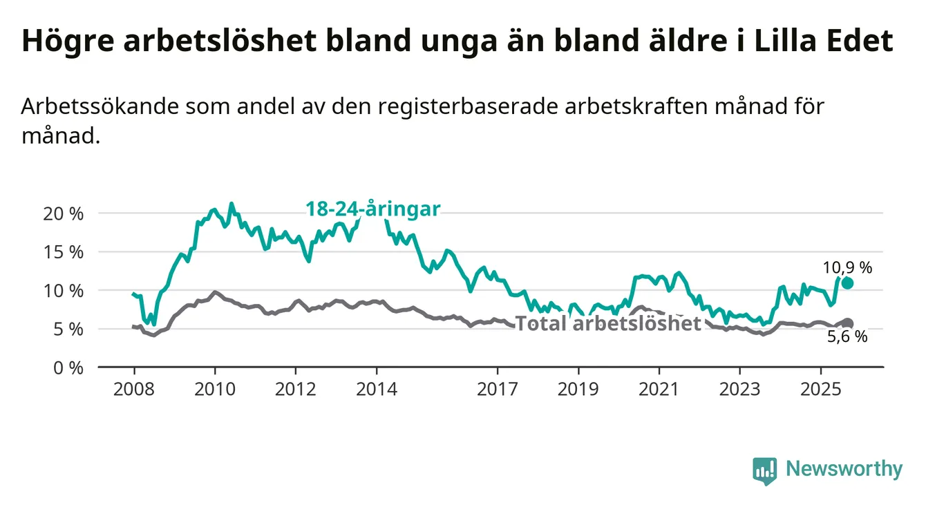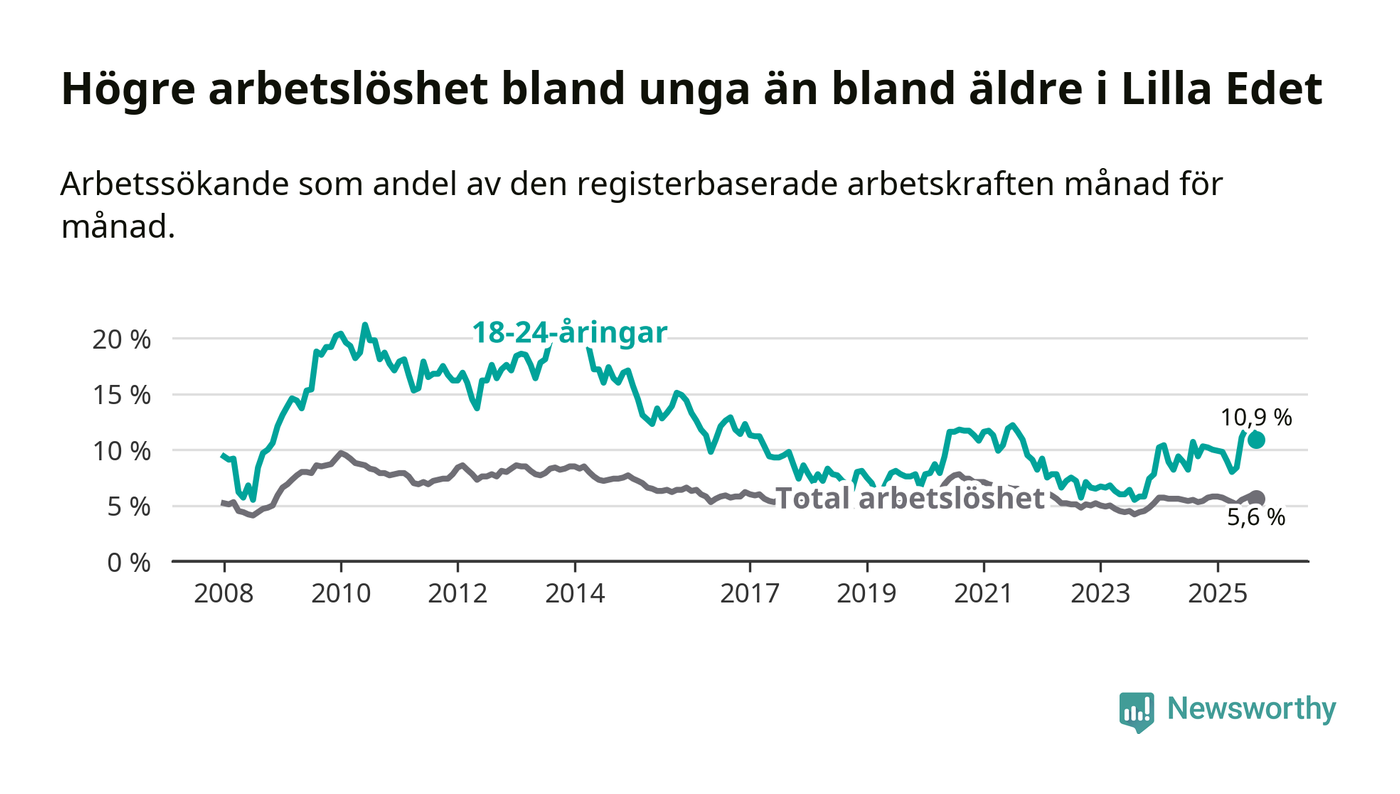 Medan Lilla Edet har lägre total arbetslöshet än Västra Götaland, ligger ungdomsarbetslösheten 3,4 procentenheter högre i Lilla Edet.