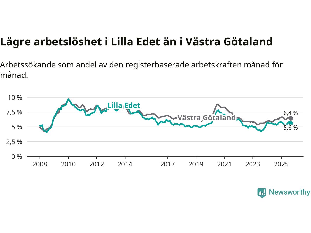 Under september månad rapporterade Lilla Edets kommun en total arbetslöshet på 5,6 procent. Det är en ökning jämfört med samma tidpunkt i fjol (+0,3 procentenheter). Även i Västra Götalands län stiger arbetslösheten .