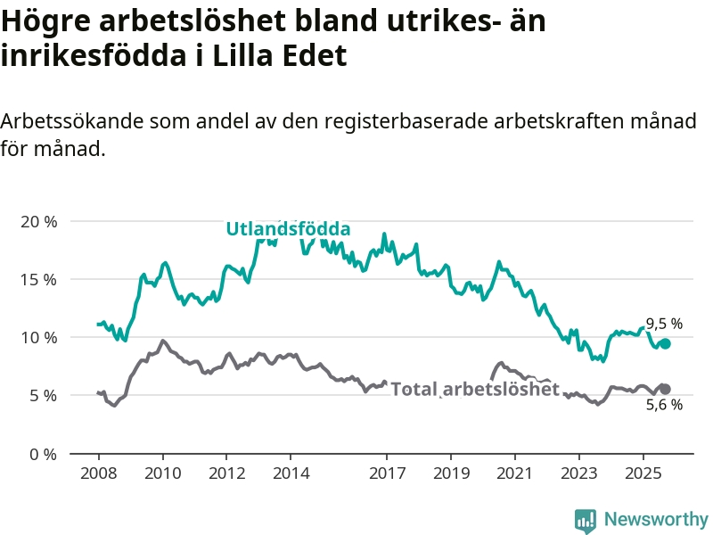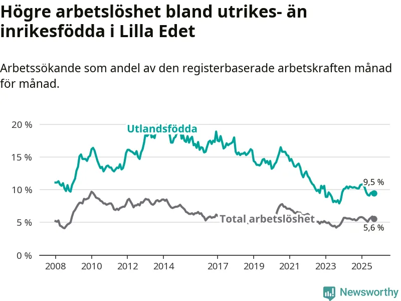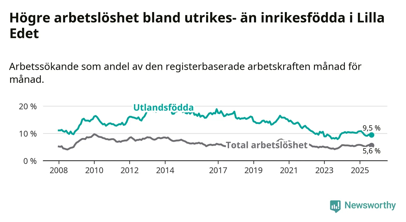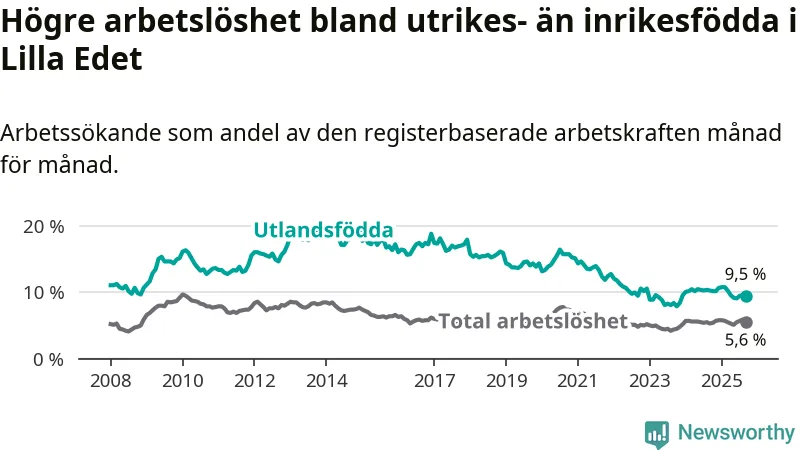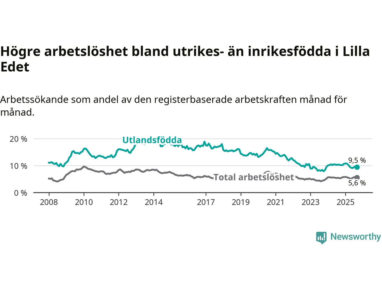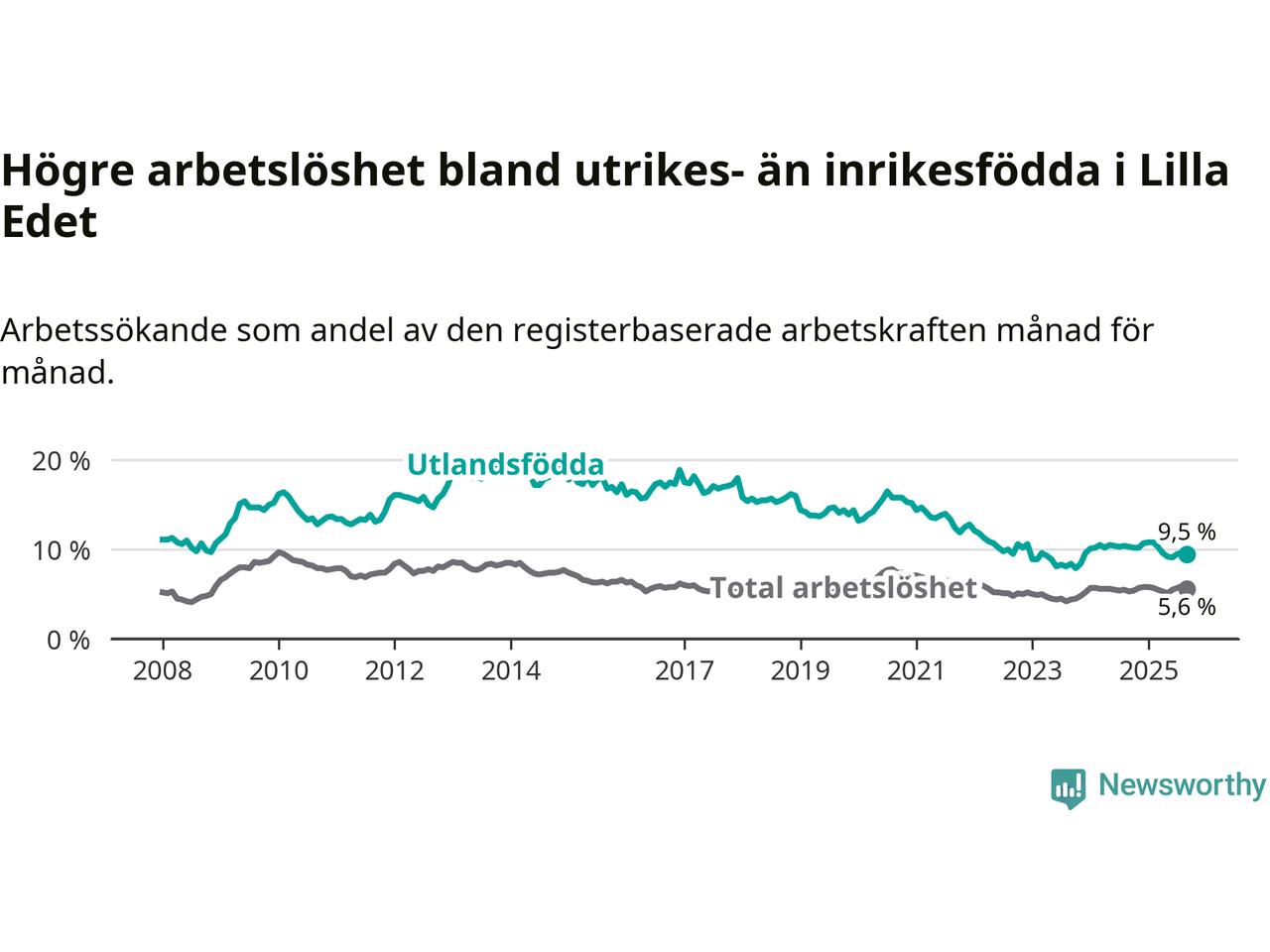 Arbetslösheten bland utlandsfödda var 9,5 procent i Lilla Edet under september månad, motsvarande 147 av 1 547 personer. Det är 0,8 procentenheter färre än vid samma tidpunkt i fjol (−10 om man räknar personer). Därmed är de utlandsföddas arbetslöshet lägre än vid samma tidpunkt i fjol för sjunde månaden i följd. Sedan februari har arbetslösheten bland utlandsfödda minskat från 10,8 till 9,5 procent.