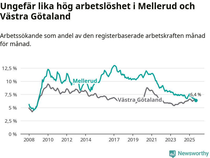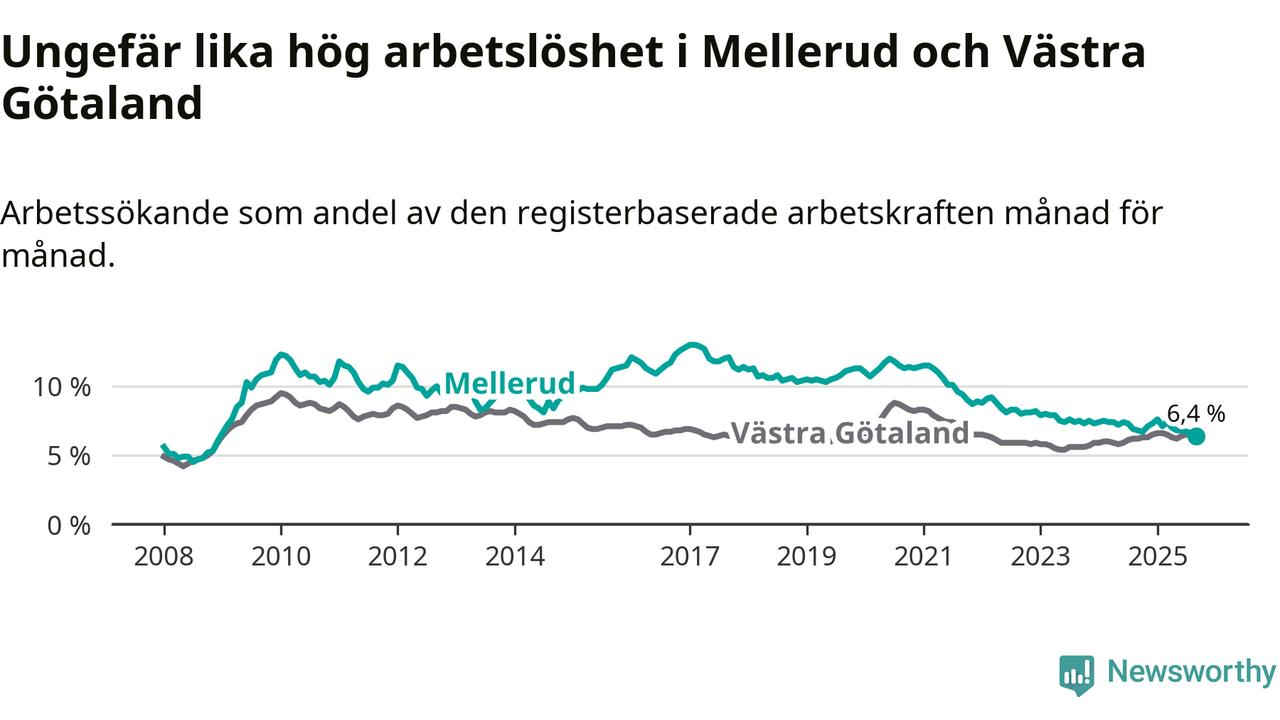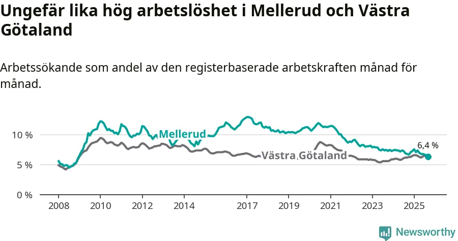 Under september månad rapporterade Melleruds kommun en total arbetslöshet på 6,4 procent. Det är en minskning jämfört med samma tidpunkt i fjol (−0,4 procentenheter). I Västra Götalands län däremot stiger arbetslösheten .