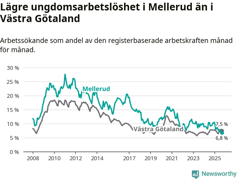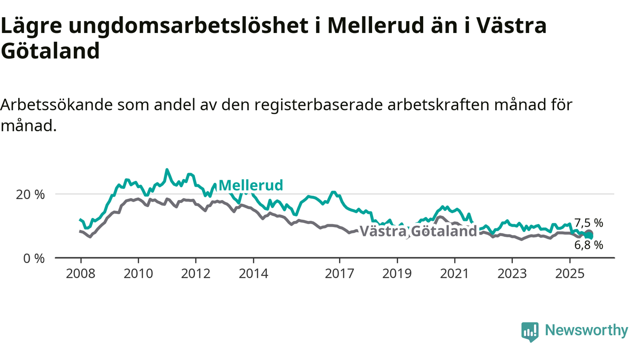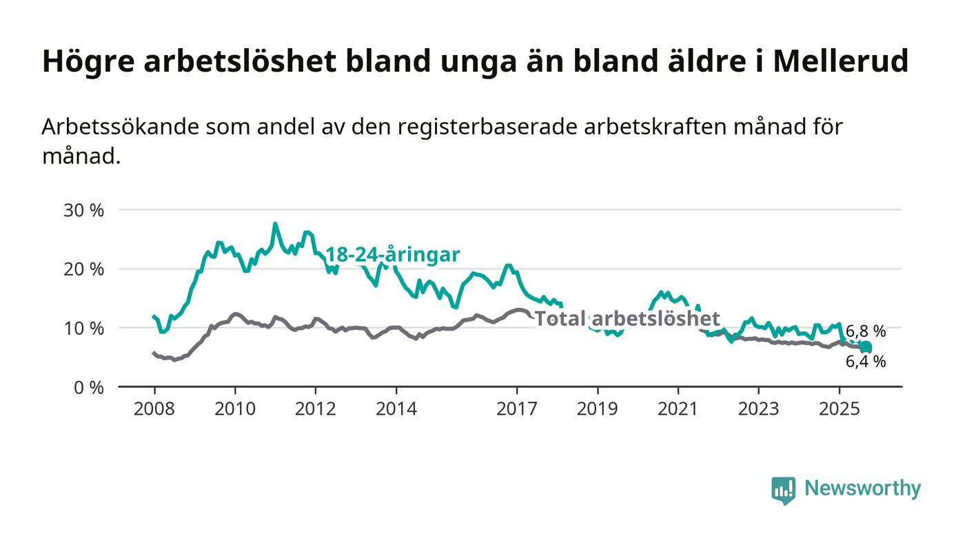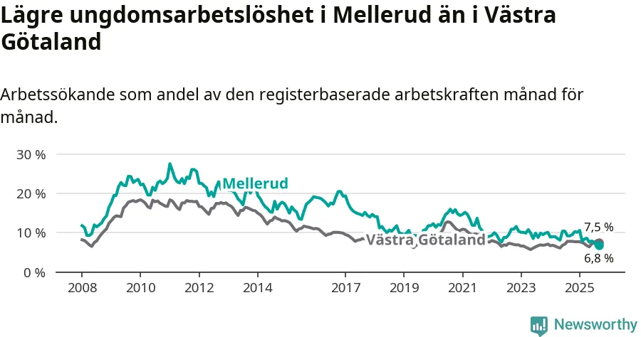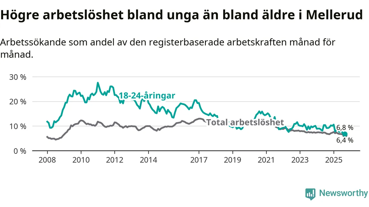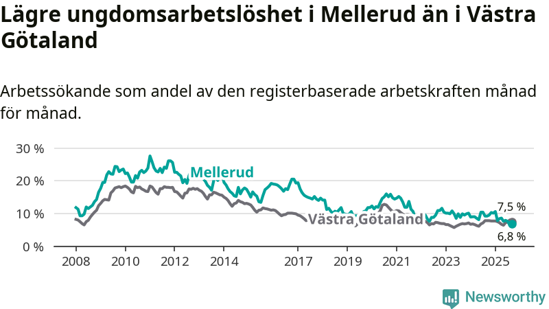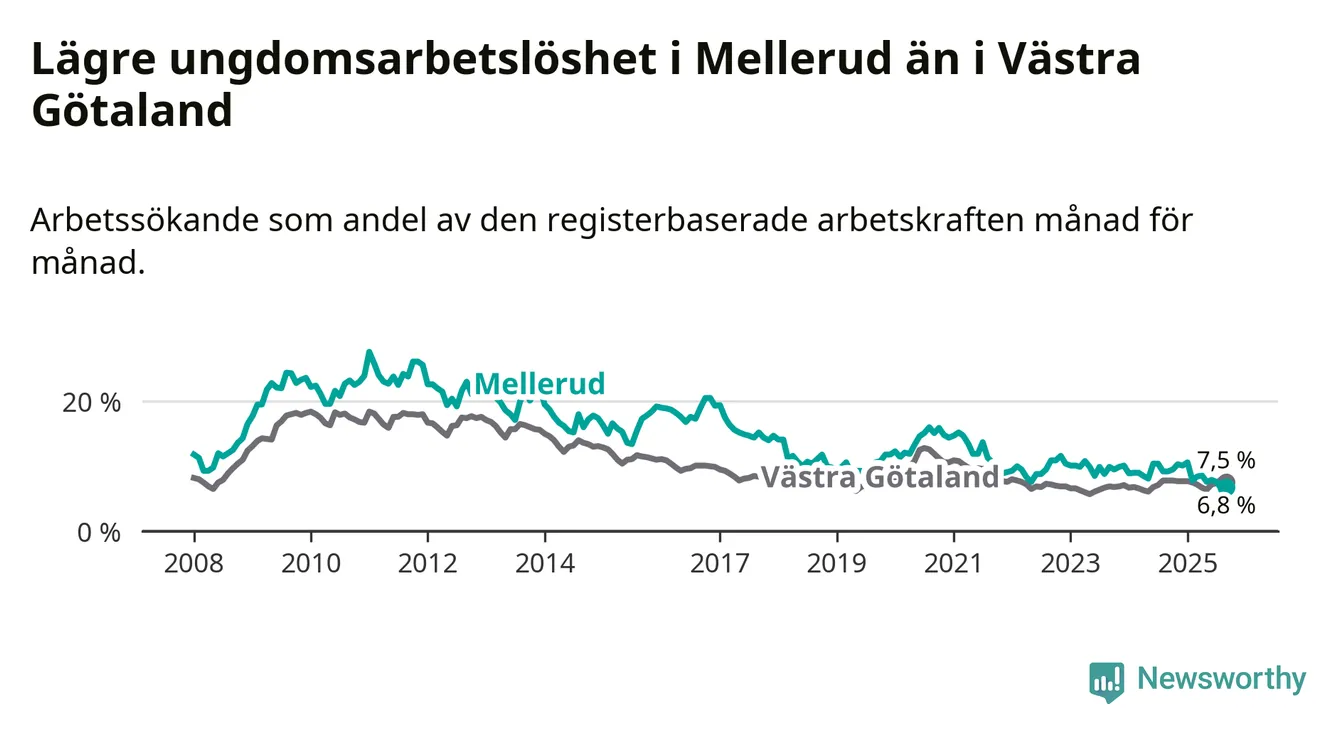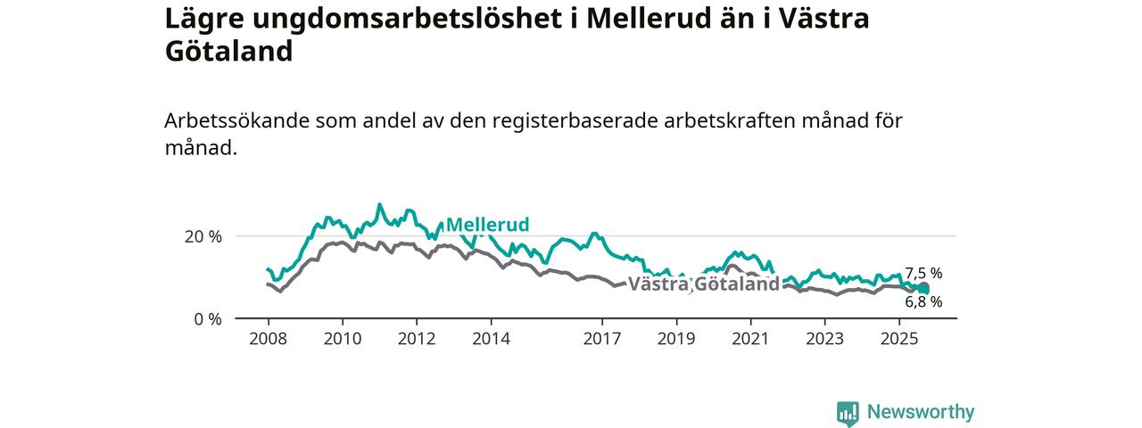 Medan Mellerud har ungefär samma total arbetslöshet som Västra Götaland, ligger ungdomsarbetslösheten 0,7 procentenheter lägre i Mellerud.