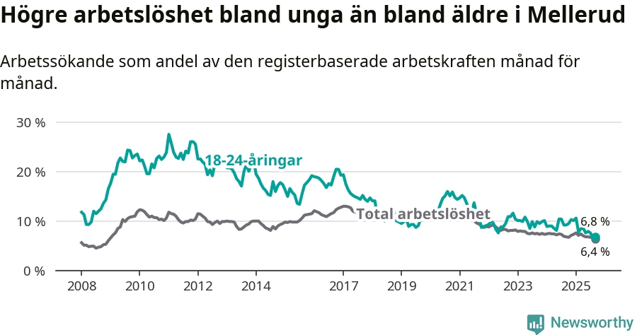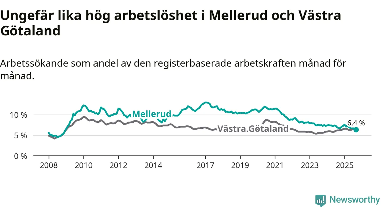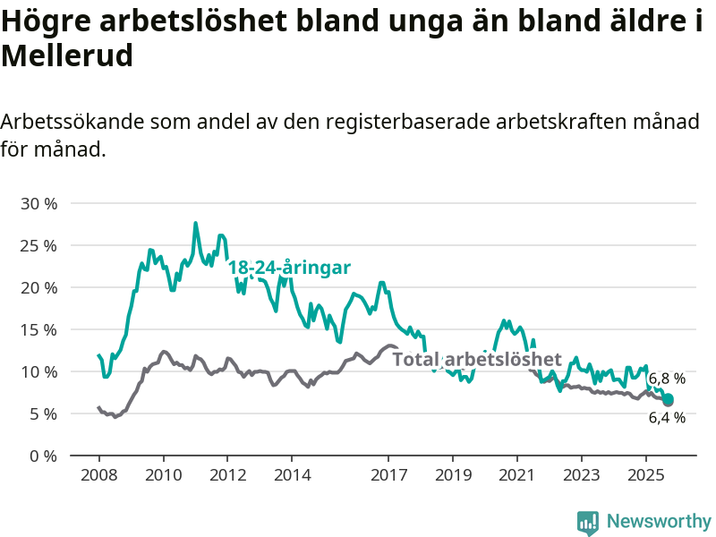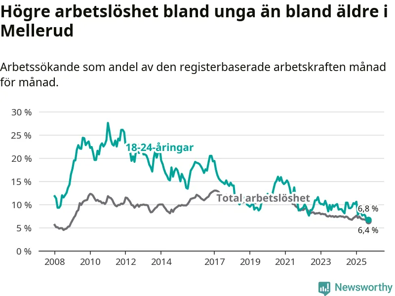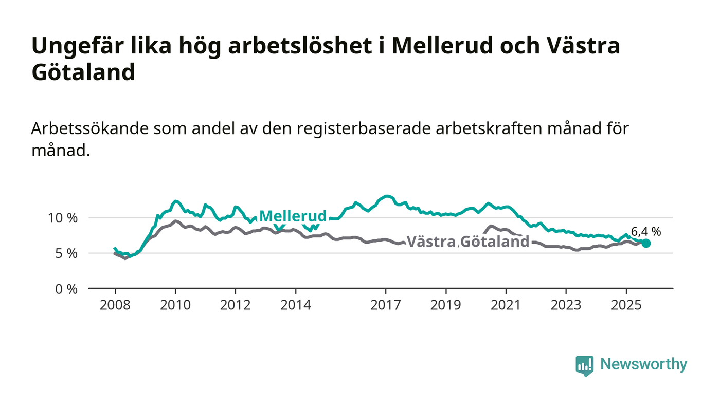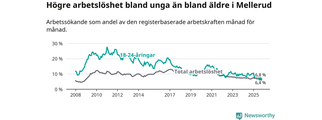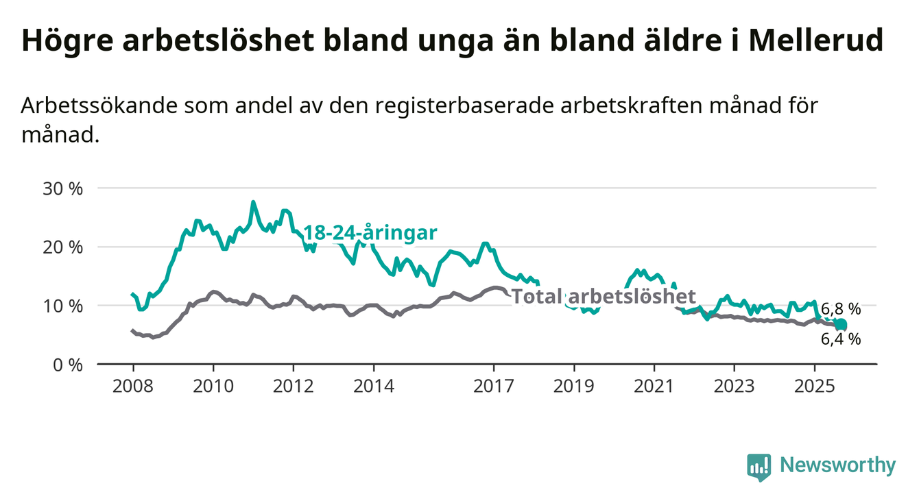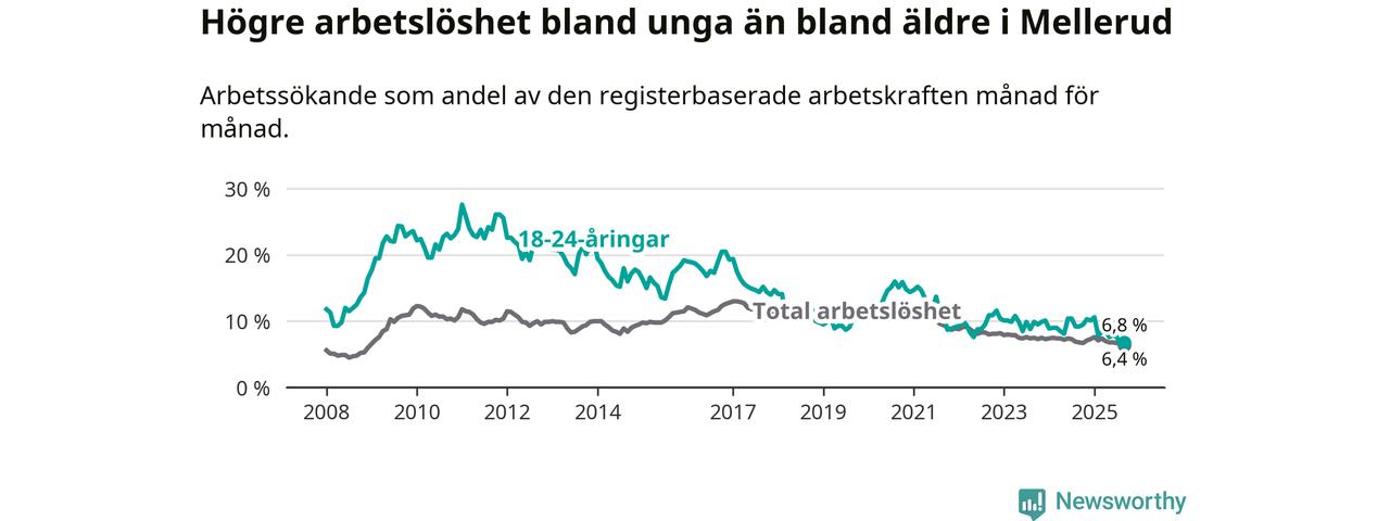 Medan Mellerud har ungefär samma total arbetslöshet som Västra Götaland, ligger ungdomsarbetslösheten 0,7 procentenheter lägre i Mellerud.