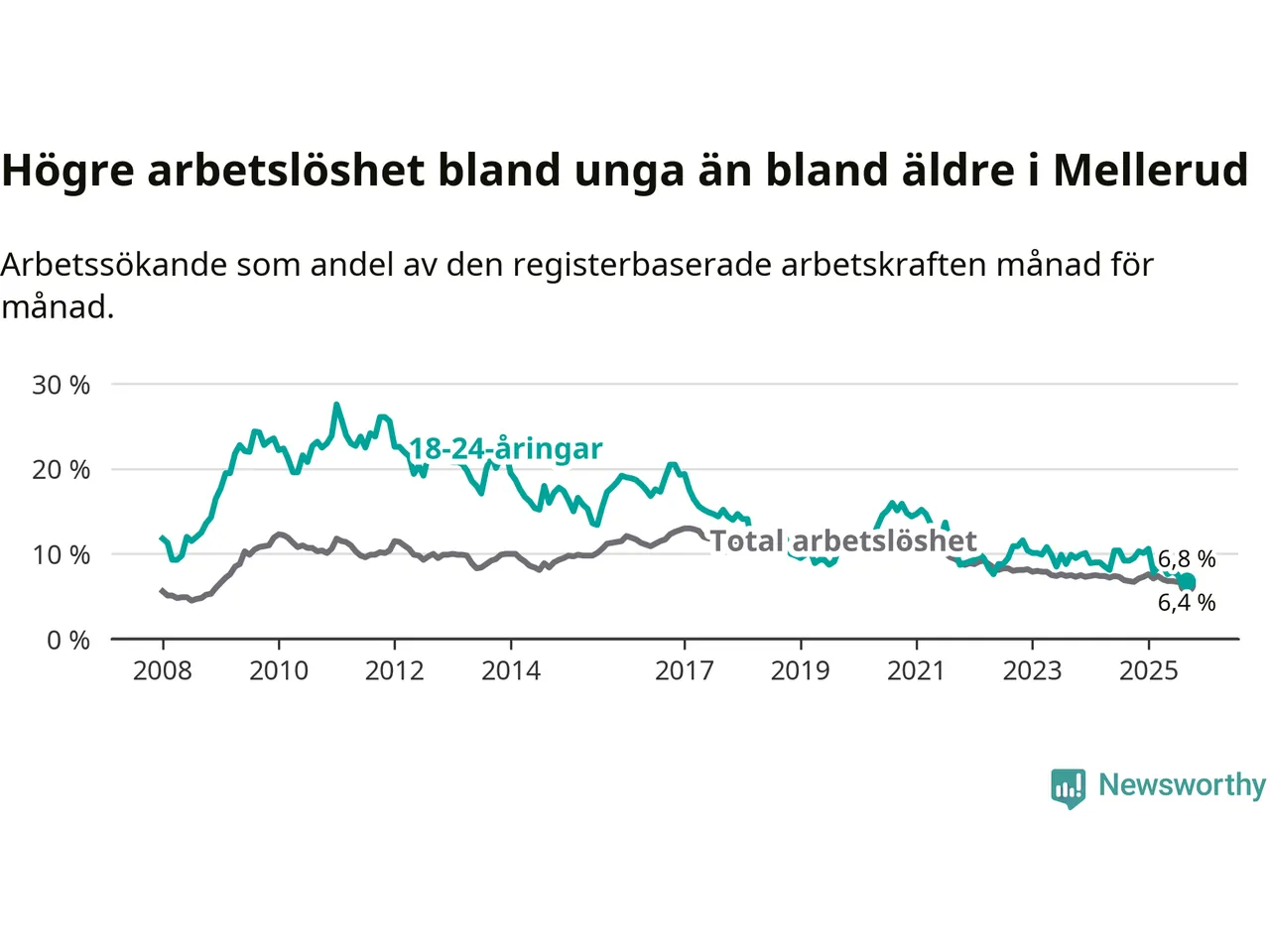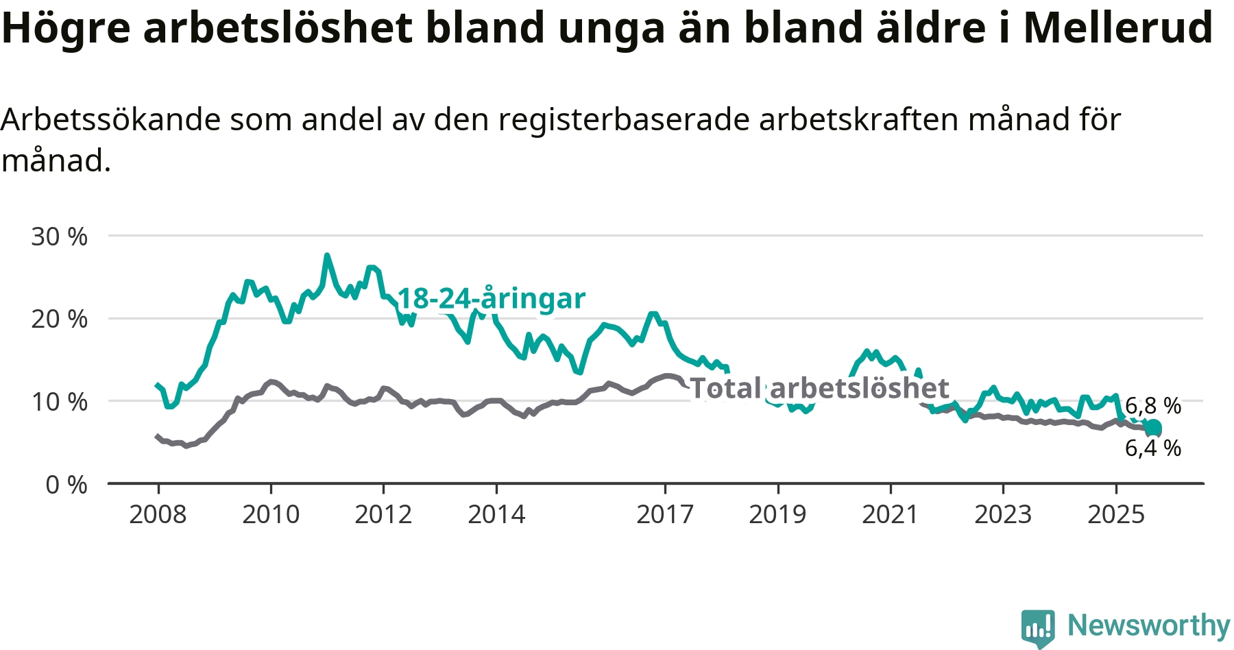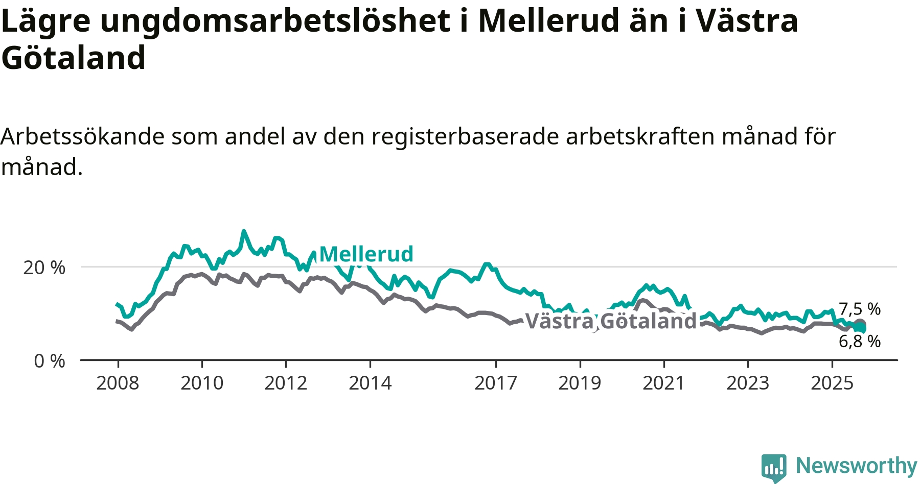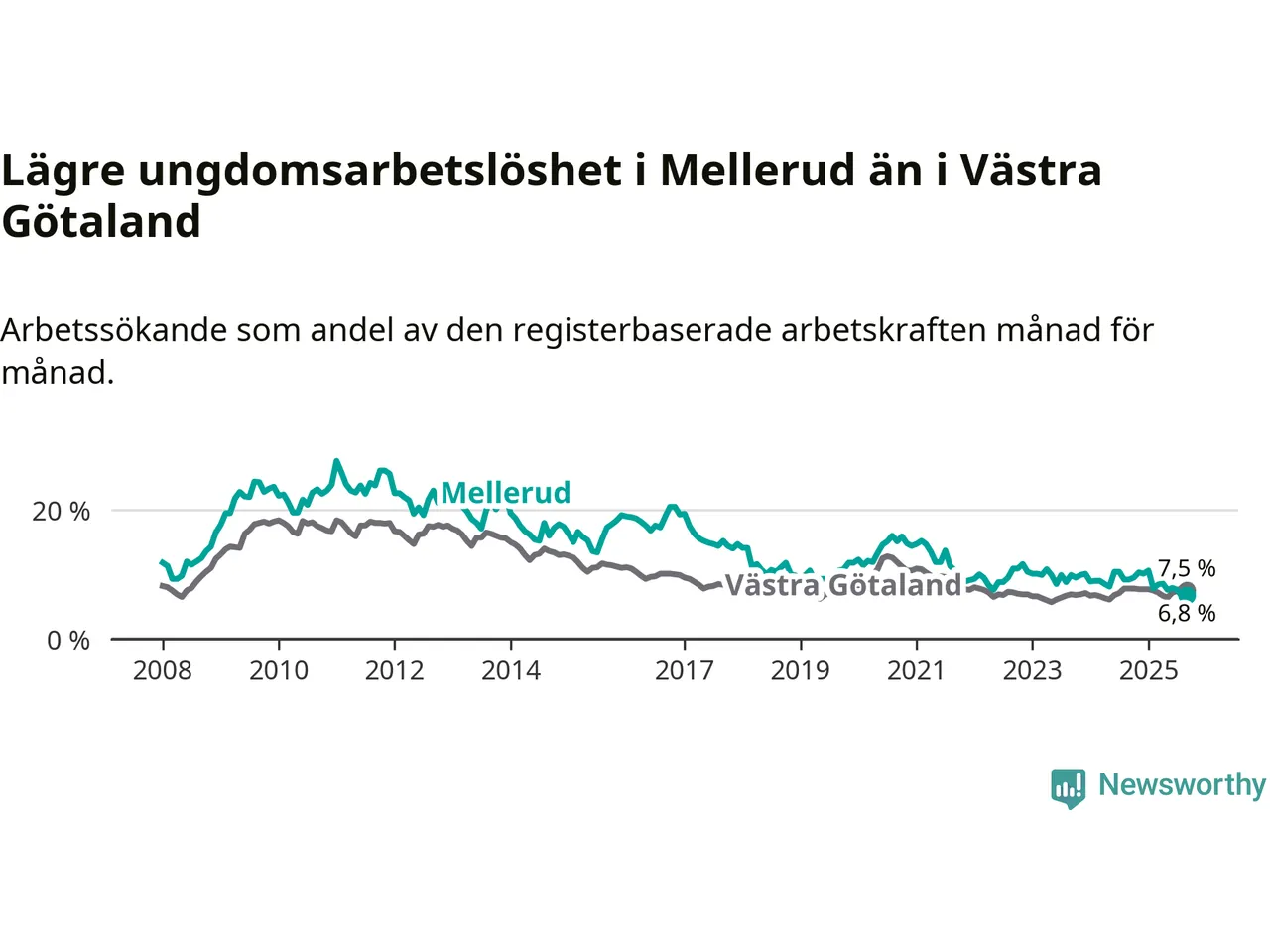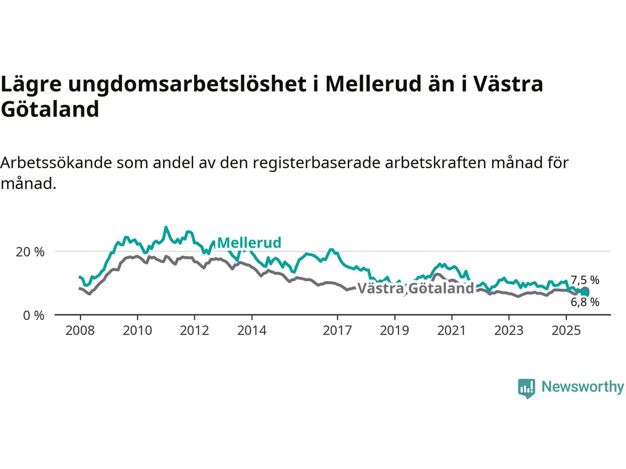Medan Mellerud har ungefär samma total arbetslöshet som Västra Götaland, ligger ungdomsarbetslösheten 0,7 procentenheter lägre i Mellerud.