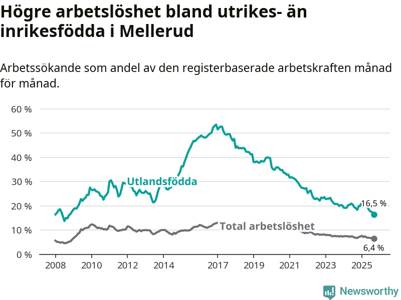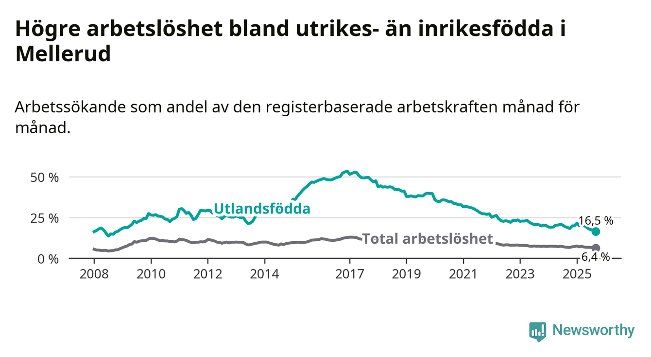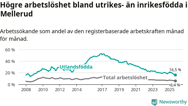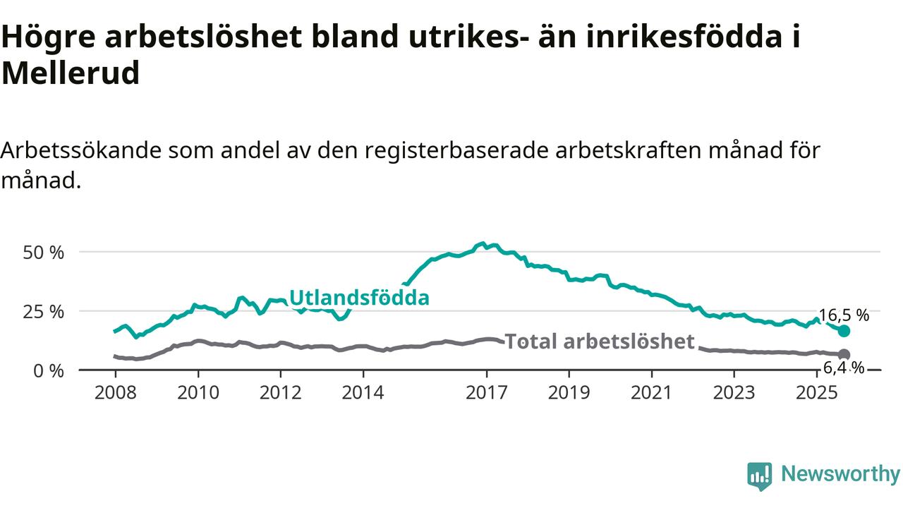 Skillnaden i arbetslöshet mellan utrikesfödda och hela befolkningen är 10,1 procentenheter i Mellerud. Det är en betydligt mindre skillnad än för ett år sedan (−2,1 procentenheter).