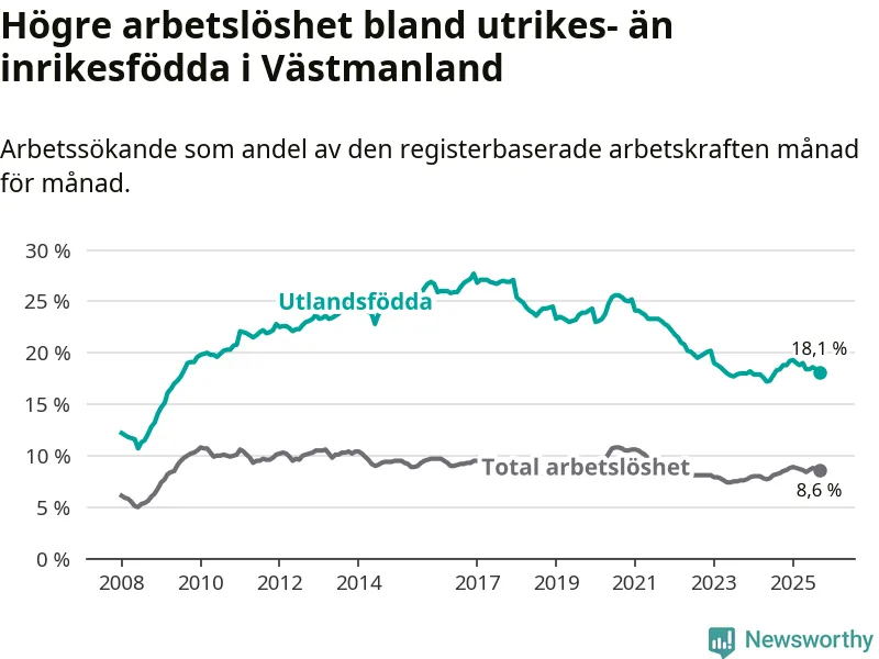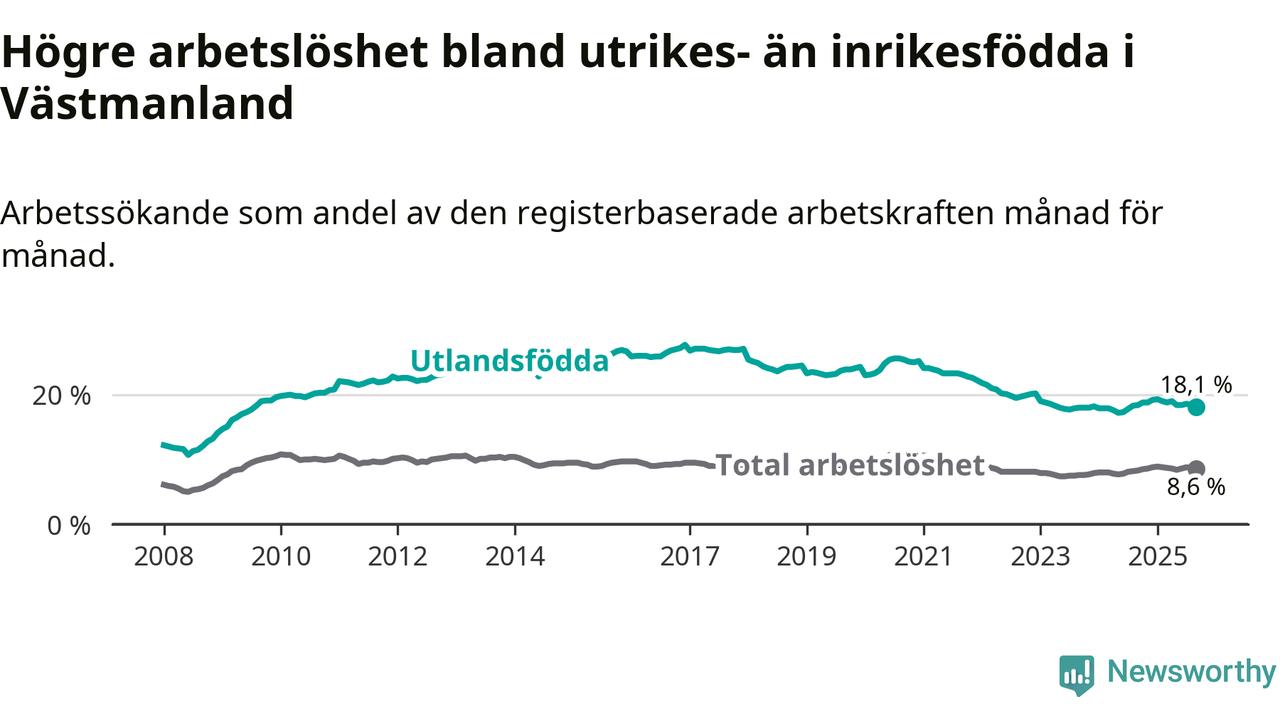 Arbetslösheten bland utlandsfödda var 18,1 procent i Västmanland under september månad, motsvarande 6 649 av 36 735 personer. Det är 0,3 procentenheter färre än vid samma tidpunkt i fjol (+16 om man räknar personer). Den senaste månadens nedgång innebär ett trendbrott. Under de 14 föregående månaderna hade arbetslösheten bland utlandsfödda varit högre än motsvarande tidpunkt året innan.
