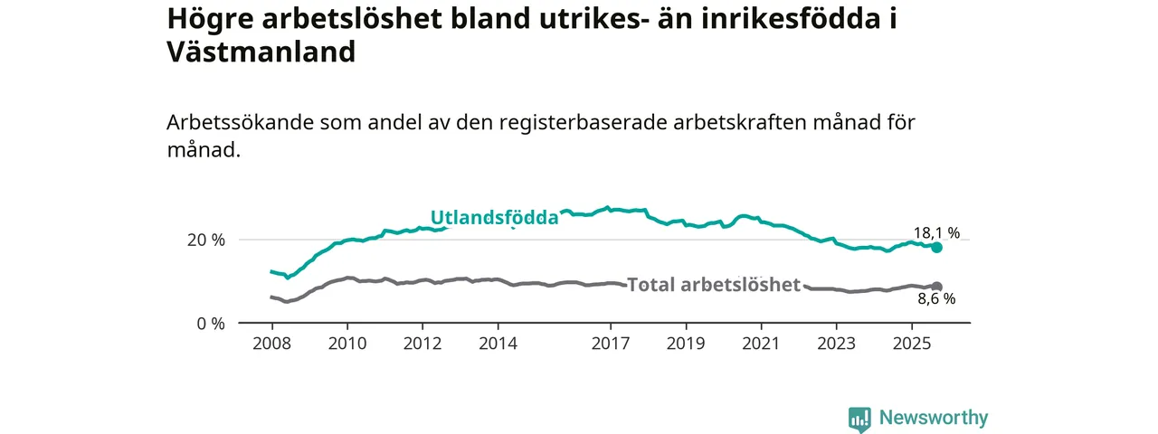 Skillnaden i arbetslöshet mellan utrikesfödda och hela befolkningen är 9,5 procentenheter i Västmanland. Det är en mindre skillnad än för ett år sedan (−0,6 procentenheter).