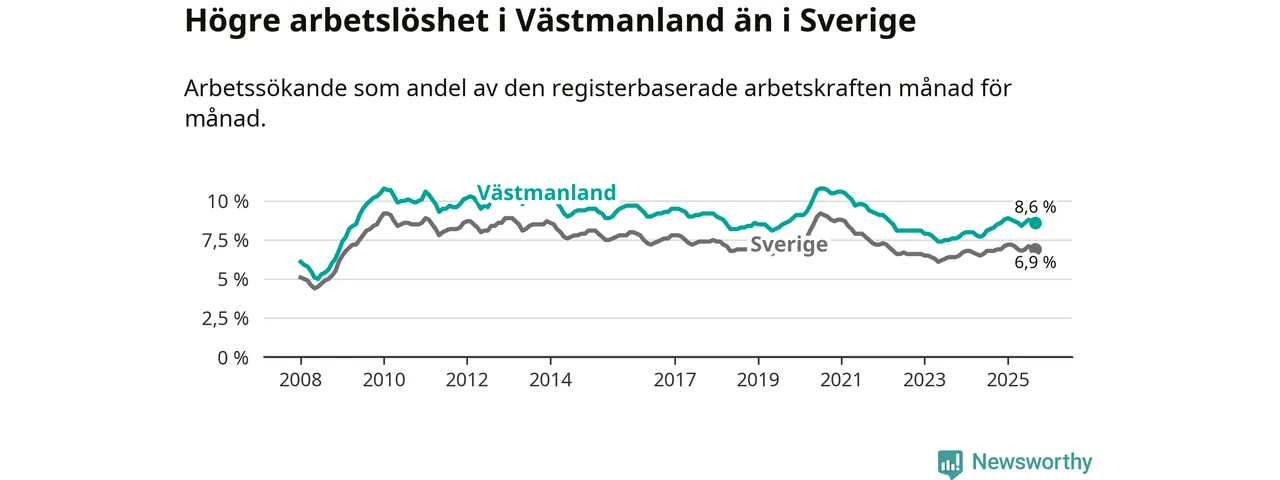 Västmanland hade redan tidigare högre arbetslöshet än snittet i hela Sverige och nu växer klyftan (8,6 procent i länet, jämfört med 6,9 procent i hela riket). Norrbotten har den lägsta arbetslösheten i riket (3,8 procent), medan Skåne har den högsta (8,9 procent). För att Västmanland skulle komma ner i samma arbetslöshetsnivå som Norrbotten skulle 6 567 personer behöva sysselsättas.
