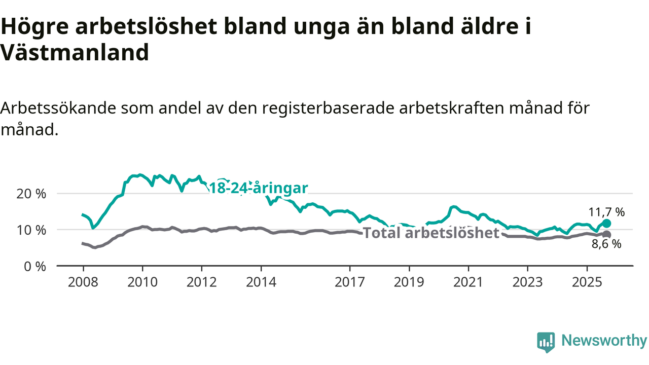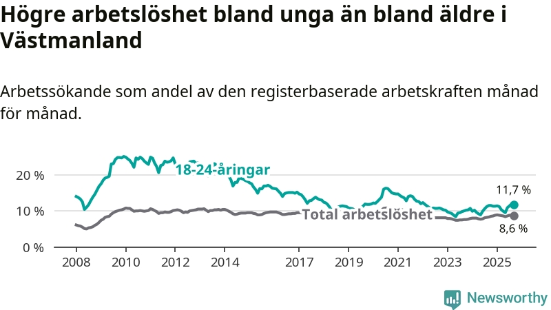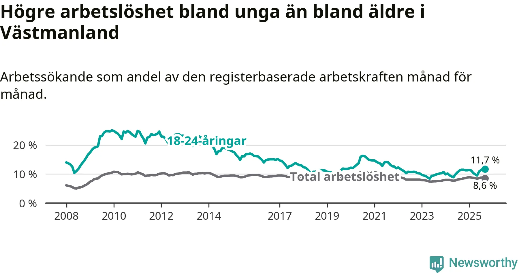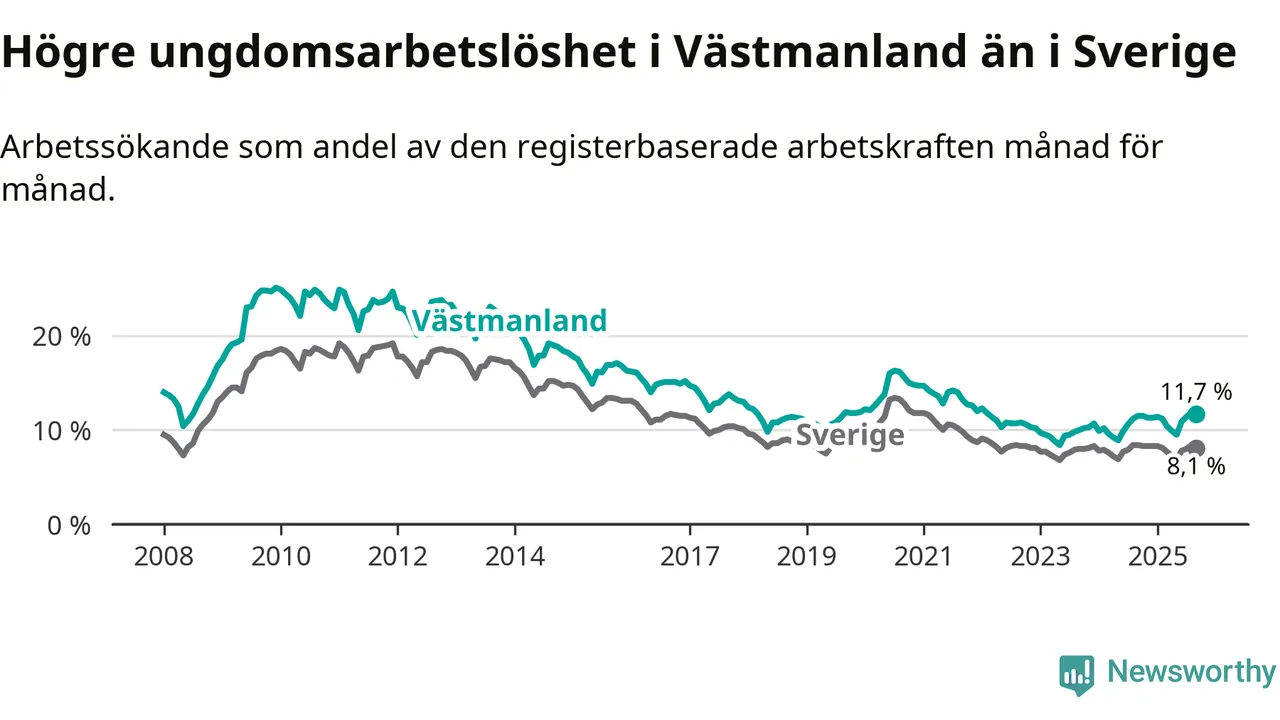 I och med den senaste månadens uppgång har de ungas arbetslöshet i Västmanland stigit 22 månader i följd (upp från 10,3 procent i november 2023 till 11,7 procent nu).