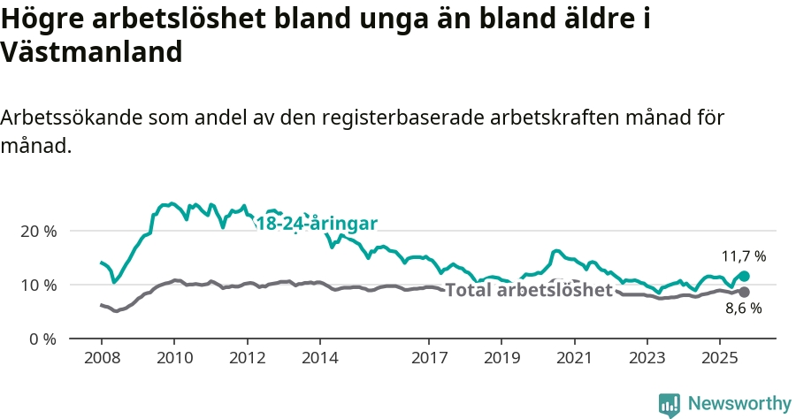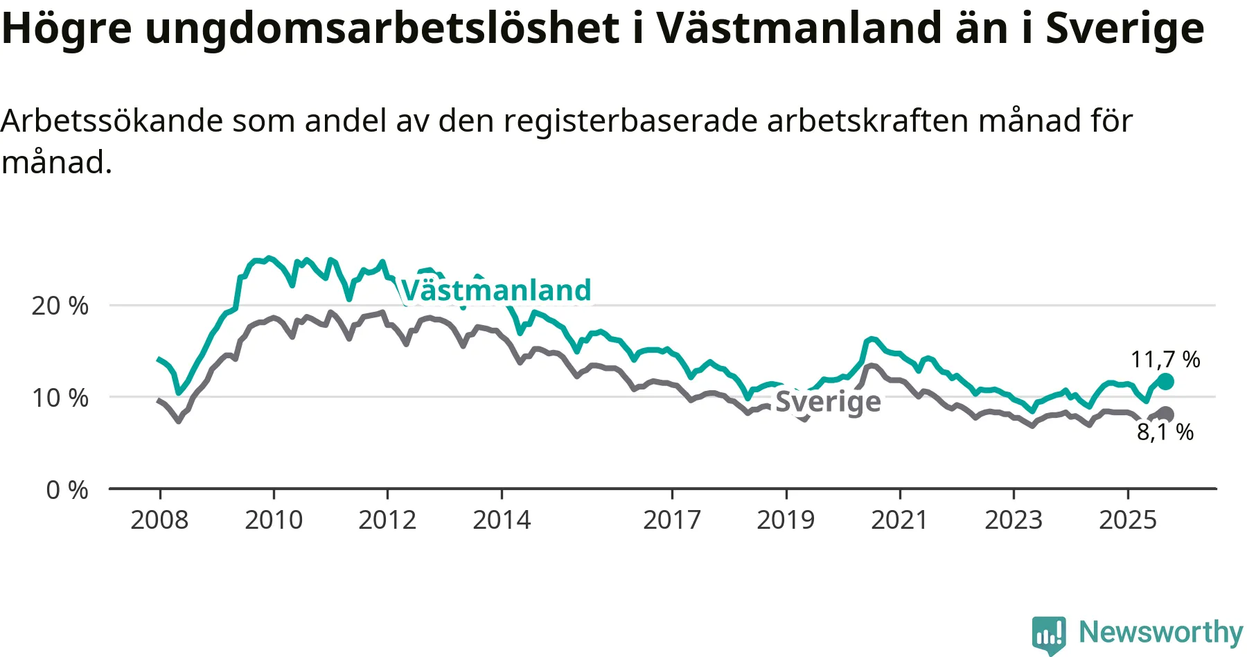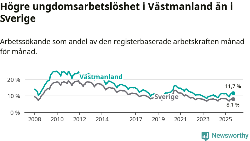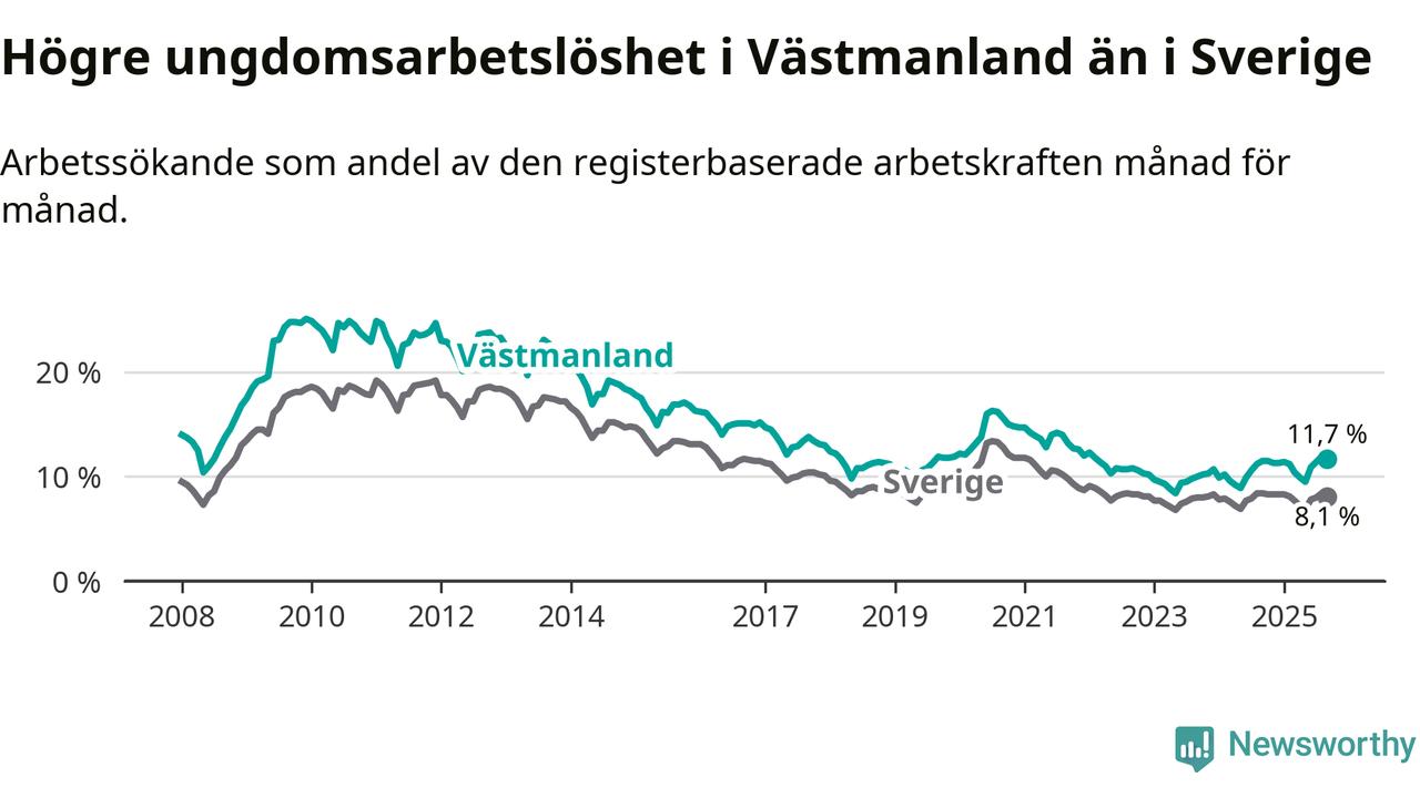 Precis som den totala arbetslösheten ligger ungdomsarbetslösheten i Västmanland högre än i Sverige som helhet. Skillnaden mellan länet och riket är 3,6 procentenheter.
