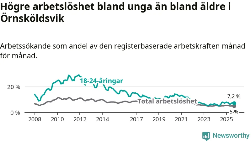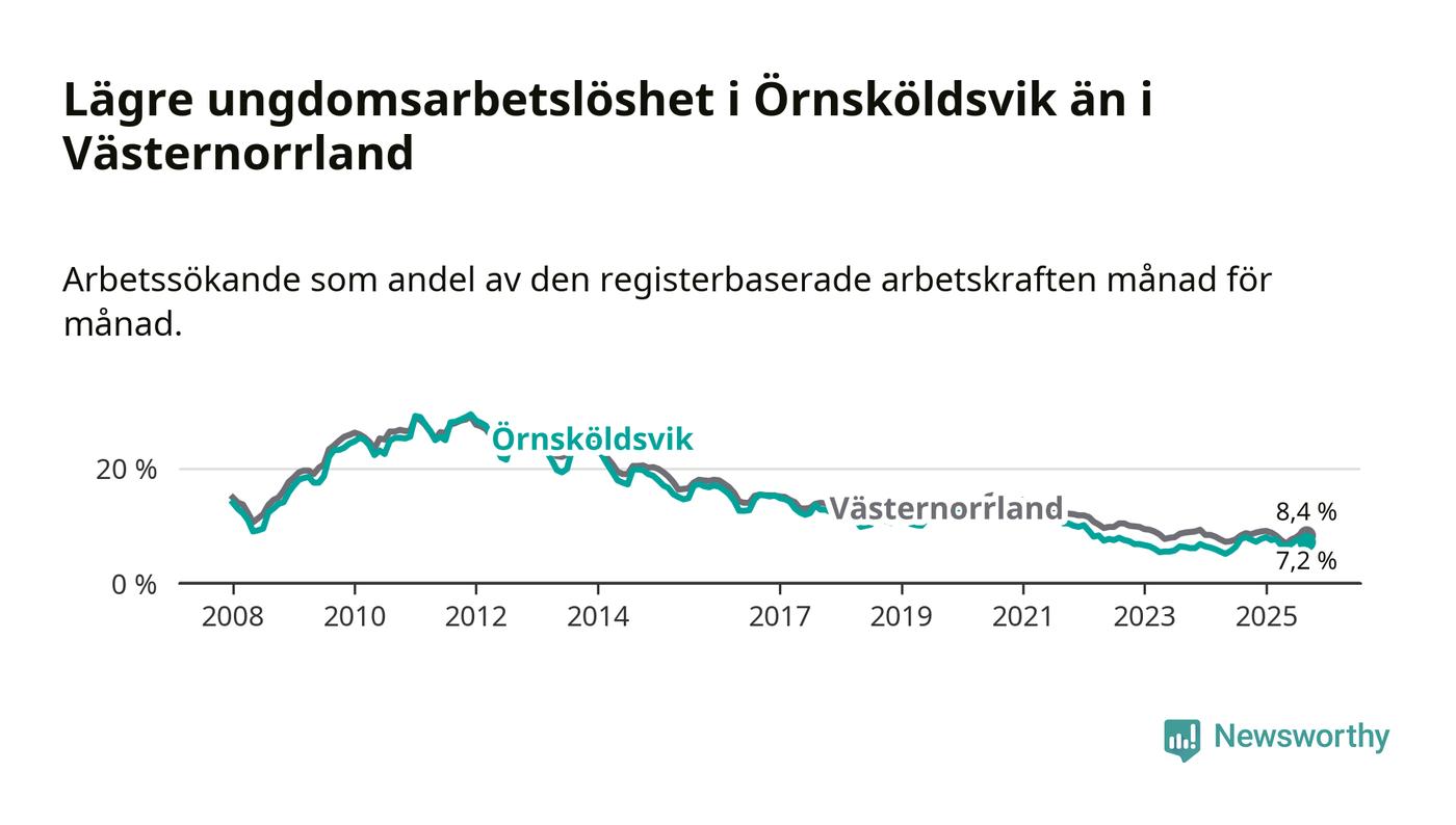 Precis som den totala arbetslösheten ligger ungdomsarbetslösheten i Örnsköldsvik lägre än i Västernorrland som helhet. Skillnaden mellan kommunen och länet är 1,2 procentenheter.