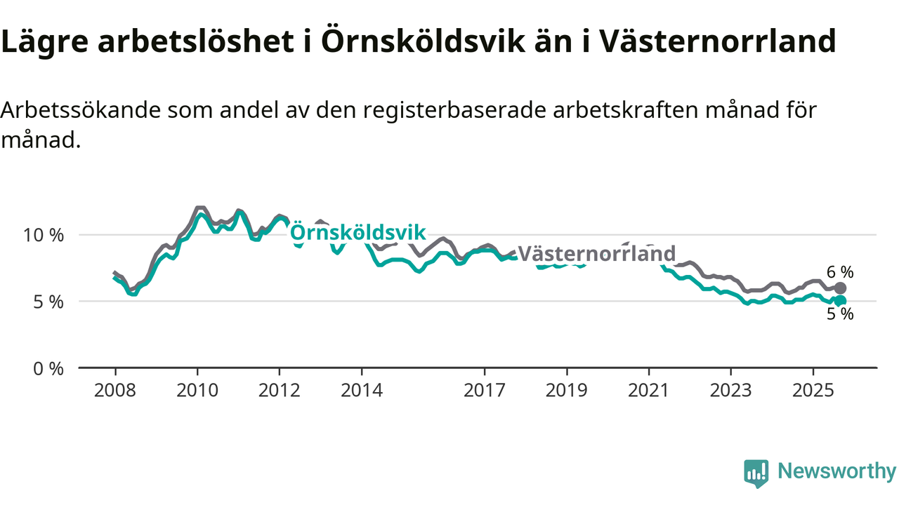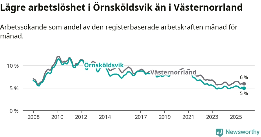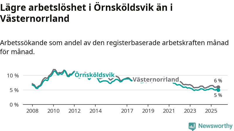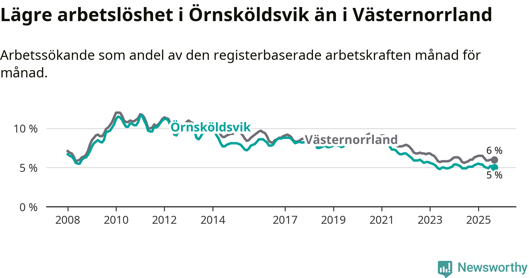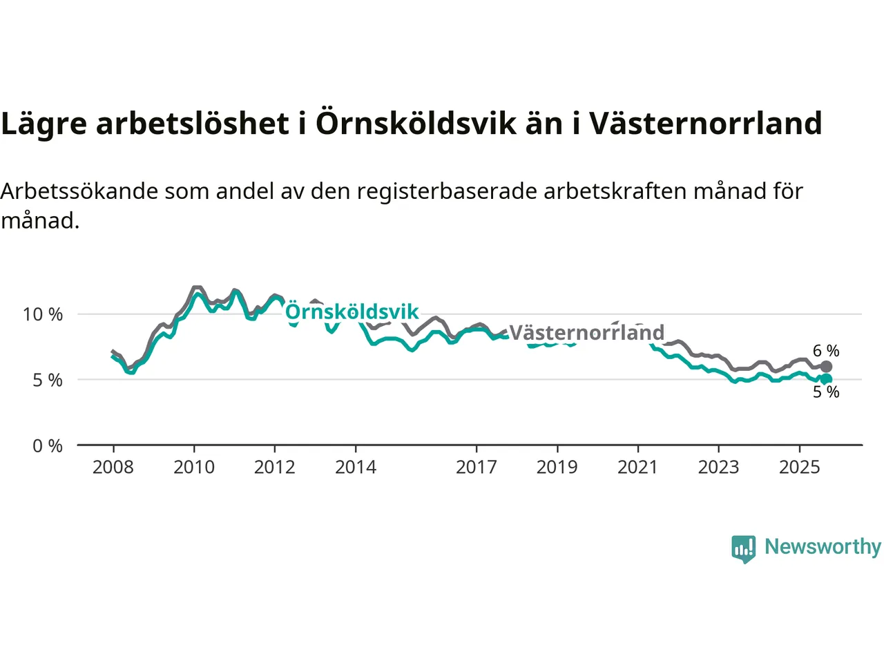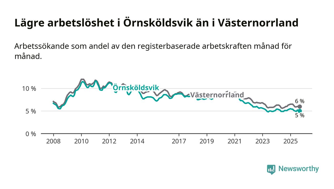 Örnsköldsvik hade redan tidigare lägre arbetslöshet än snittet i hela Västernorrlands län och nu växer klyftan (5,0 procent i kommunen, jämfört med 6,0 procent i hela länet). Örnsköldsvik har därmed även den lägsta arbetslöshetsnivån i länet. Härnösand har den högsta (8,5 procent).