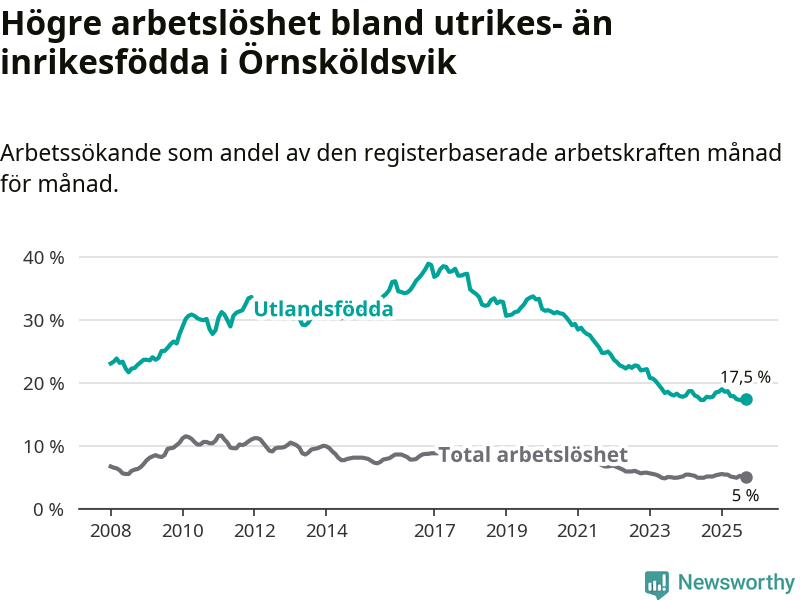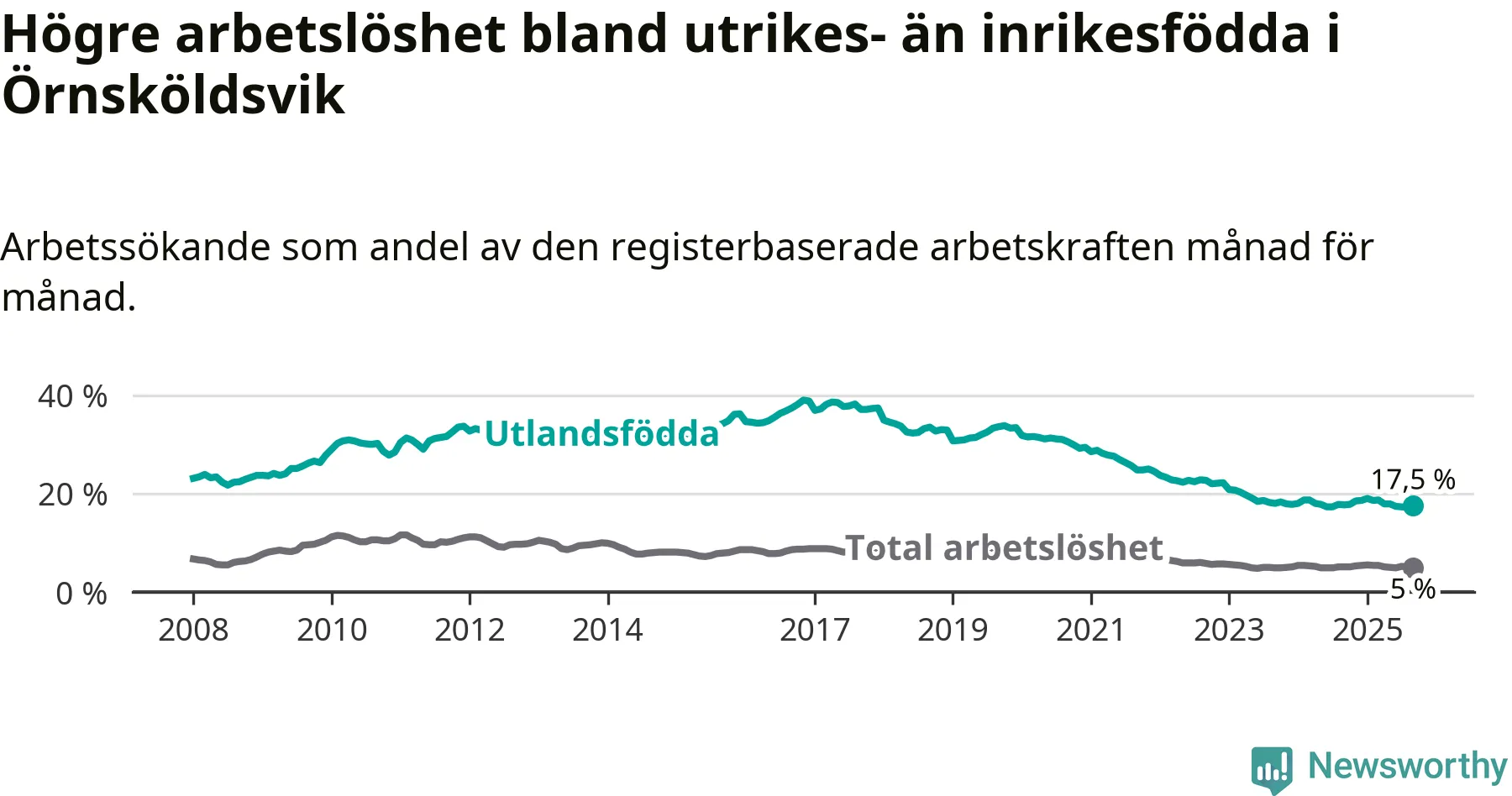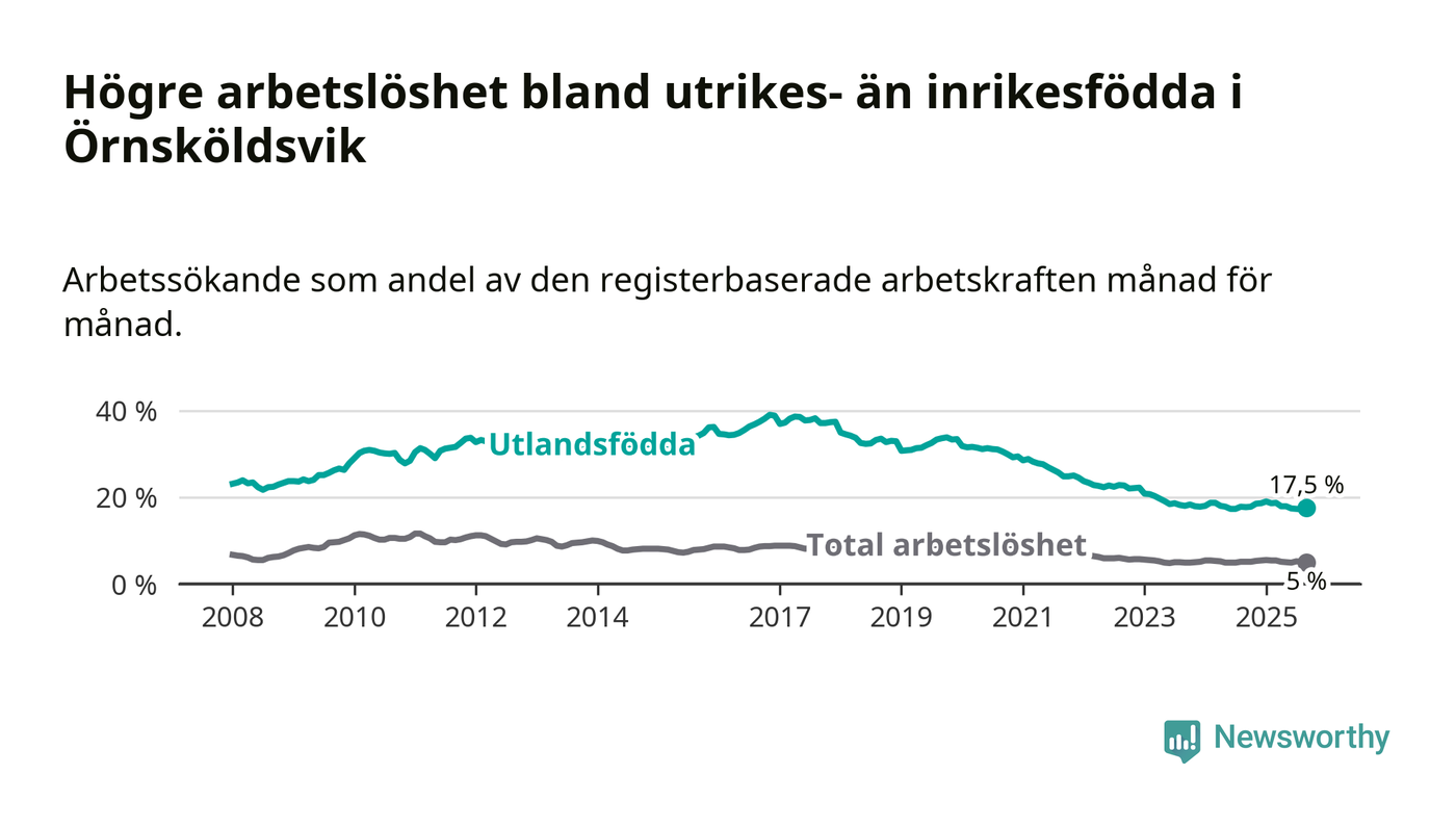 Arbetslösheten bland utlandsfödda var 17,5 procent i Örnsköldsvik under september månad, motsvarande 564 av 3 223 personer. Det är 0,2 procentenheter färre än vid samma tidpunkt i fjol (+8 om man räknar personer).