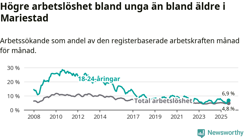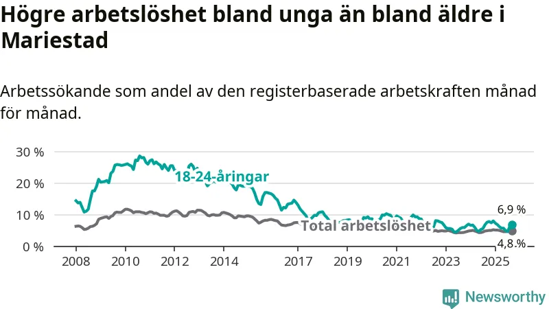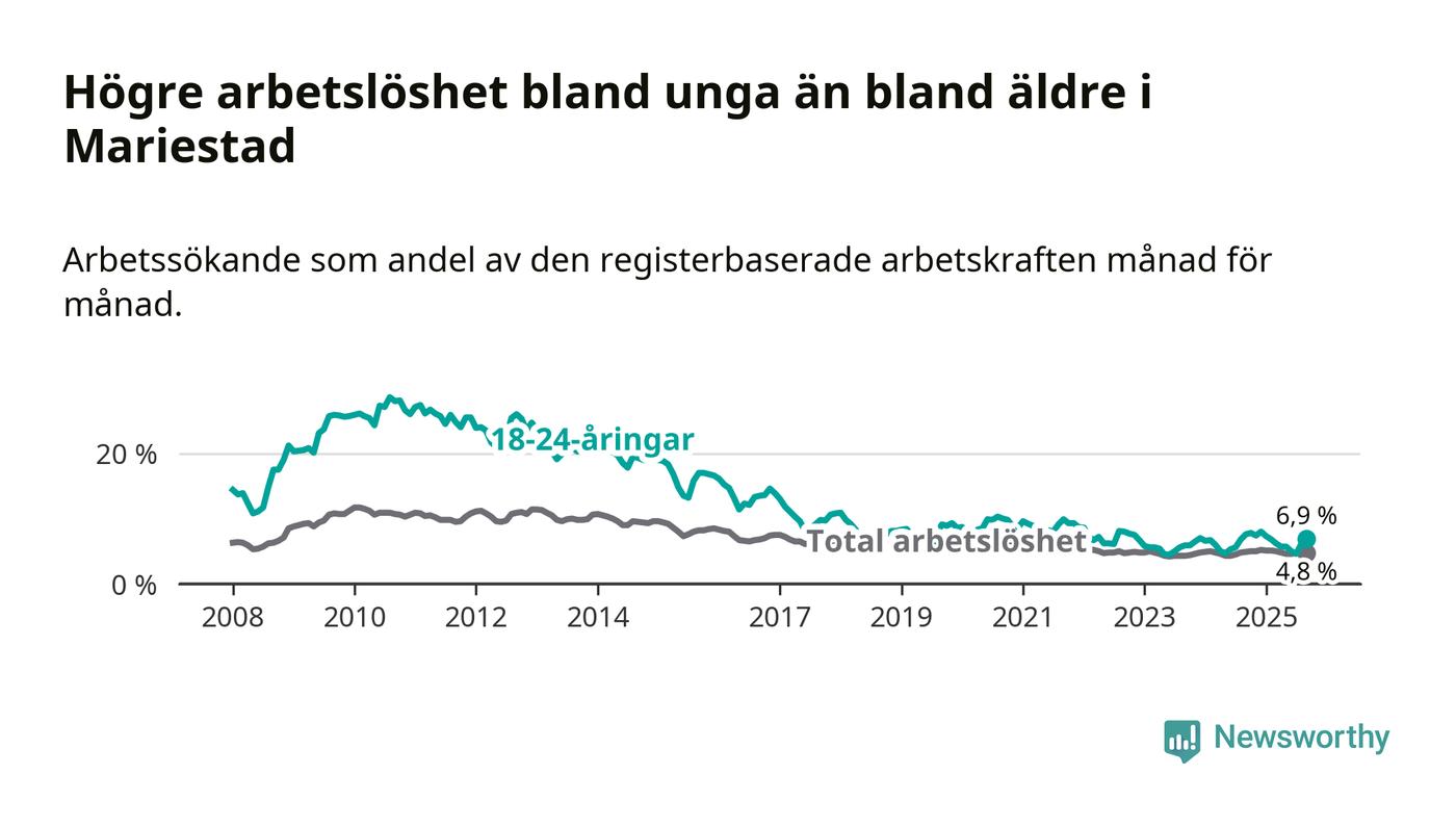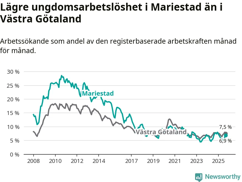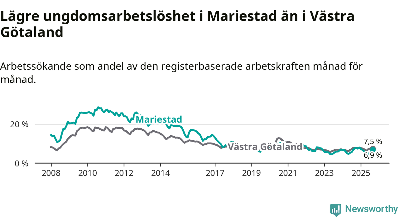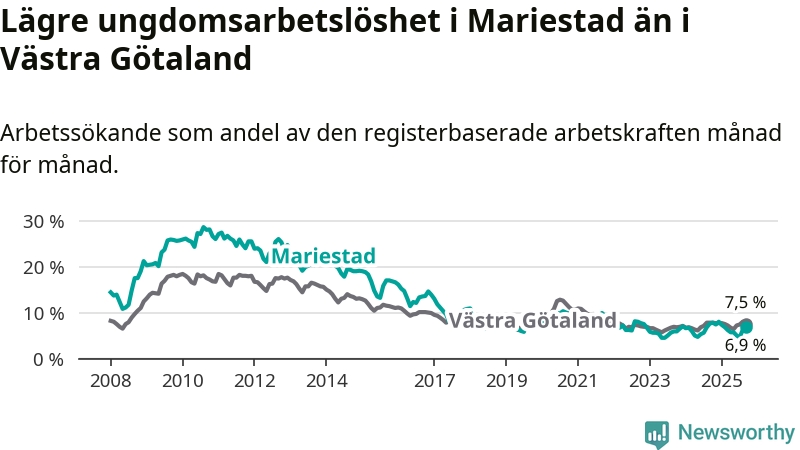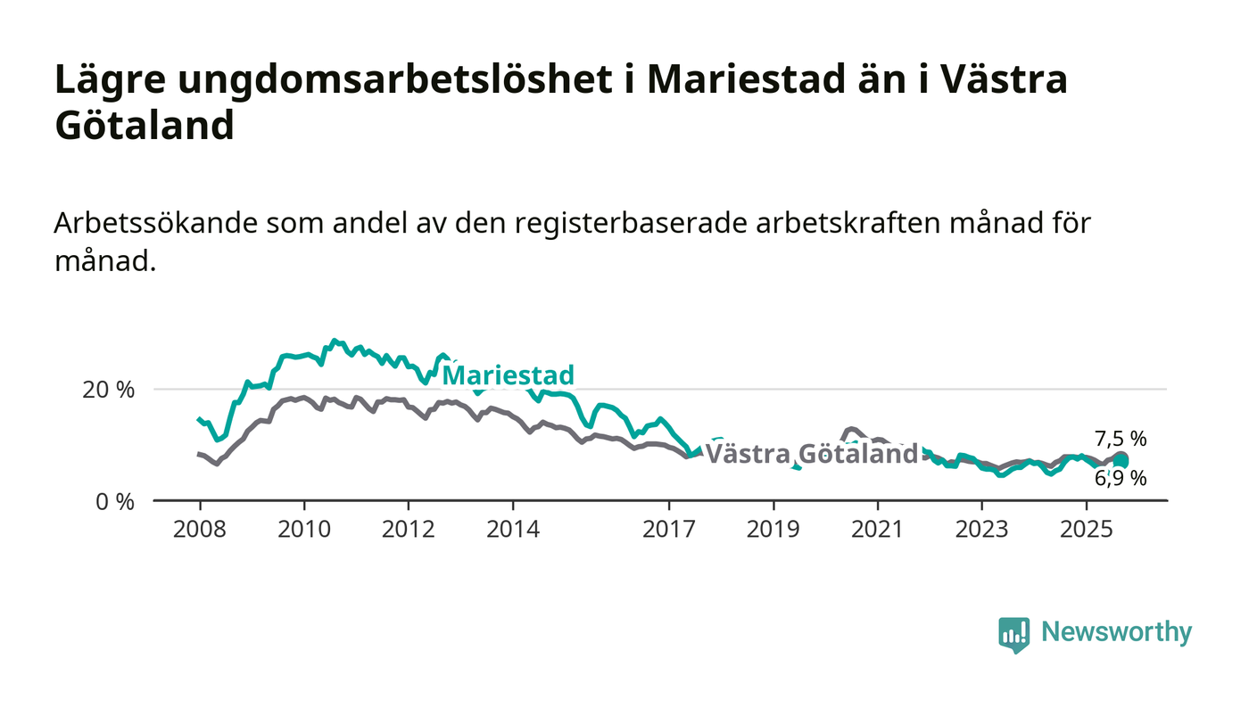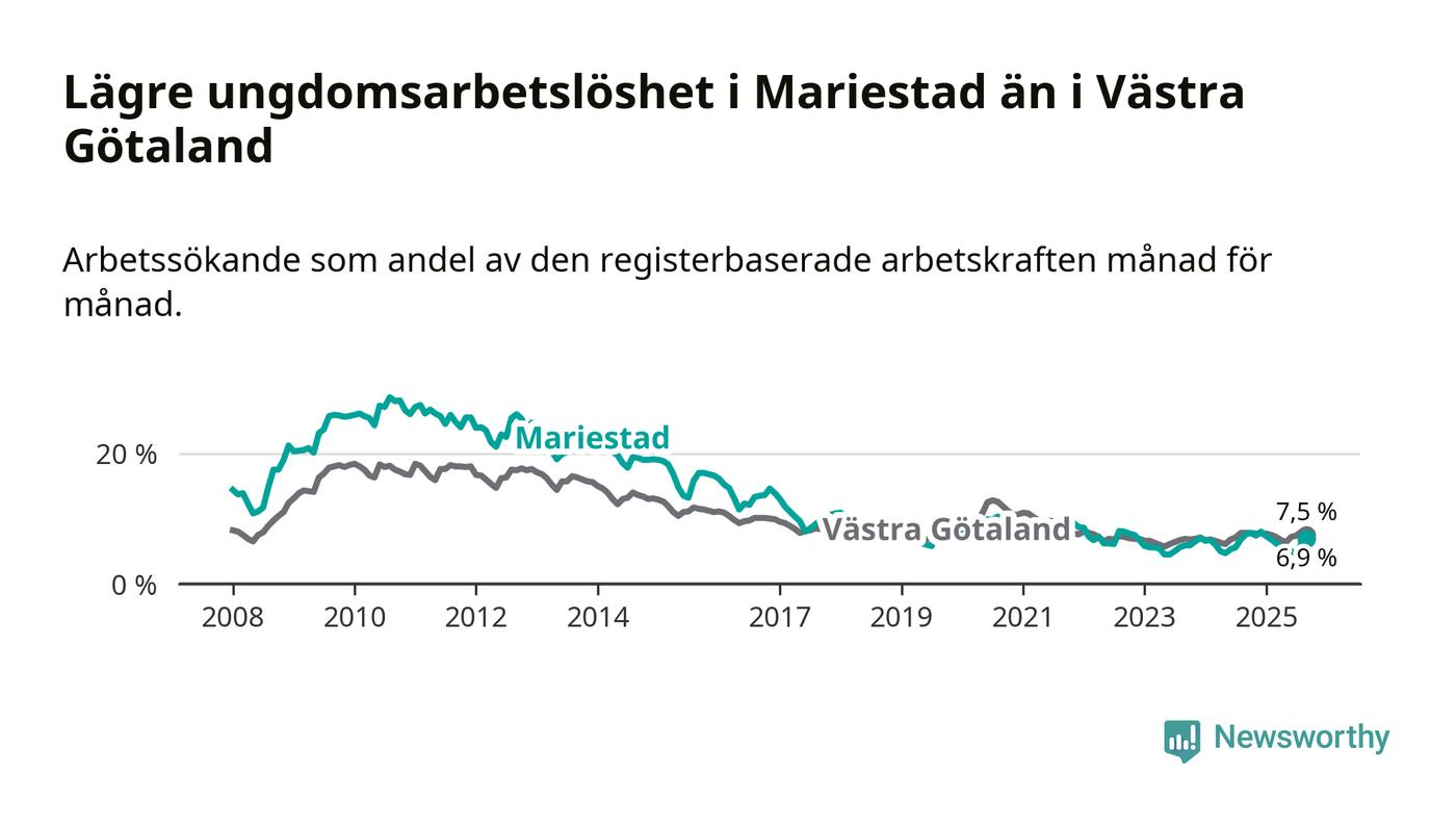 Precis som den totala arbetslösheten ligger ungdomsarbetslösheten i Mariestad lägre än i Västra Götaland som helhet. Skillnaden mellan kommunen och länet är 0,6 procentenheter.