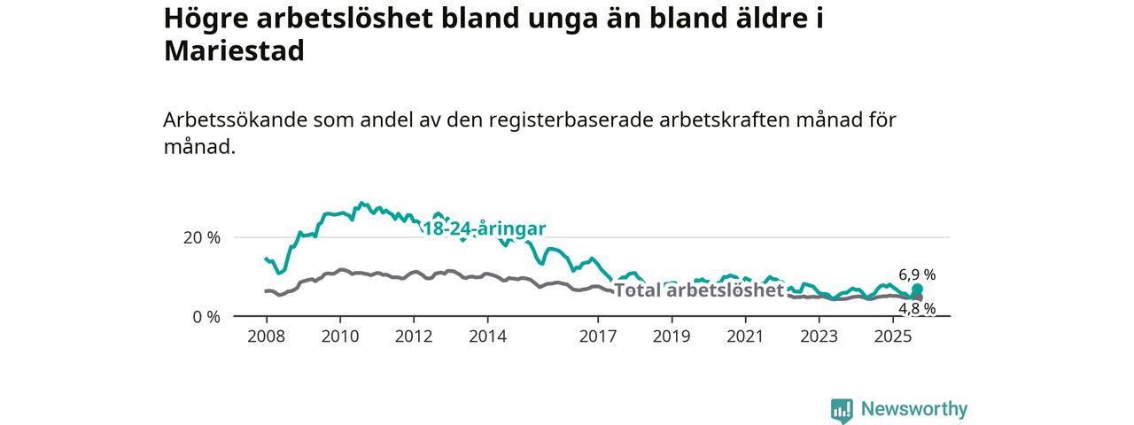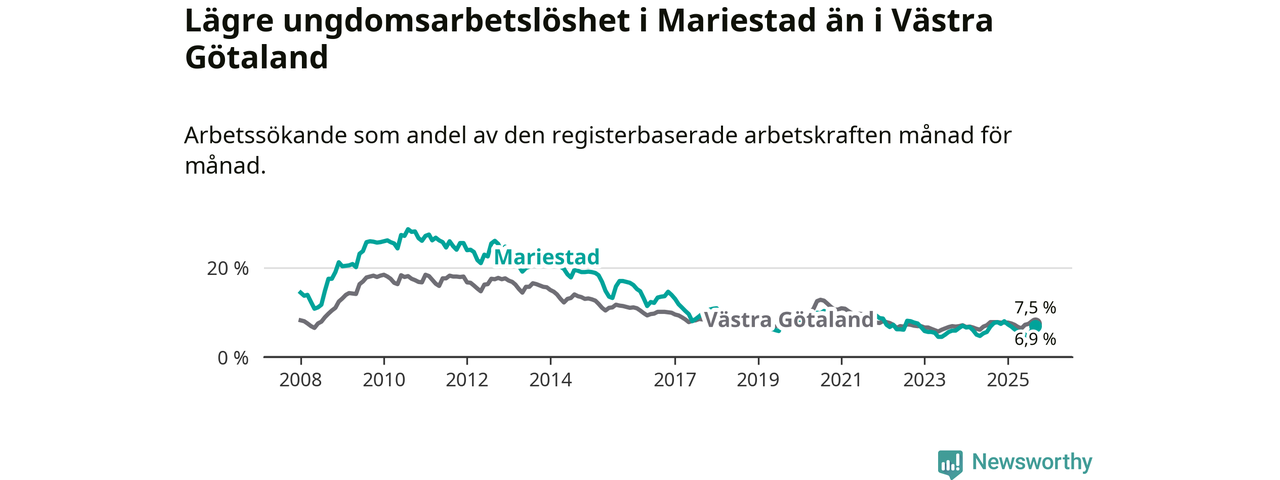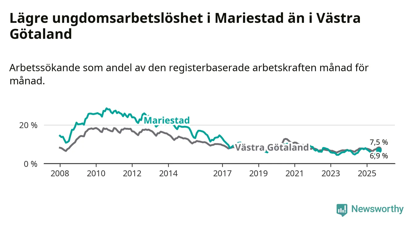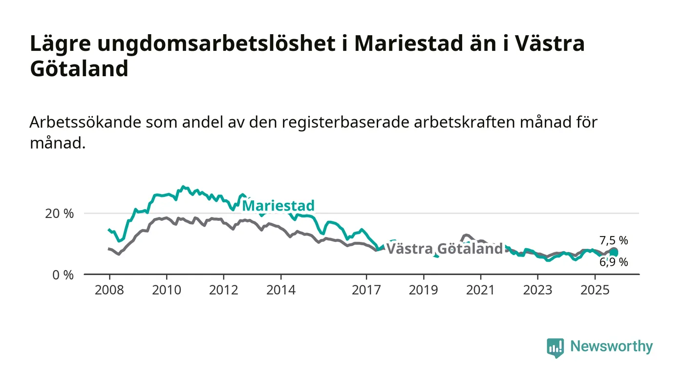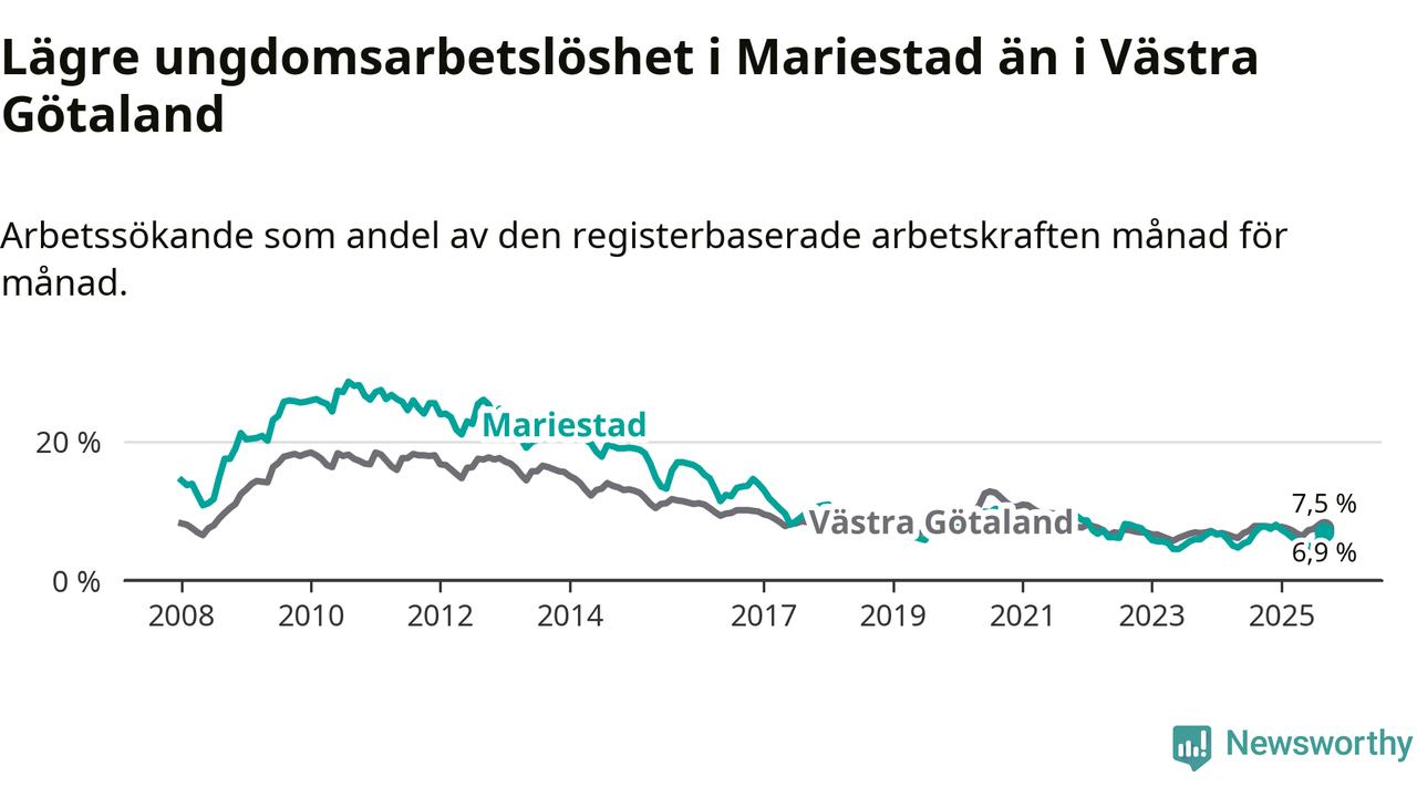 Graf: Arbetslöshet bland unga i Mariestads kommun och Västra Götalands län