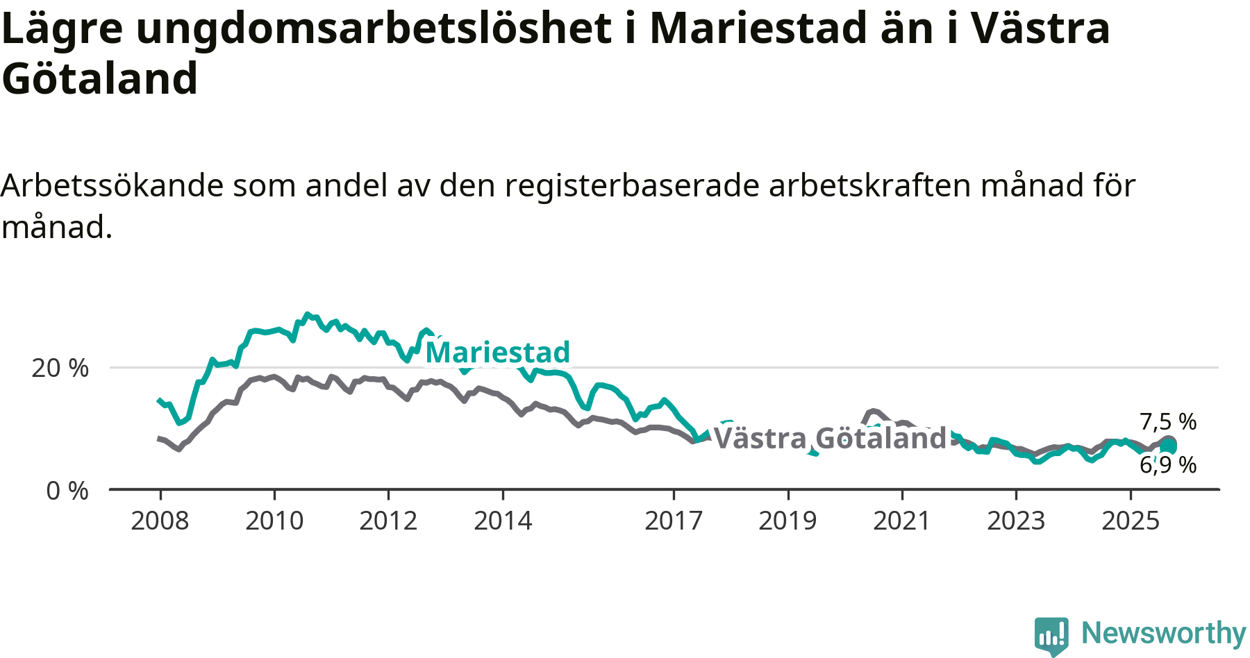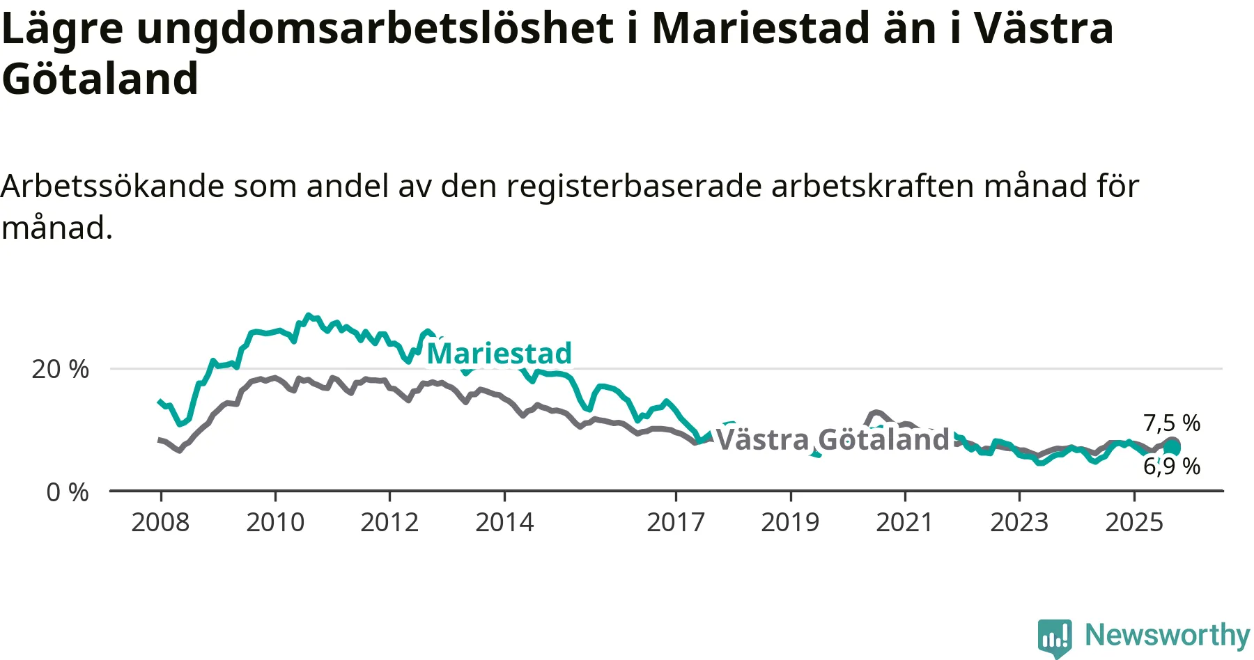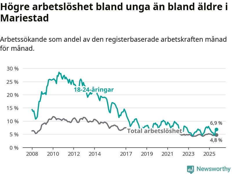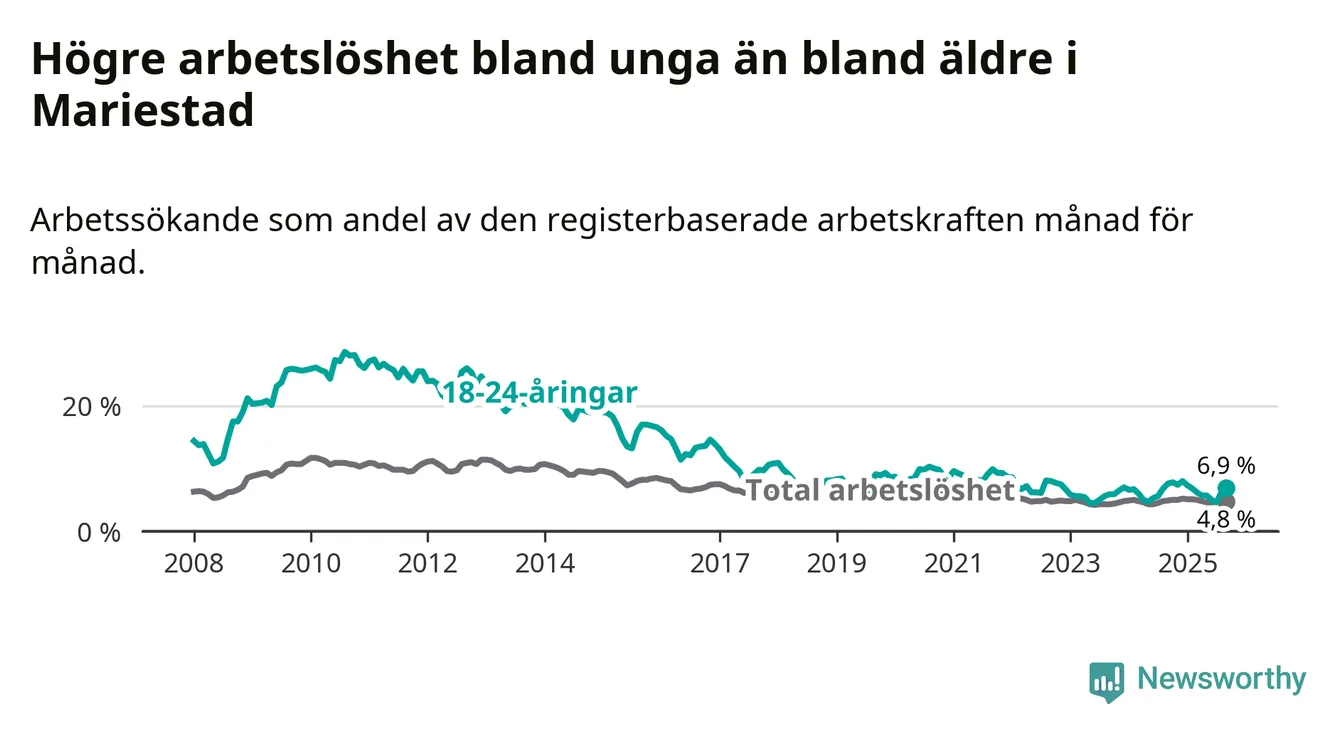 Graf: Arbetslöshet bland unga i Mariestads kommun och Västra Götalands län