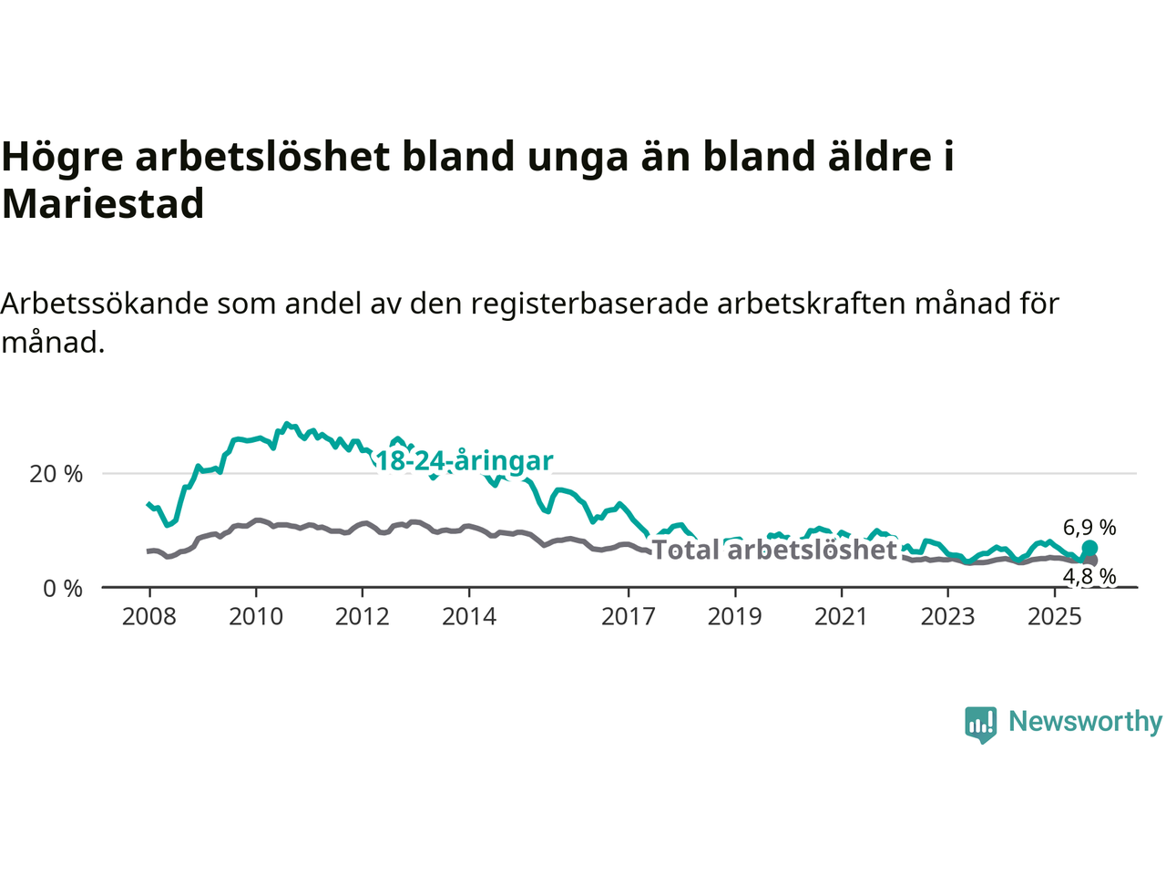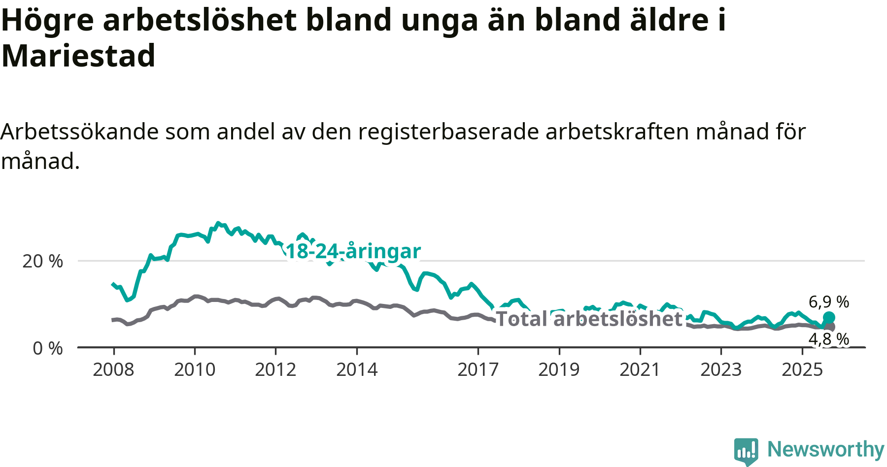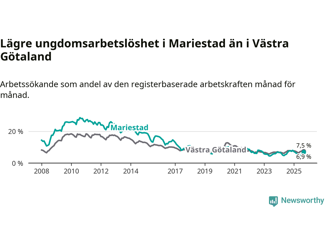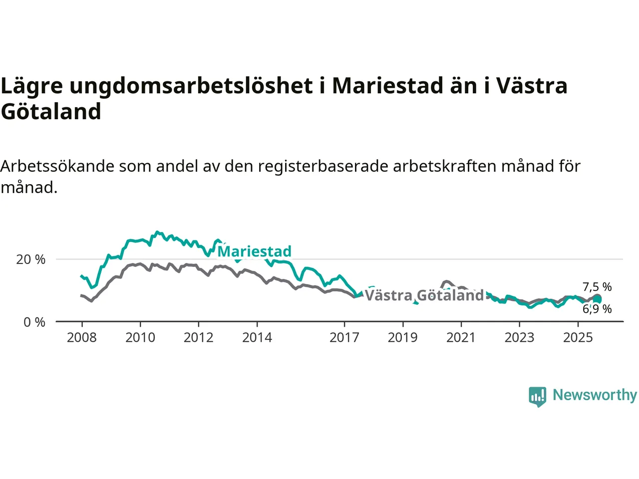 Graf: Arbetslöshet bland unga i Mariestads kommun och Västra Götalands län